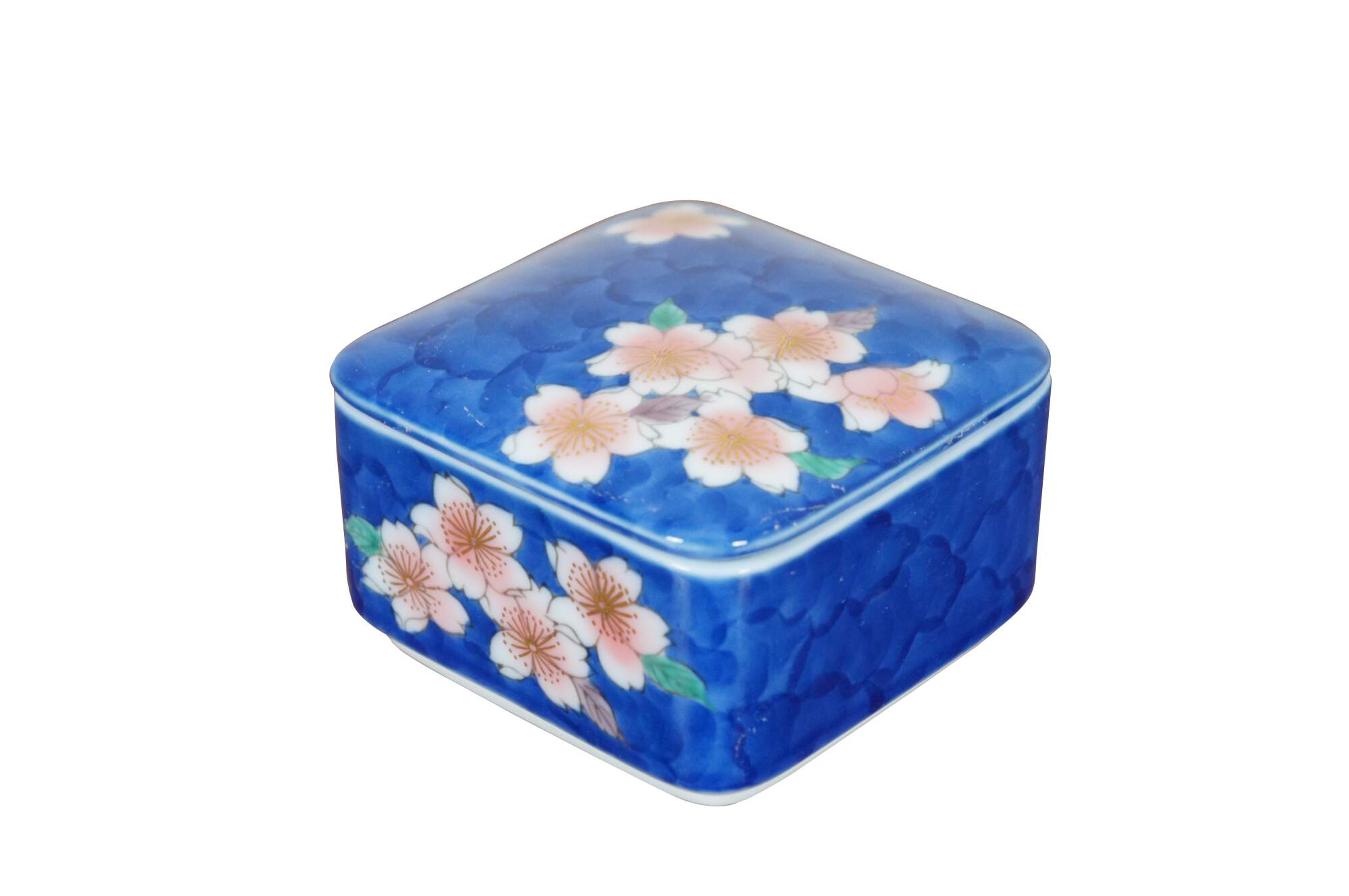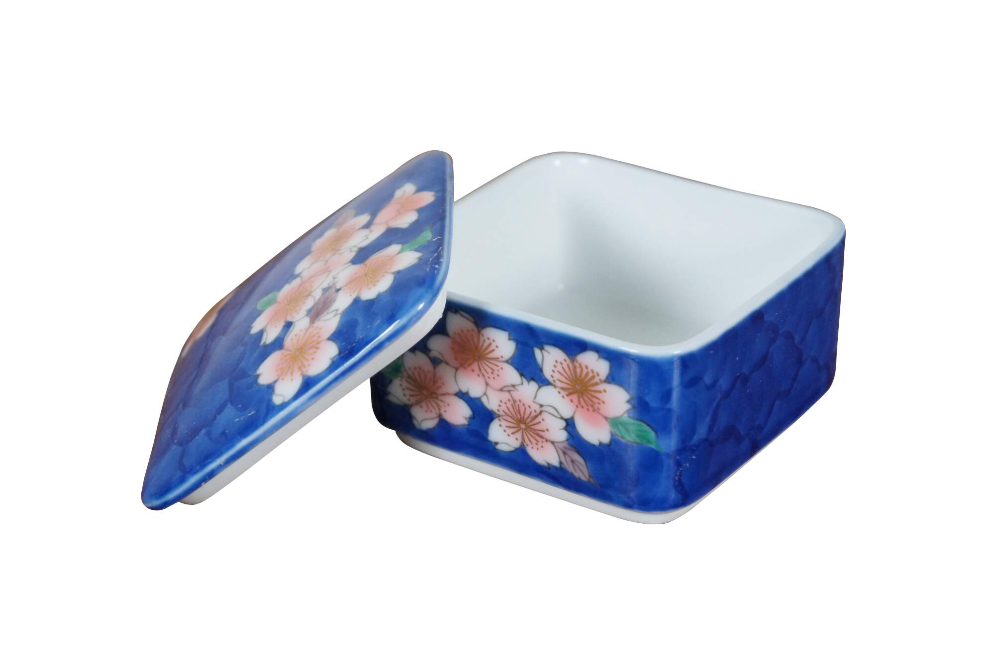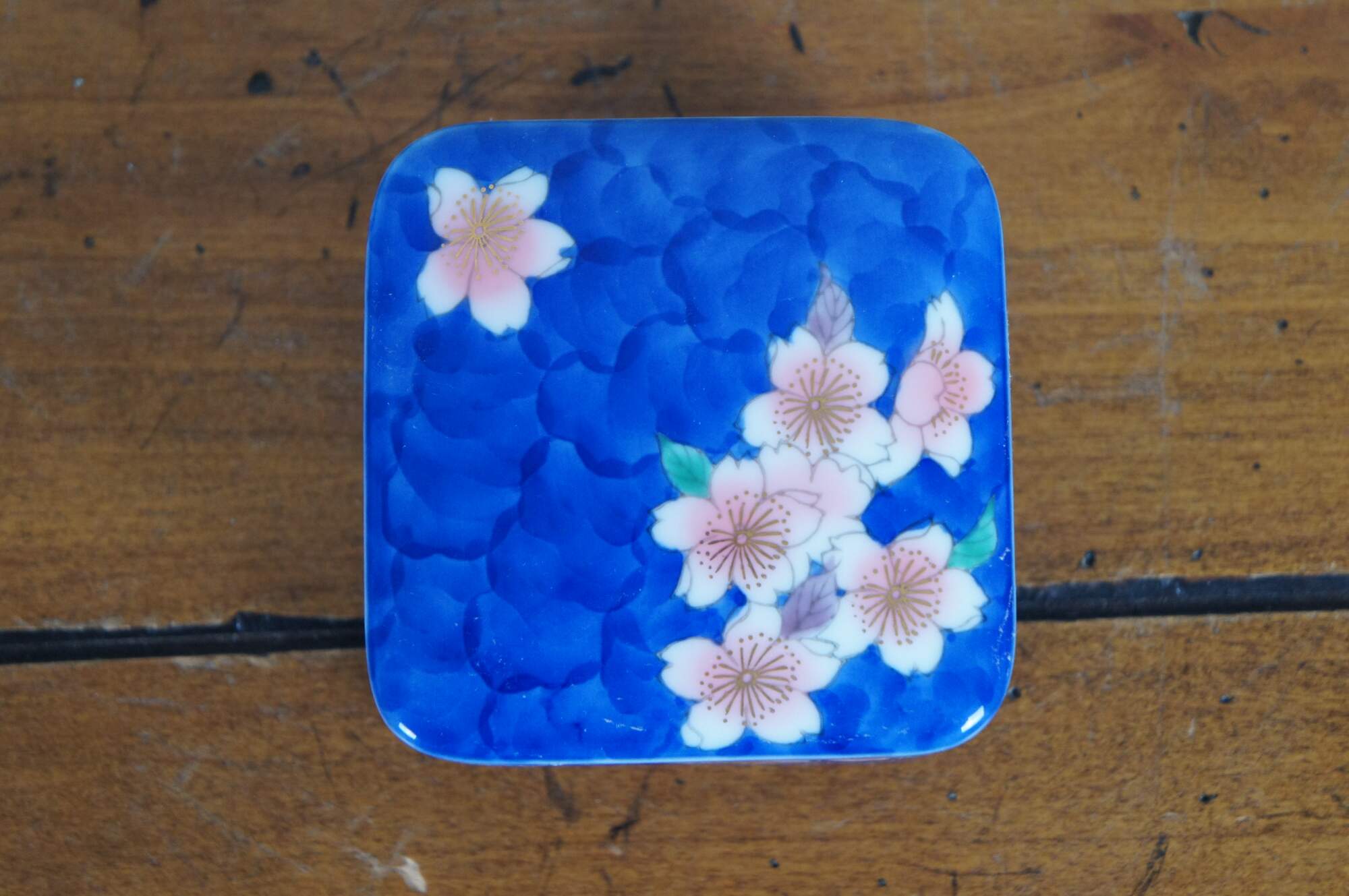 Vintage hand painted porcelain trinket box. Rounded square form with pink water lilies / lotus flowers accented with gold stamens and green leaves on a backdrop of blue water. Mark used circa 1900-1920.