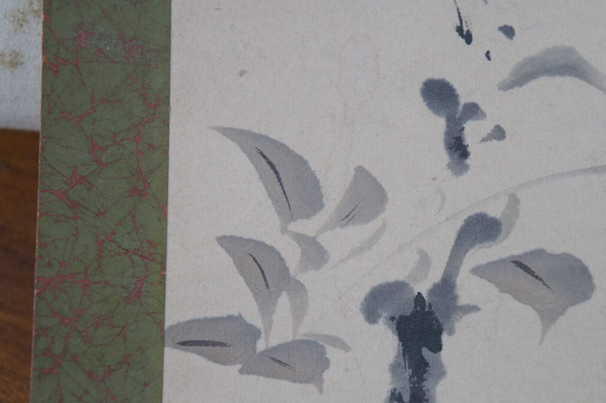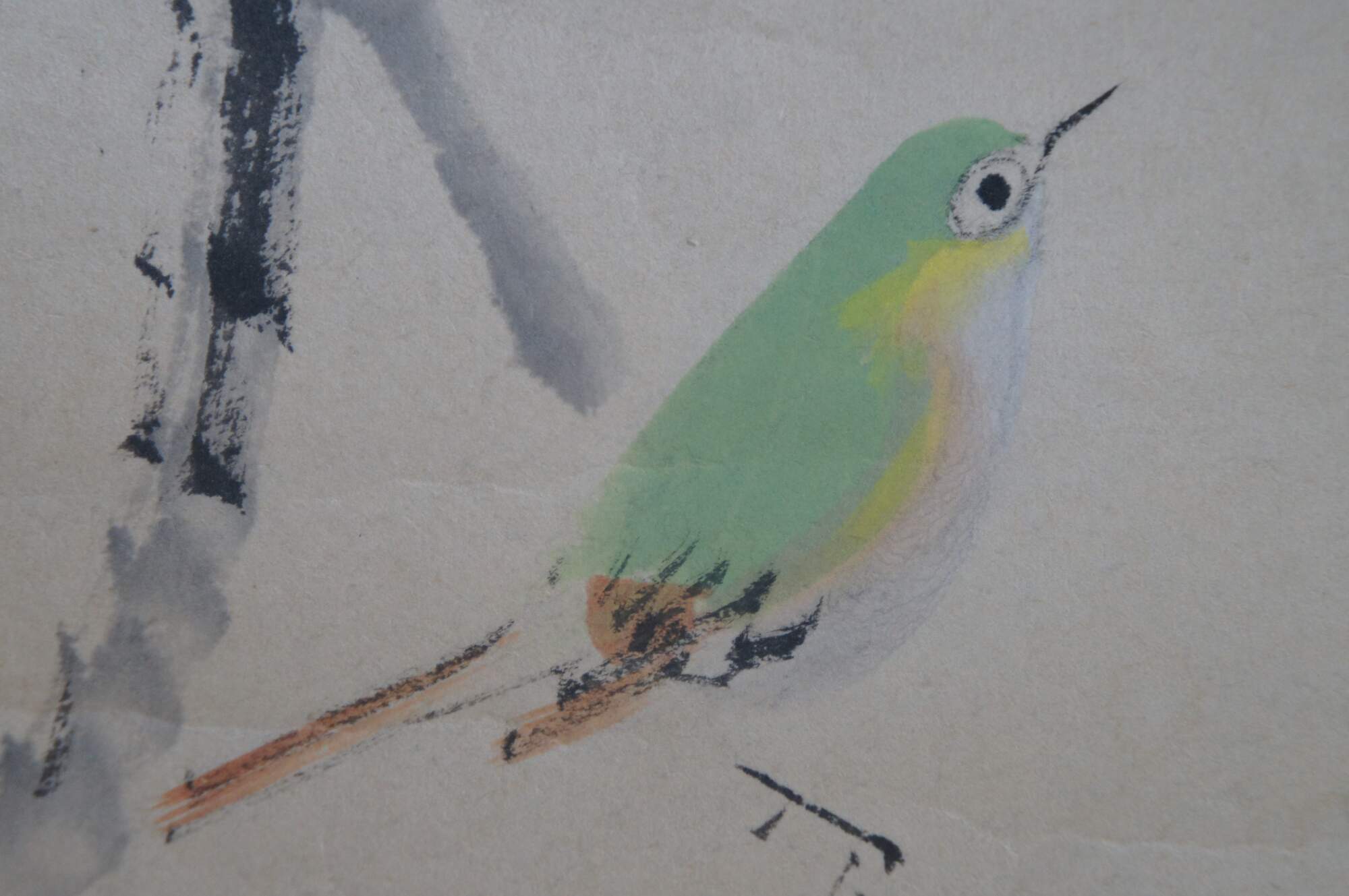 Antique Japanese watercolor painting on paper showing a small green bird perched on the branch of a tree tipped with red berries. Signed along left hand side. Mounted on a green and gold marbled paper scroll.
