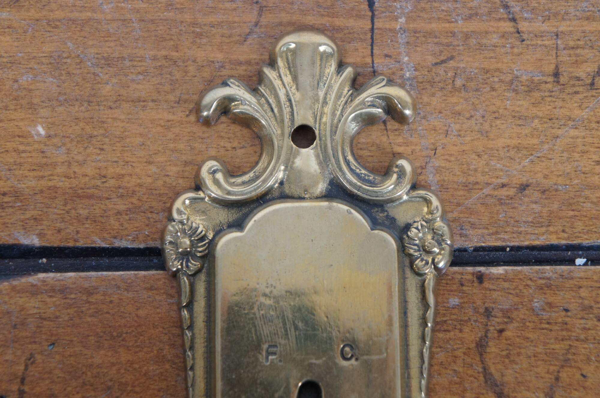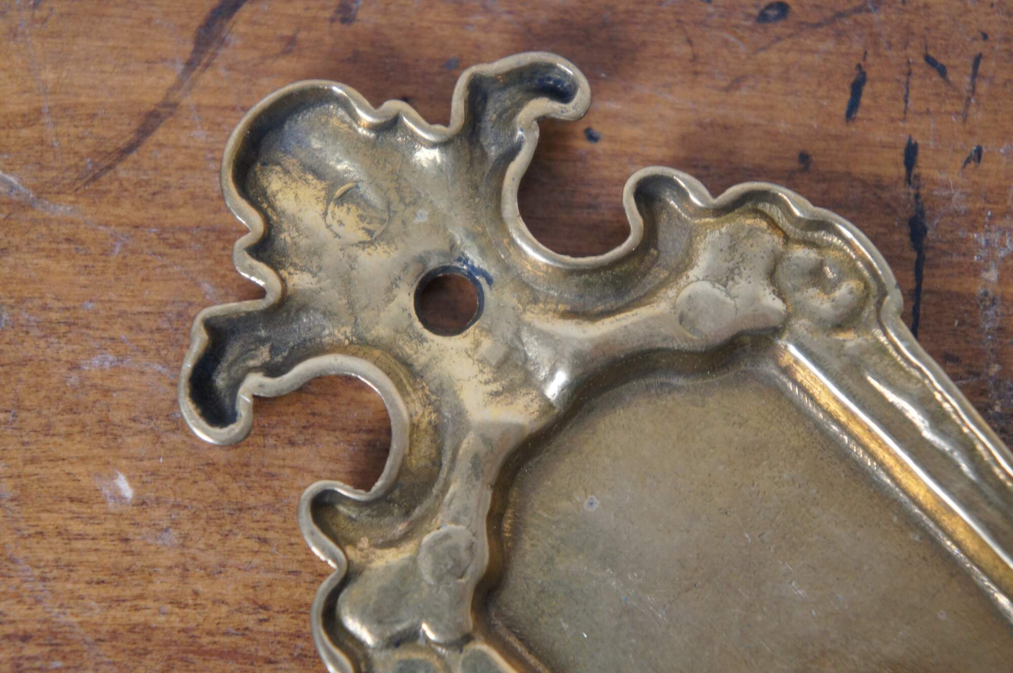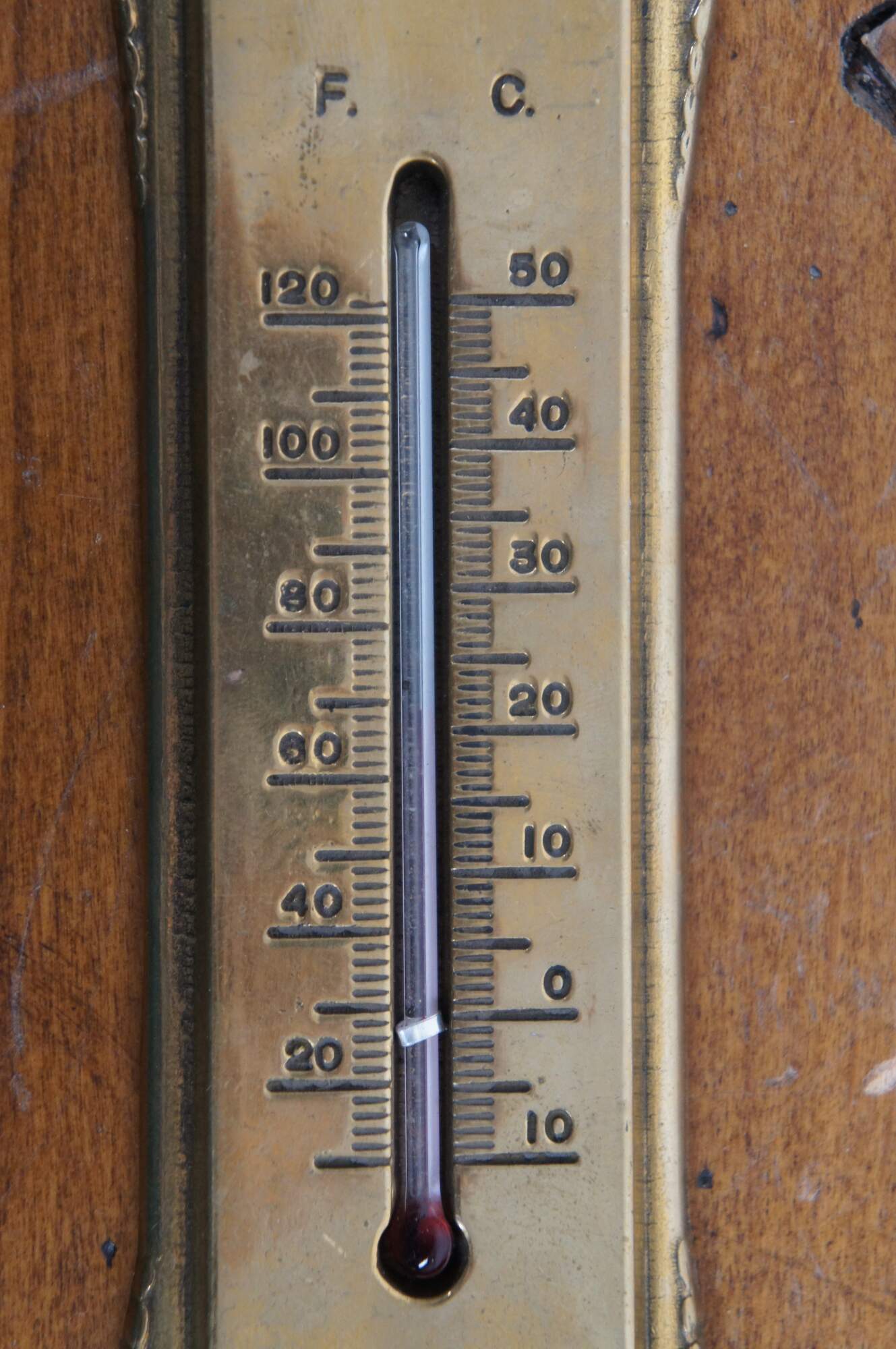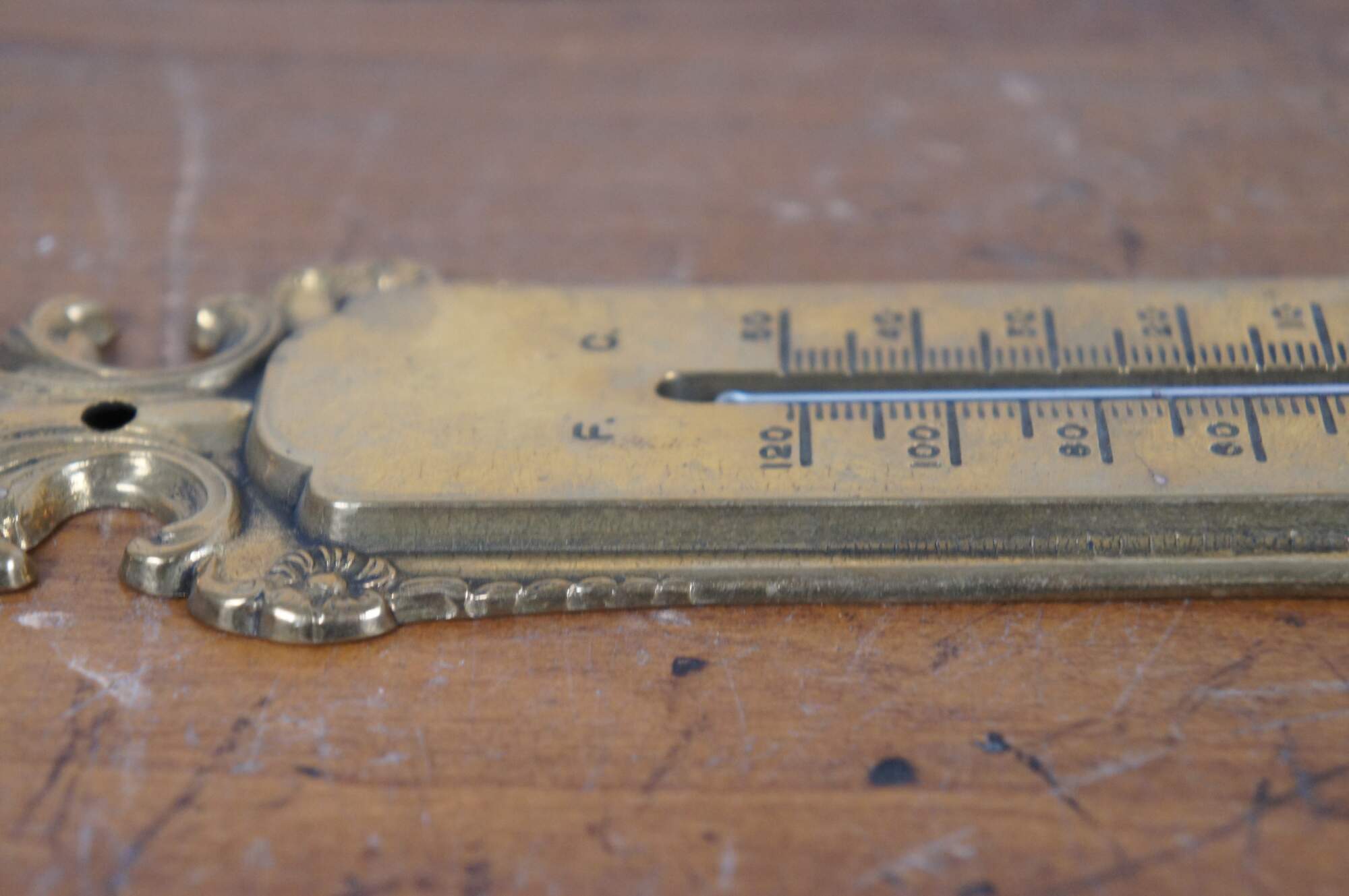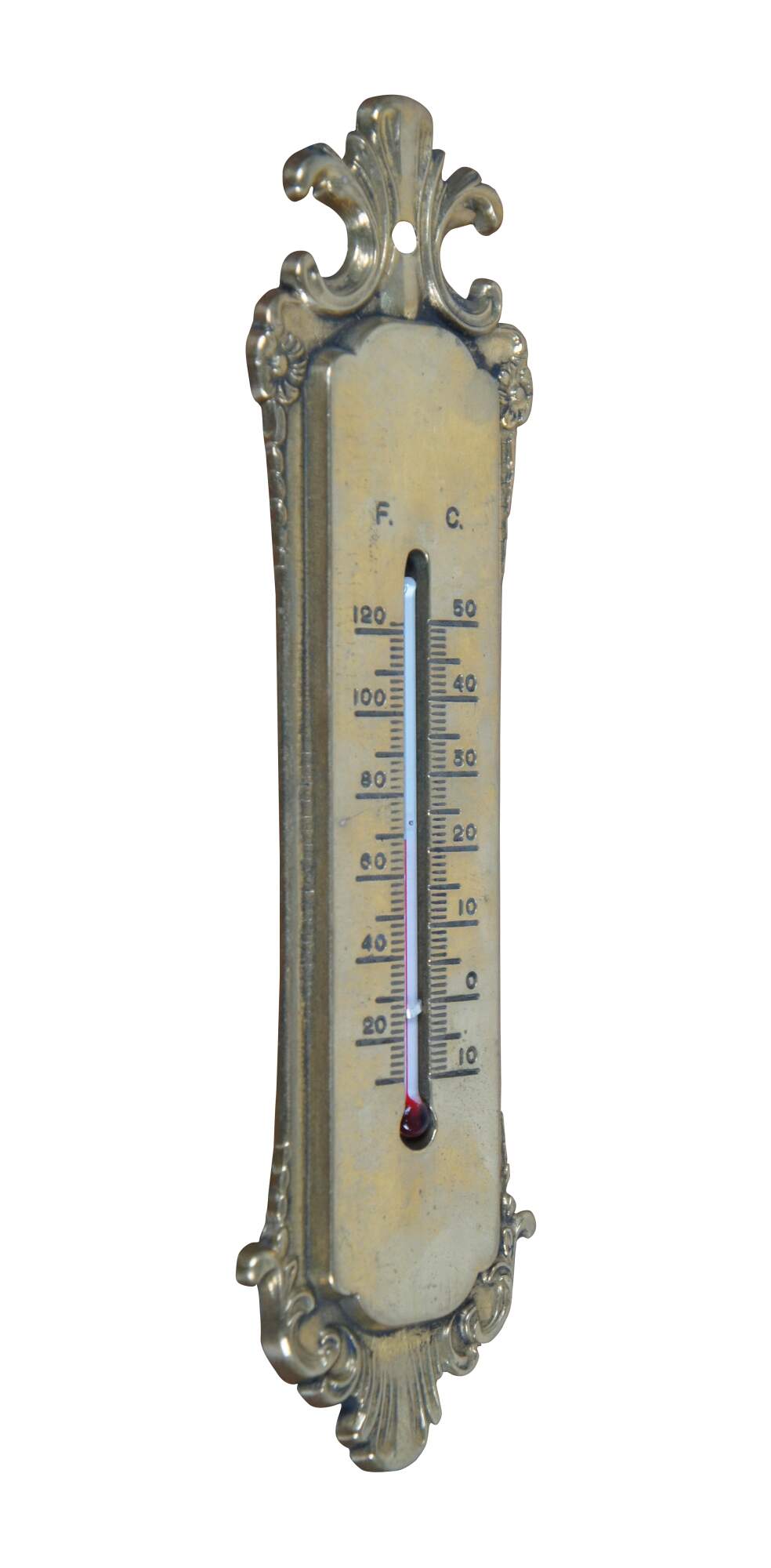 Late 19th century Victorian brass wall hanging thermometer. Simple art nouveau styling with scallops and flowers. Indicates temperatures up to 120 degrees Fahrenheit and 50 degrees Celsius with standard red-dyed alcohol filled glass bulb.