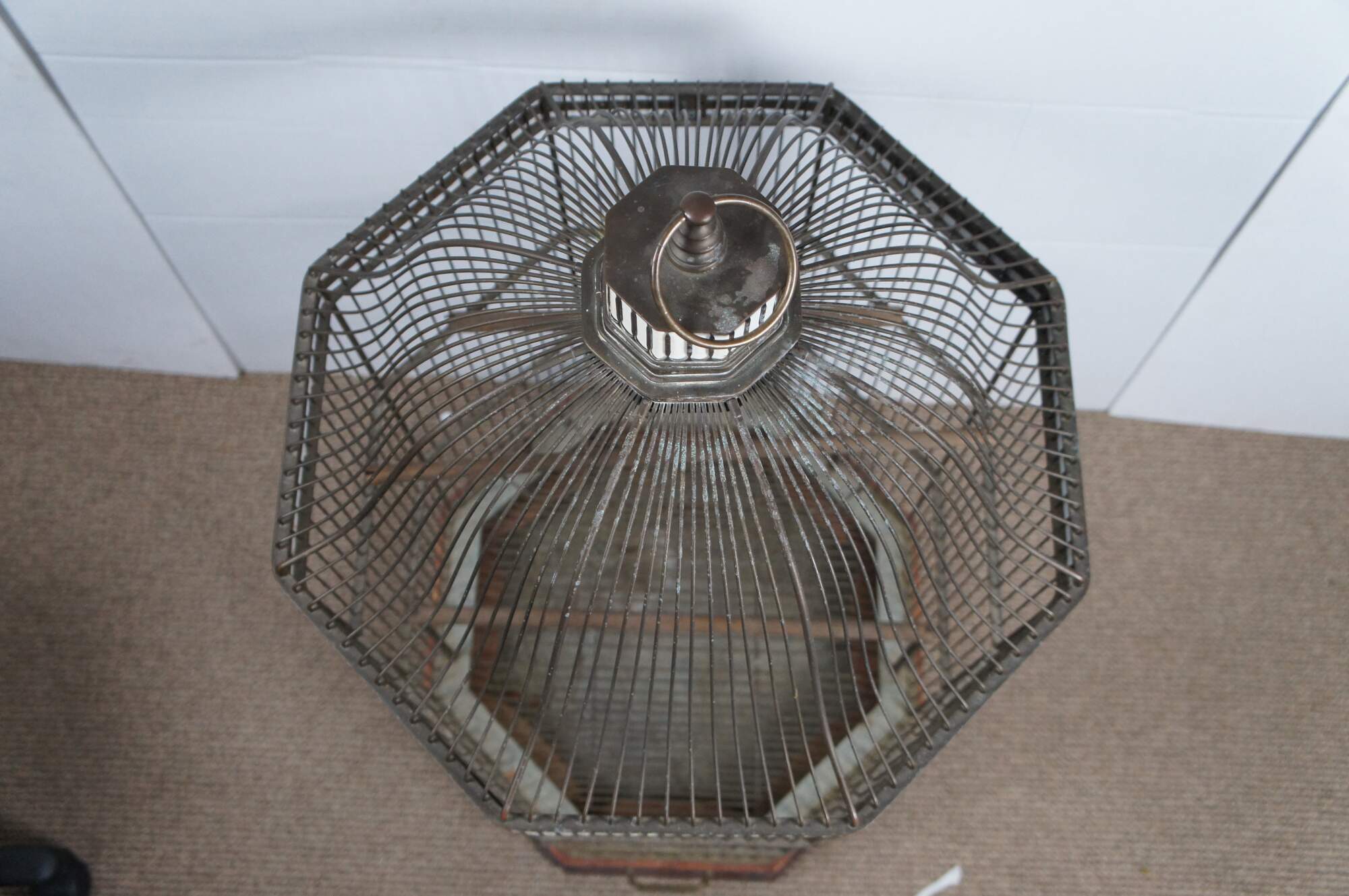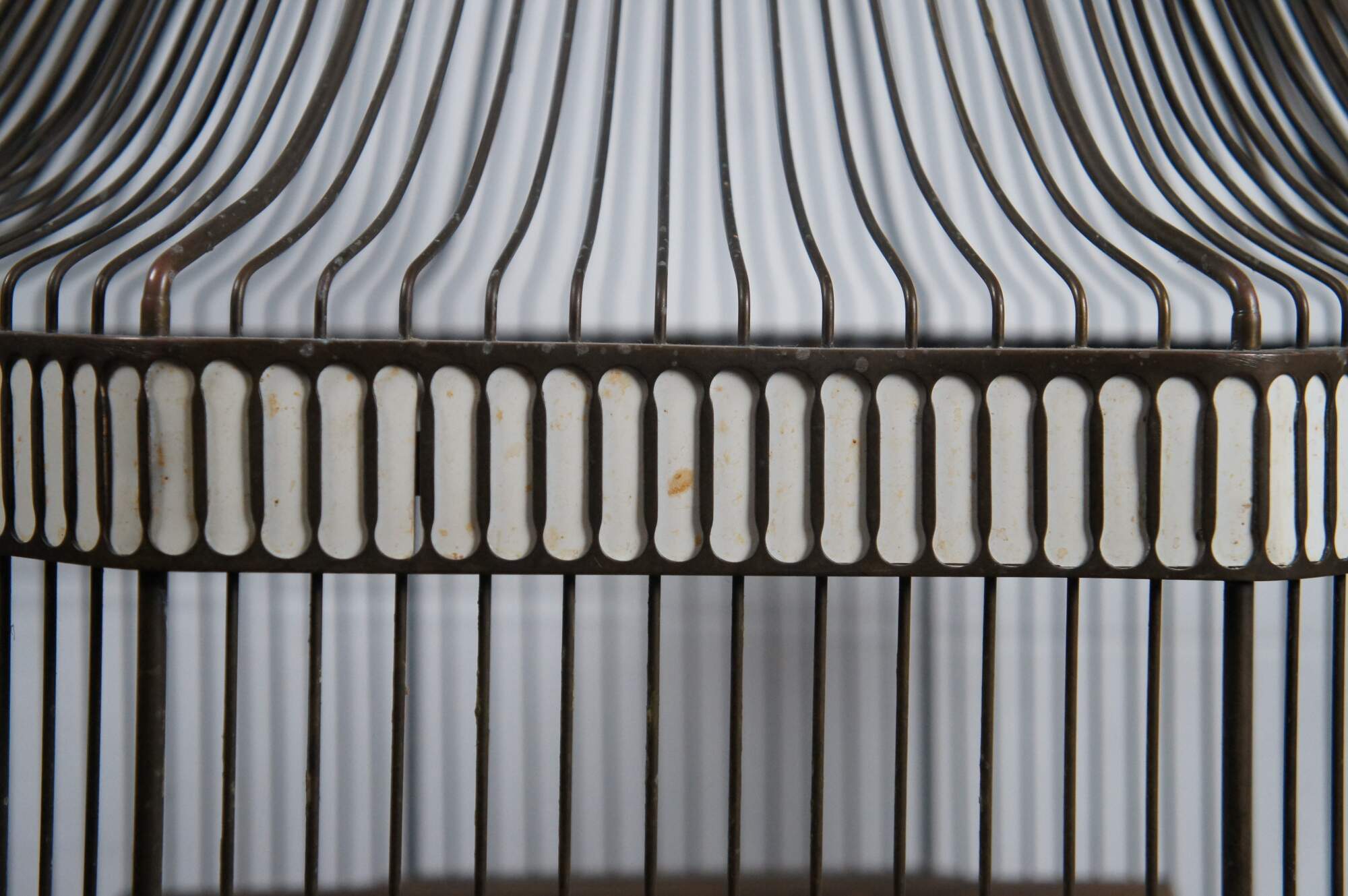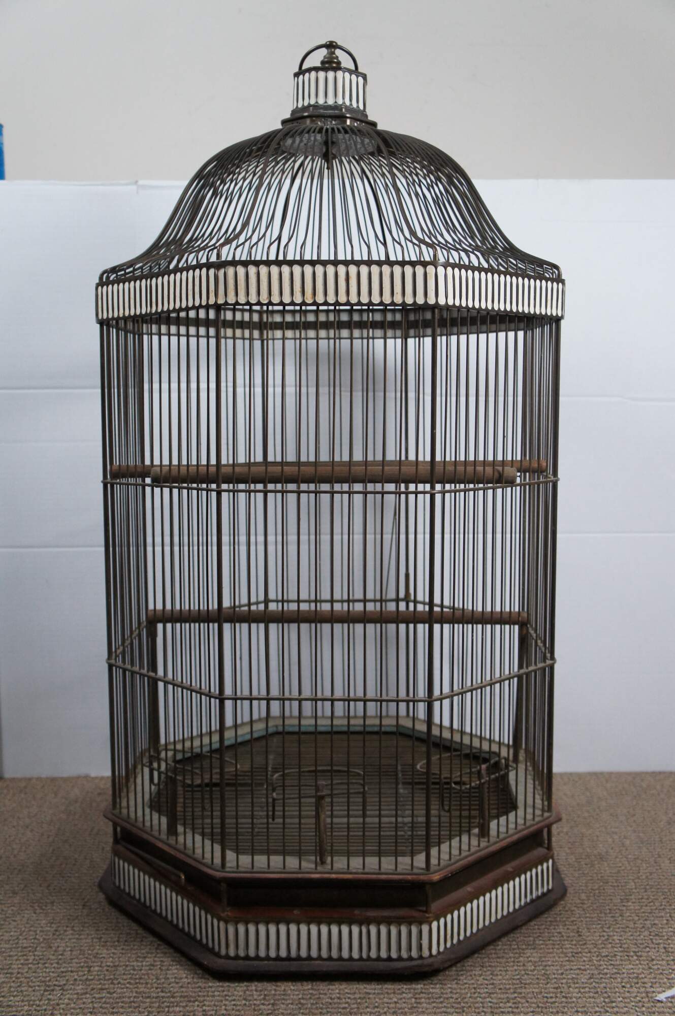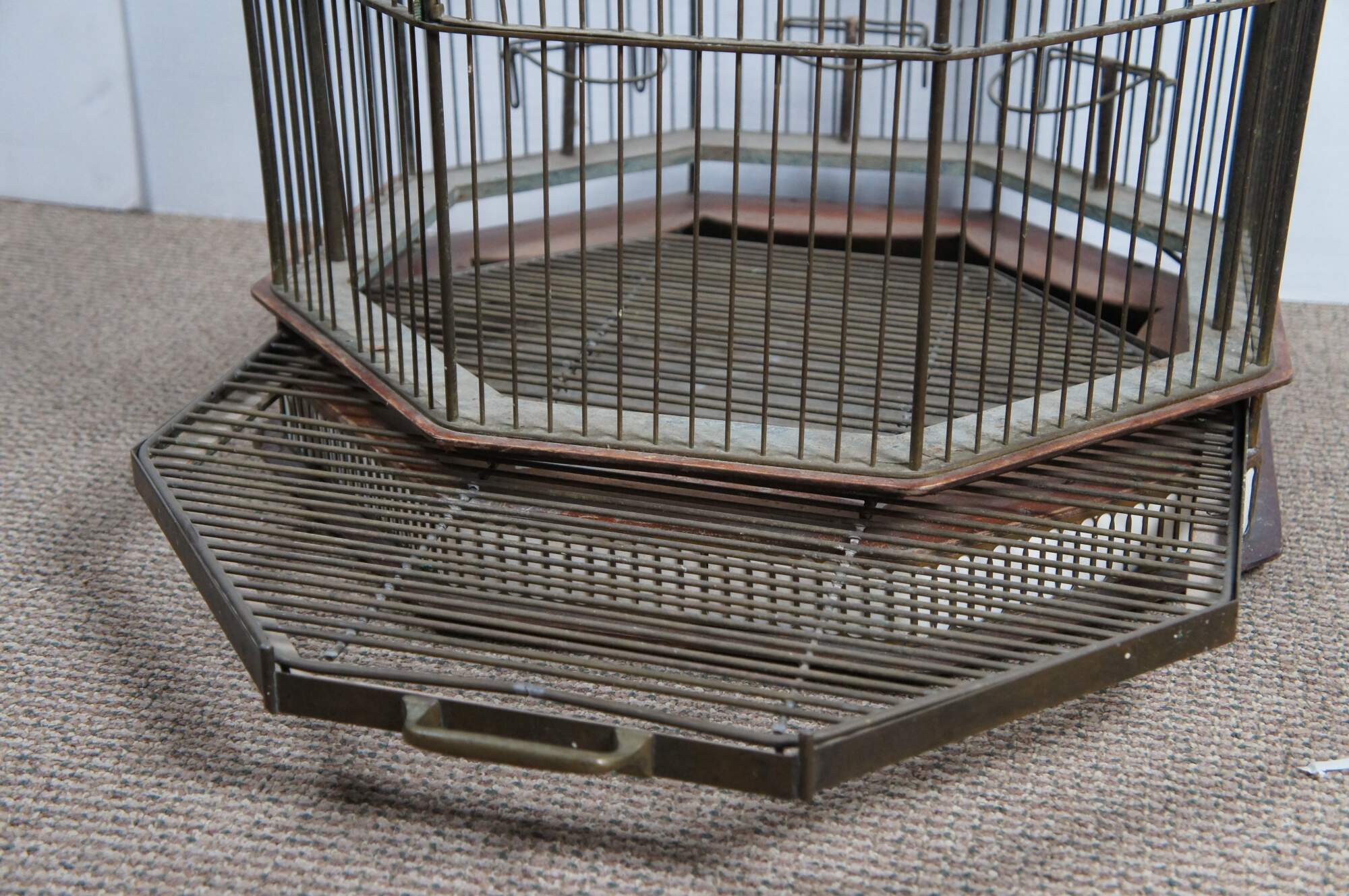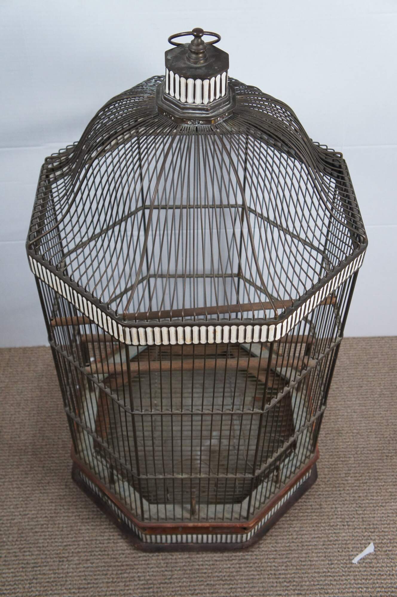 An impressive rare and monumental antique hanging brass bird cage. Octagonal form with dome top, three wooden perches (two movable), three dish stands, and removable lower grate. White inlaid bands around base, below dome, and around cupola.