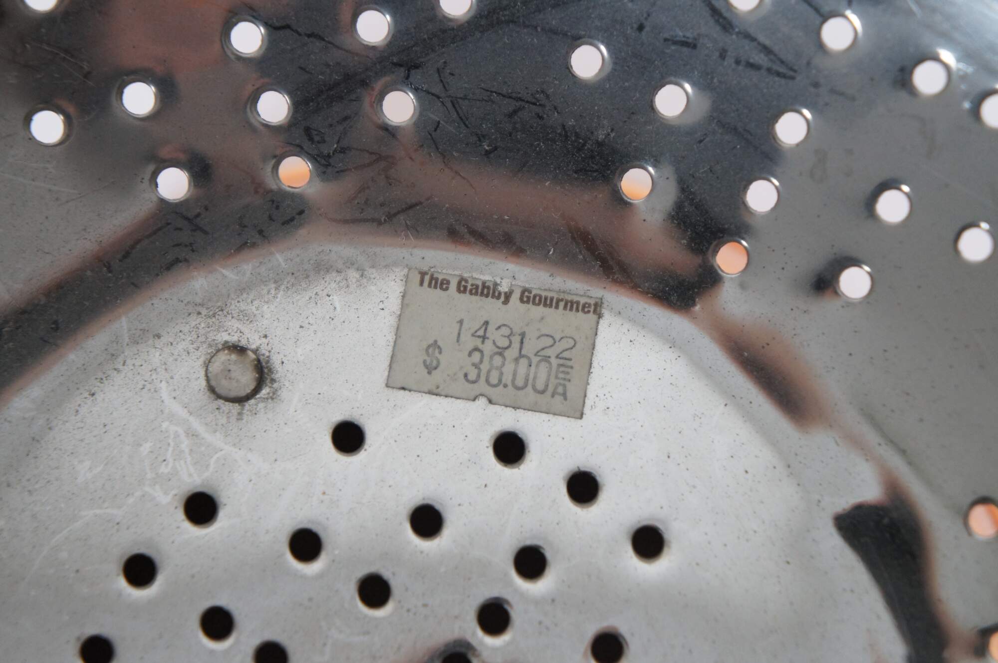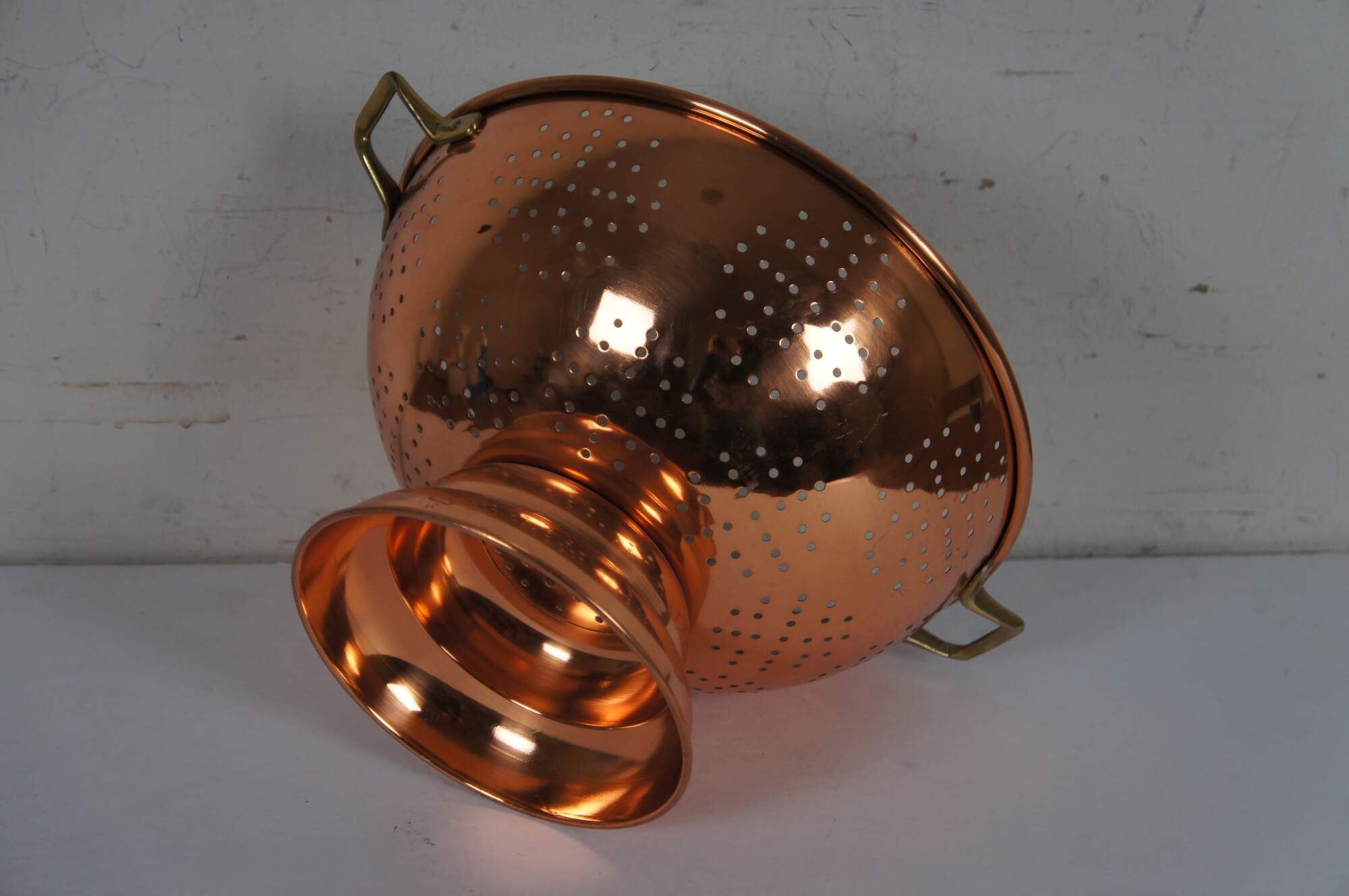 Mid to late 20th century copper, brass and stainless steel colander / strainer with brass handles. Originally purchased at The Gabby Gourmet. Made in Korea.