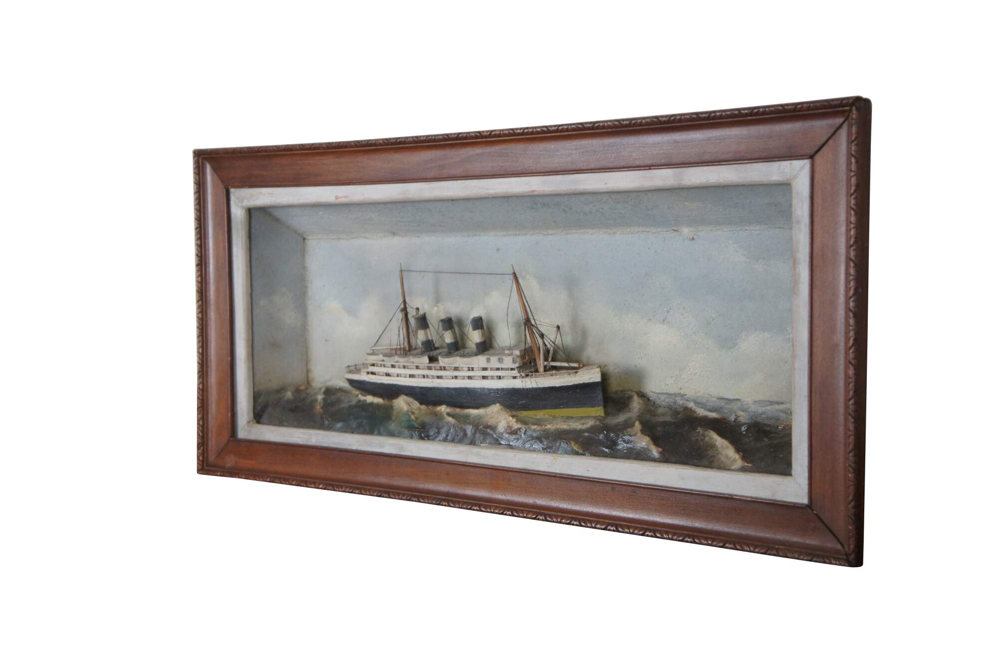 Antique three dimensional folk art diorama portraying a steam boat / oceanliner / ship on a choppy sea. The model is set in a rectangular shadowbox with white trim and brown wood frame with carved border.