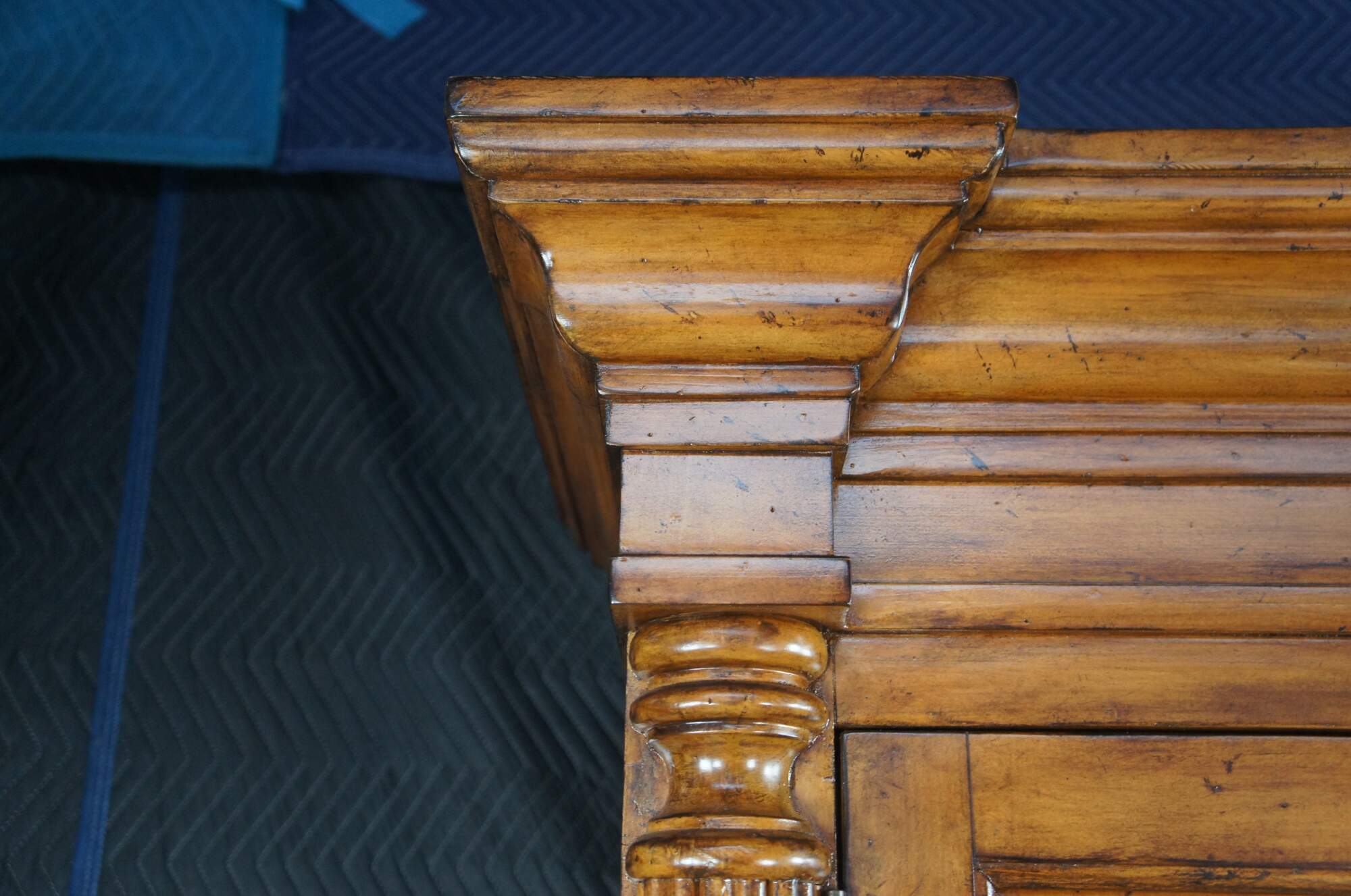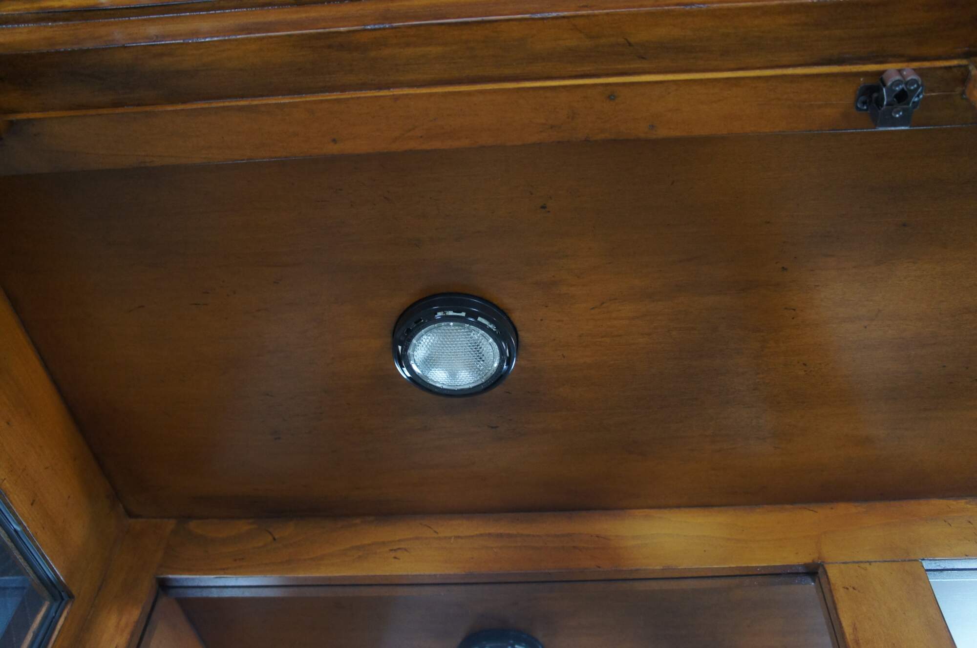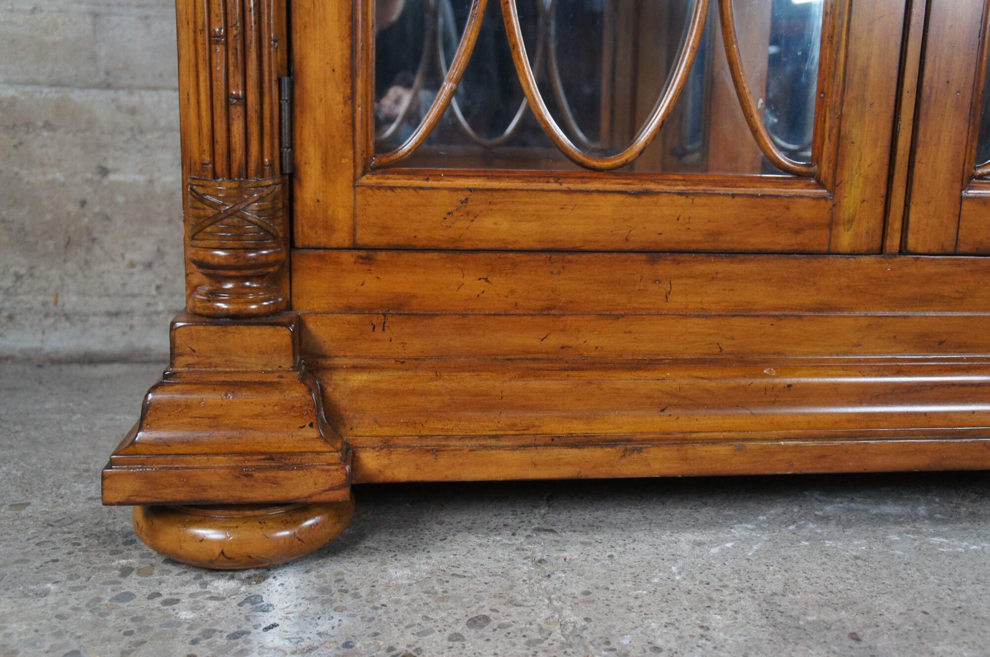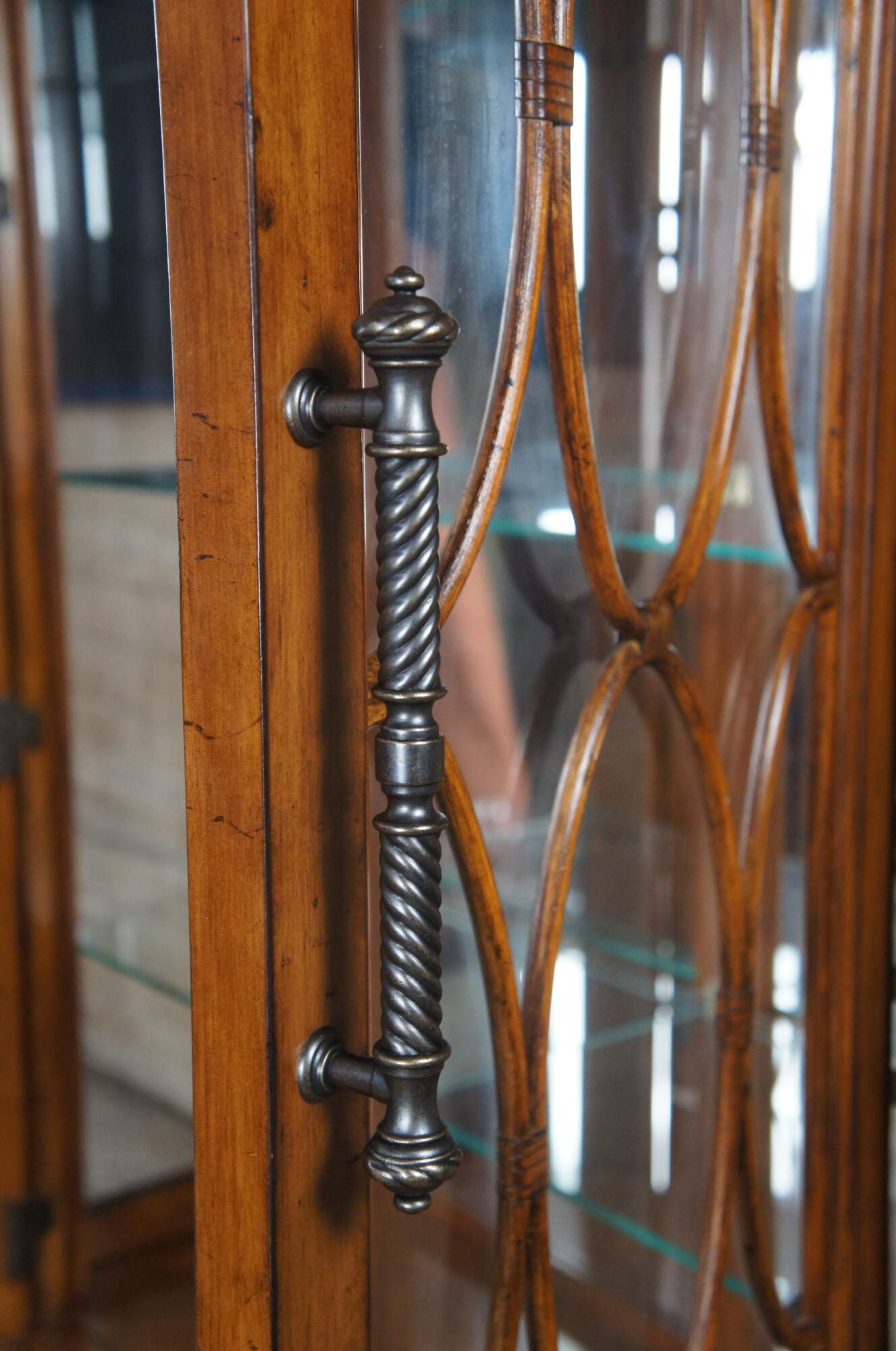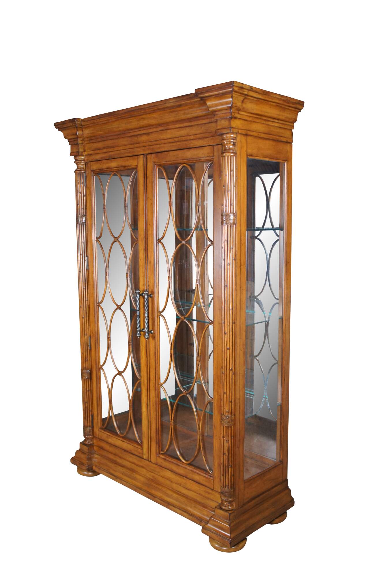 Vintage Tommy Bahama Maple Island Estate Mariana display curio china cabinet featuring decorative bamboo and rattan fretwork with six adjustable glass shelves, mirrored back, and lighted interior.