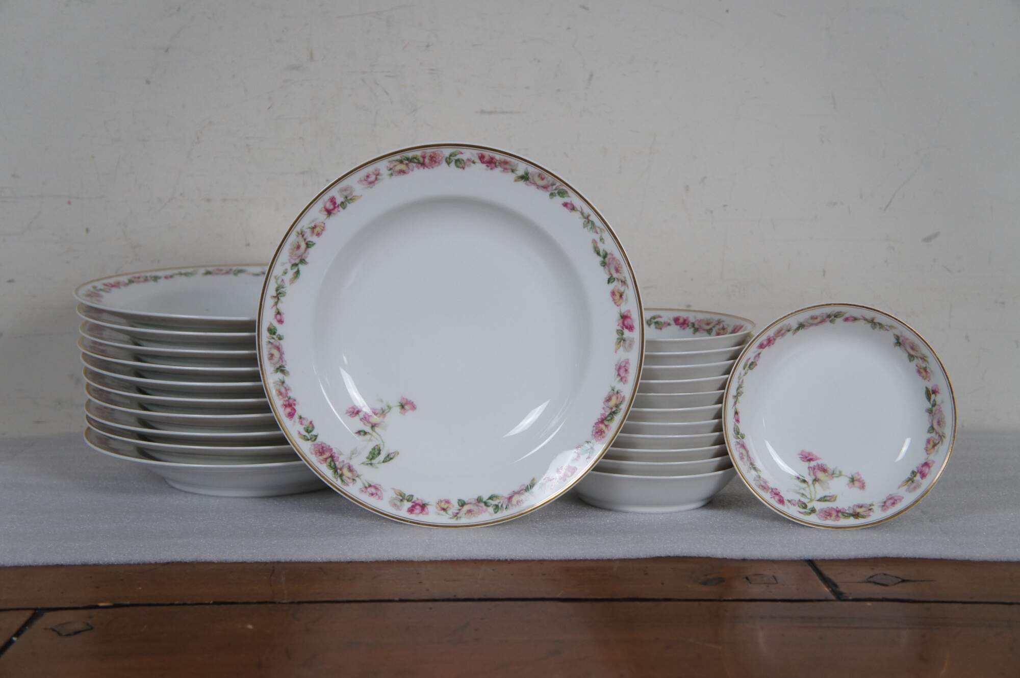 A large and impressive antique 106 piece set of Limoges porcelain dinnerware produced by Haviland & Company in The Amstel pattern (aka Schleiger, number 497A), for the Jones, McDuffie and Stratton Company. Pattern features double lined gilt edges and a pink rose garland border, with one spray spilling down the side of each piece. Service for 8-10.