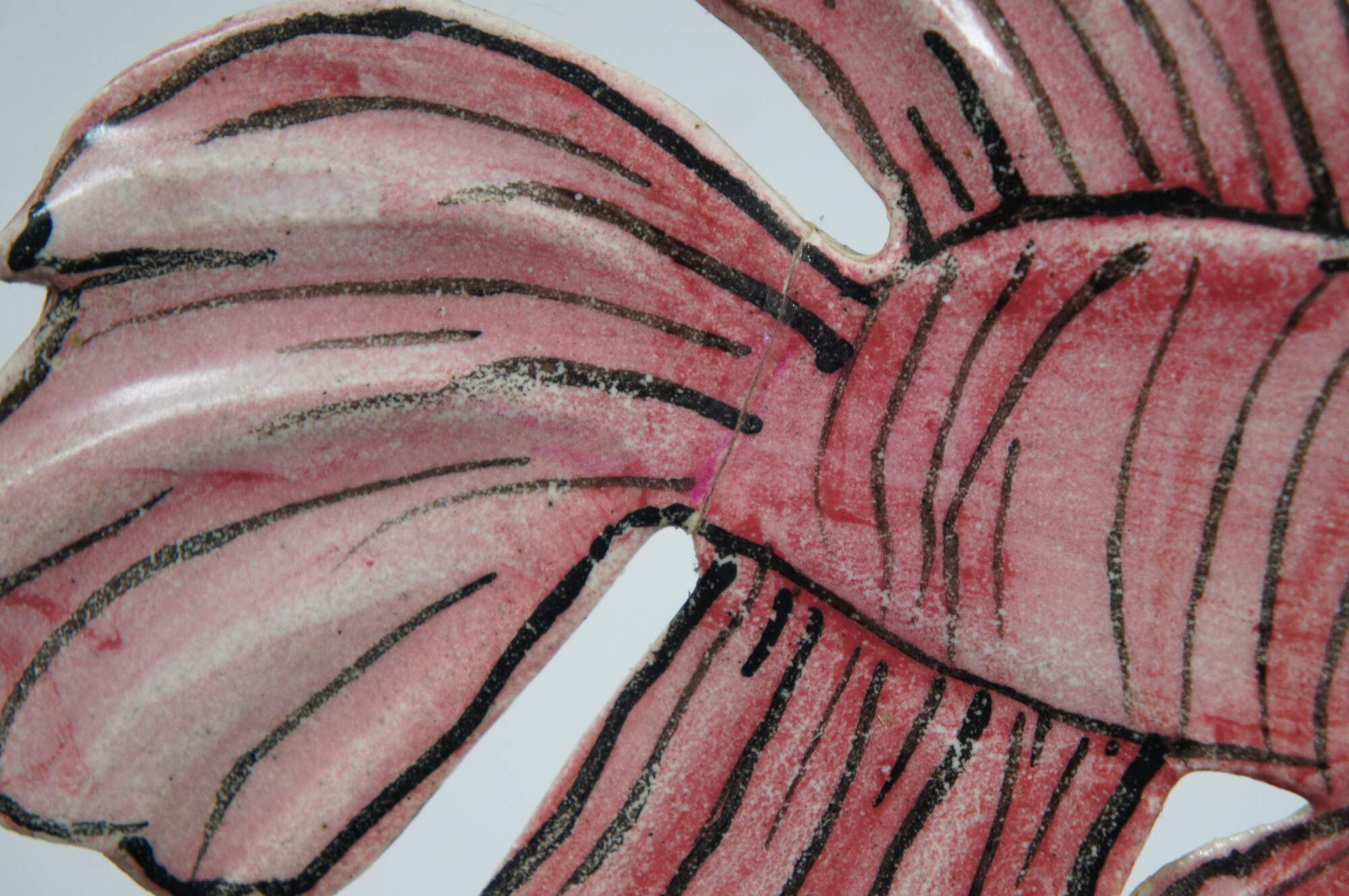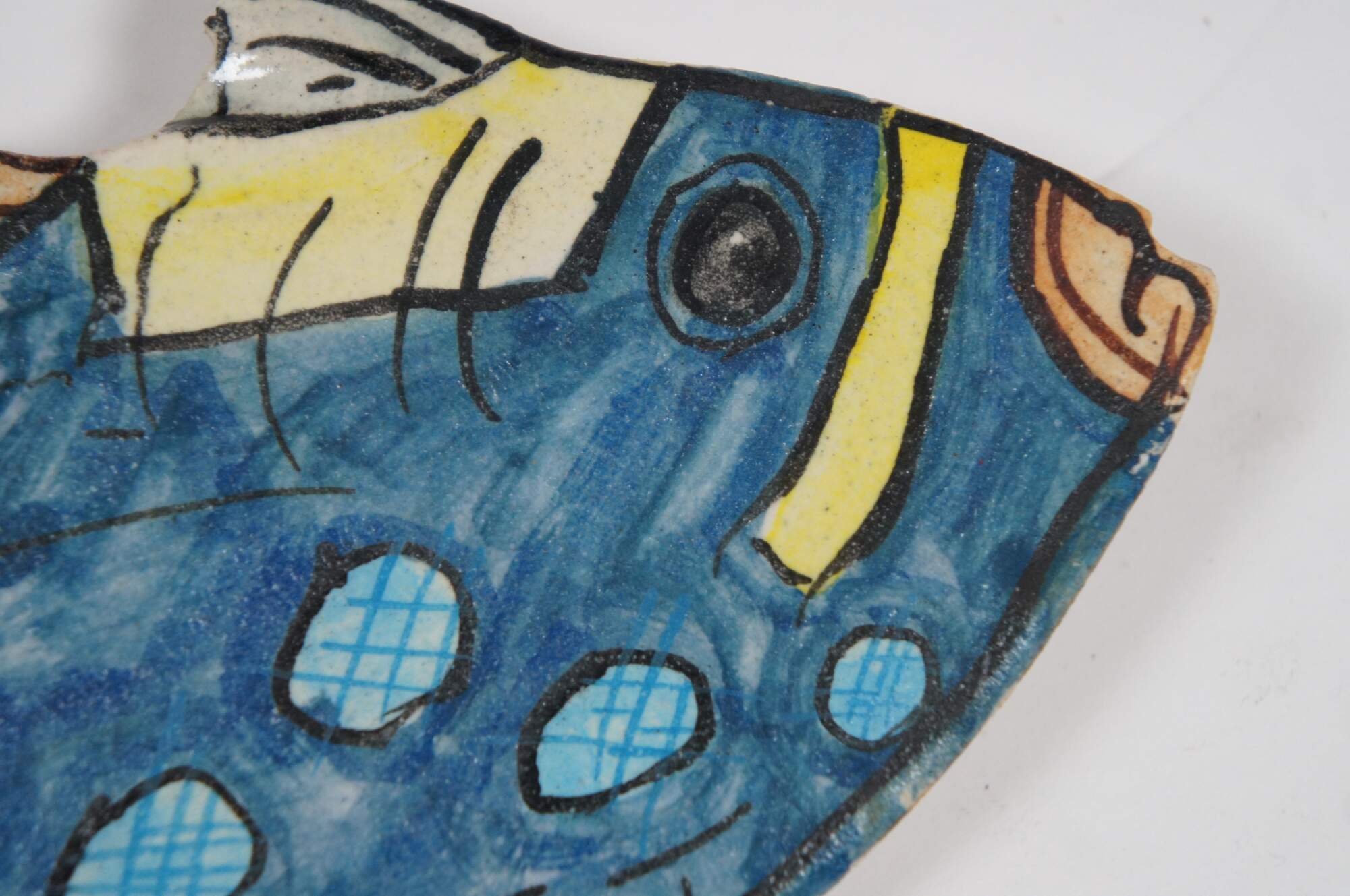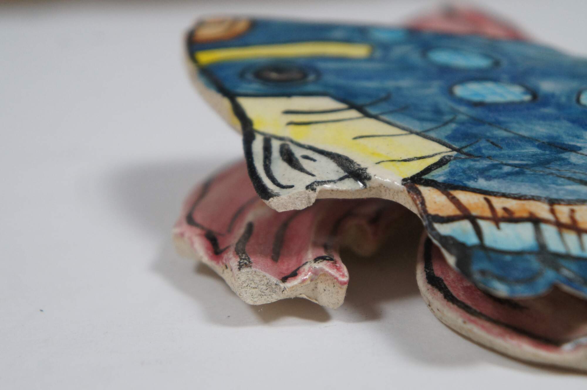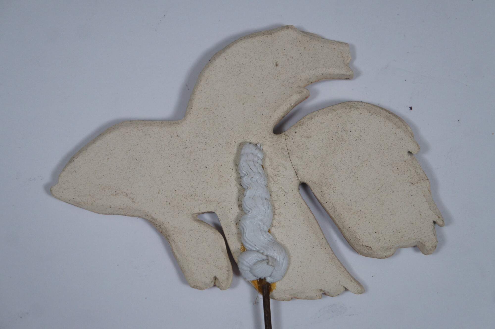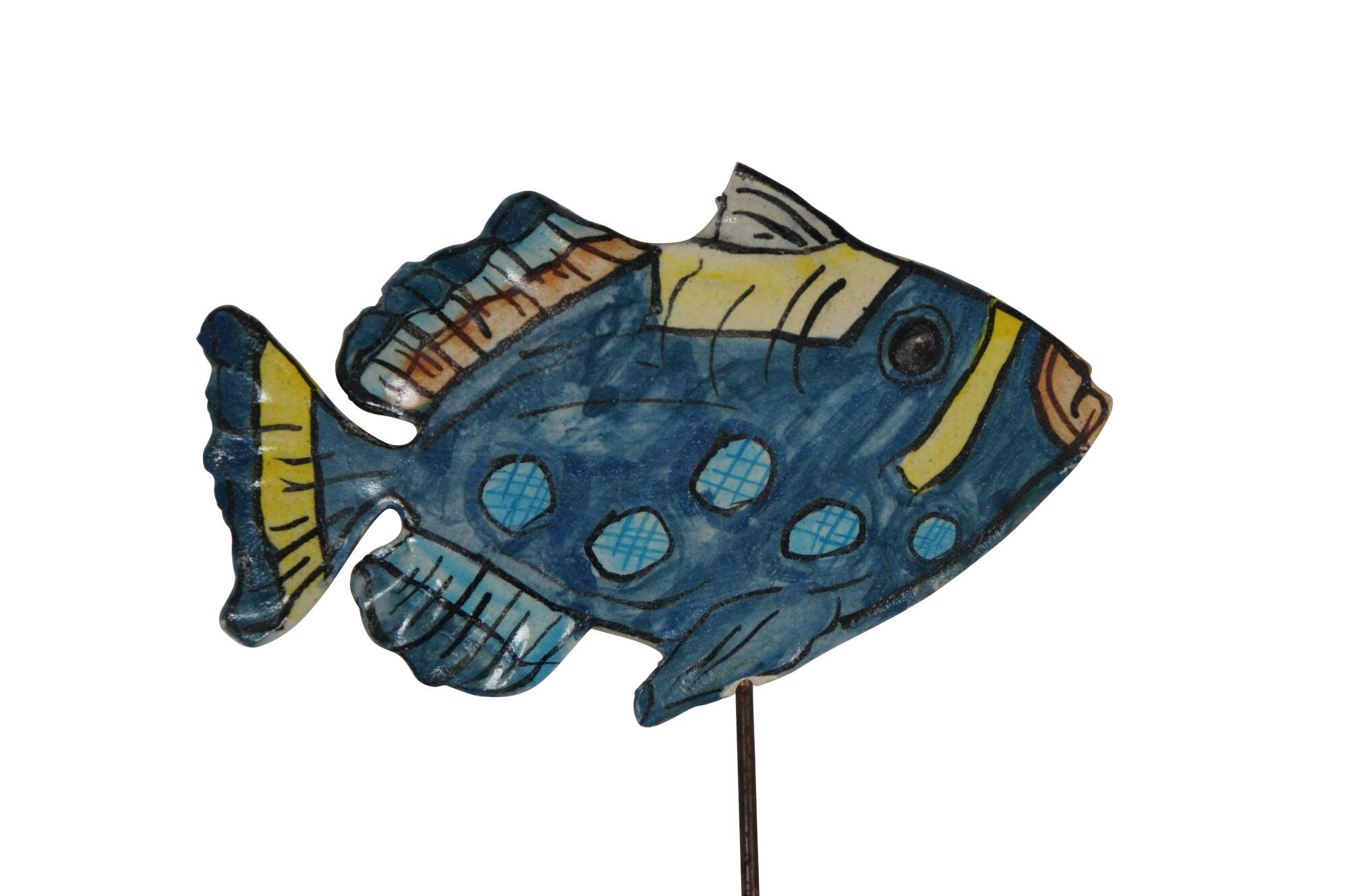 Pair of vintage 1995 hand painted ceramic art & crafts pottery fish - one pink betta fish and one blue fish with spots and yellow stripes - adapted into decorative garden stakes. Signatures on reverse are obscured by the addition of metal rods, glued and sealed to the surface with a swirl of caulk. Circa 1995, Orcas Island.