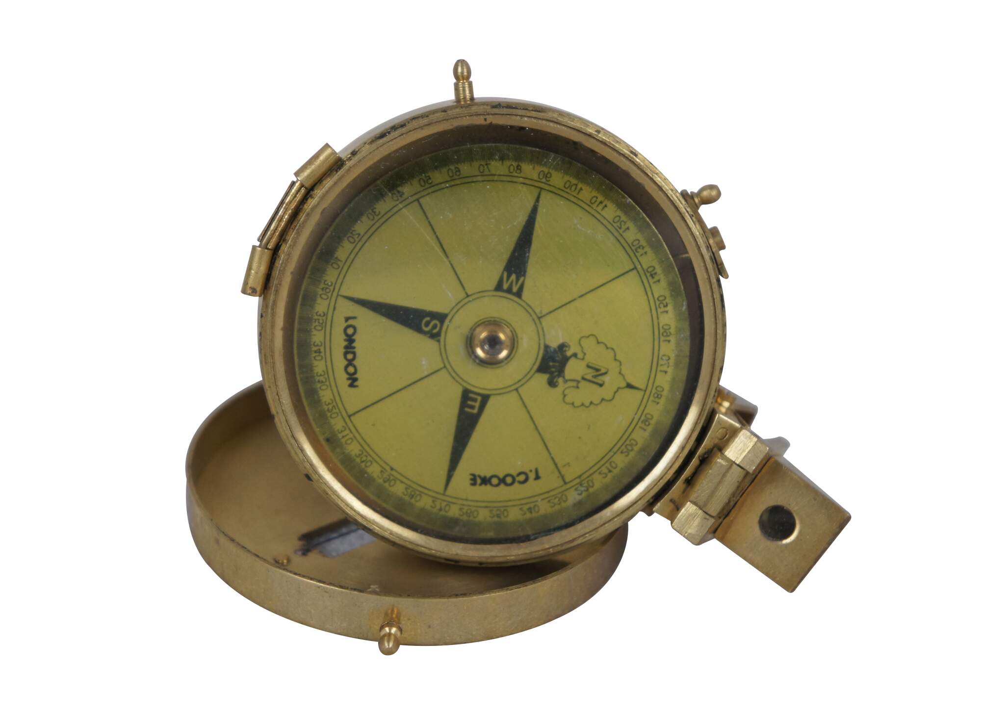 Vintage T. Cooke of London prismatic compass. Brass case with pierced sight line in the lid, folding prism, metallic gold tone face, and short stand able to be screwed onto a tripod for stabilization.