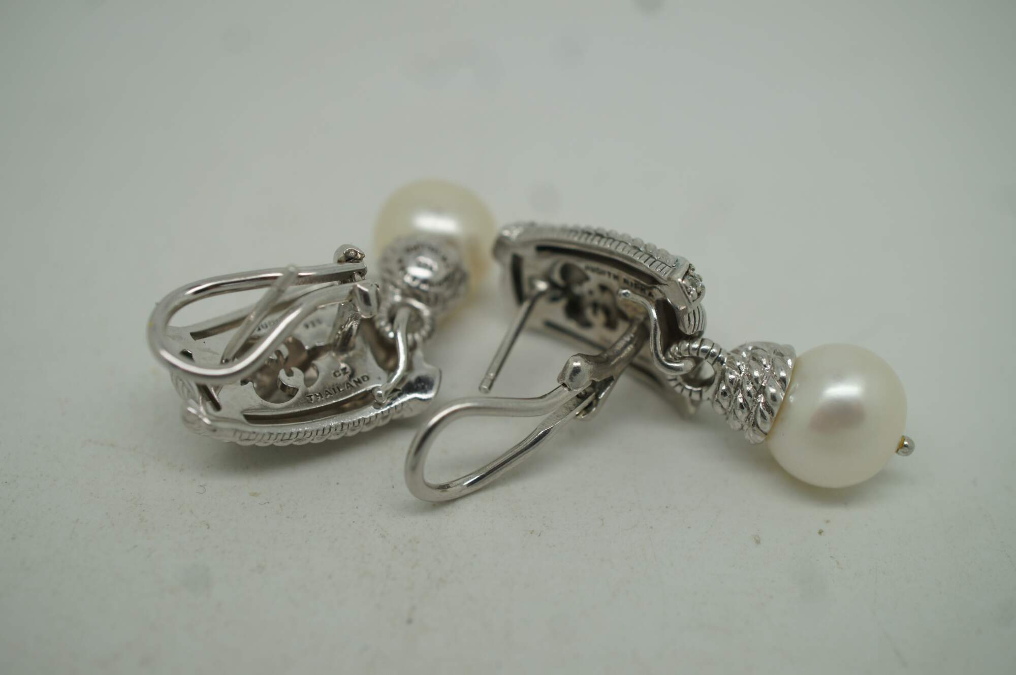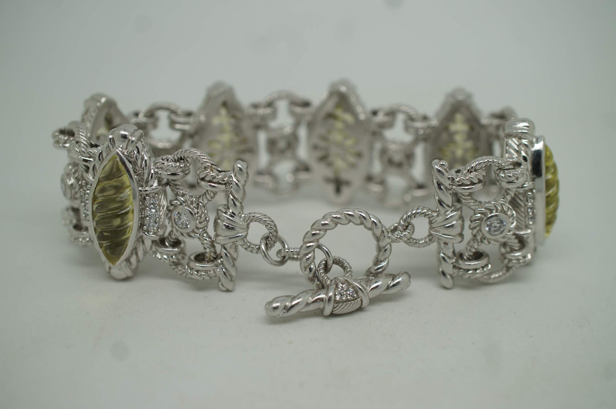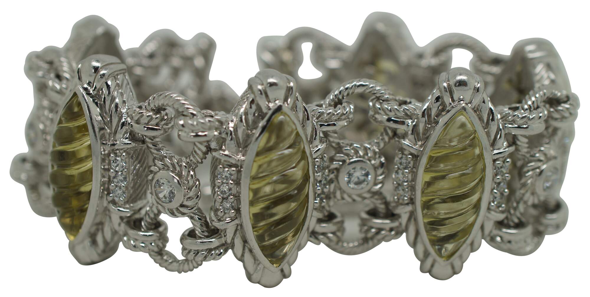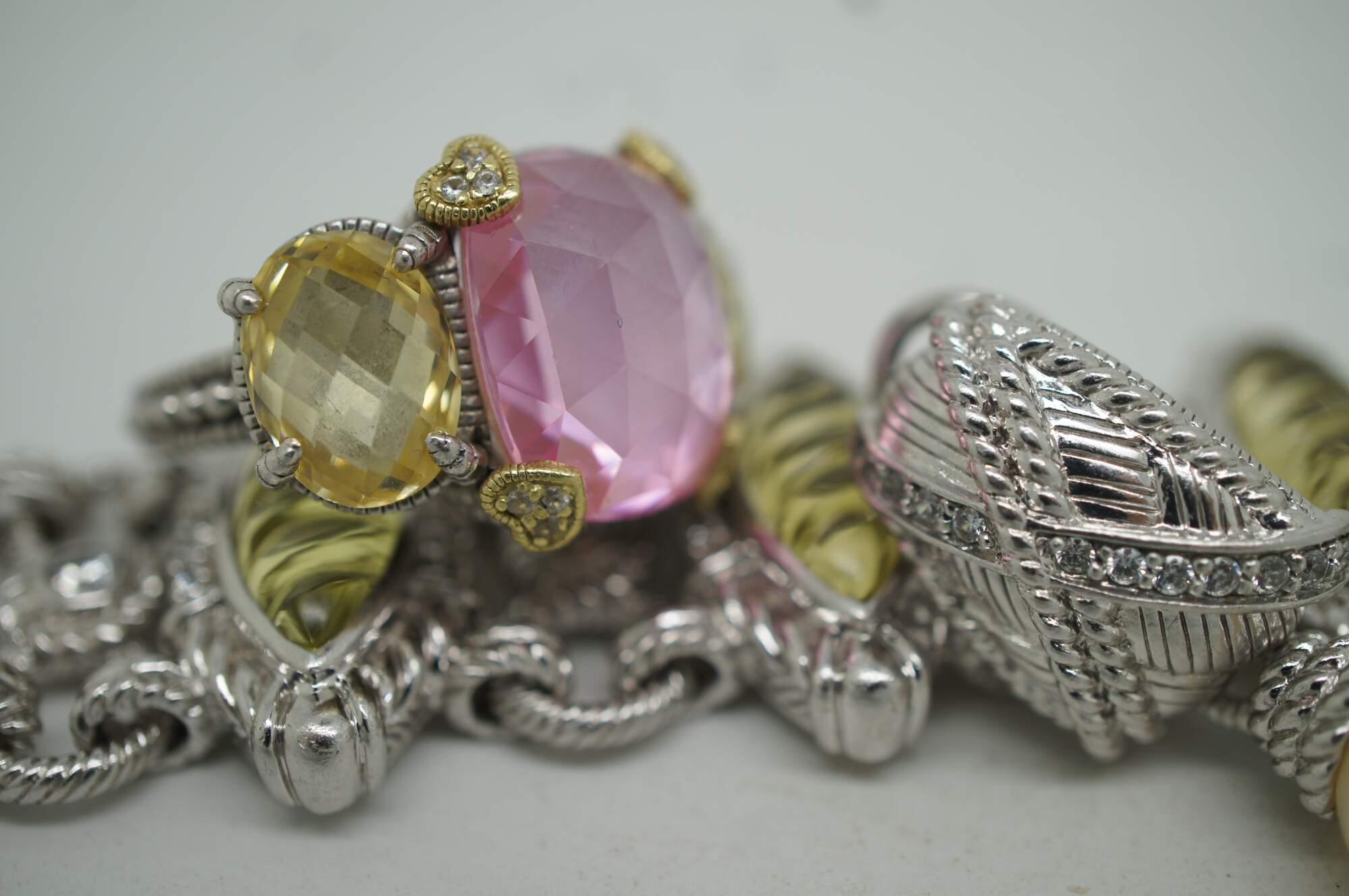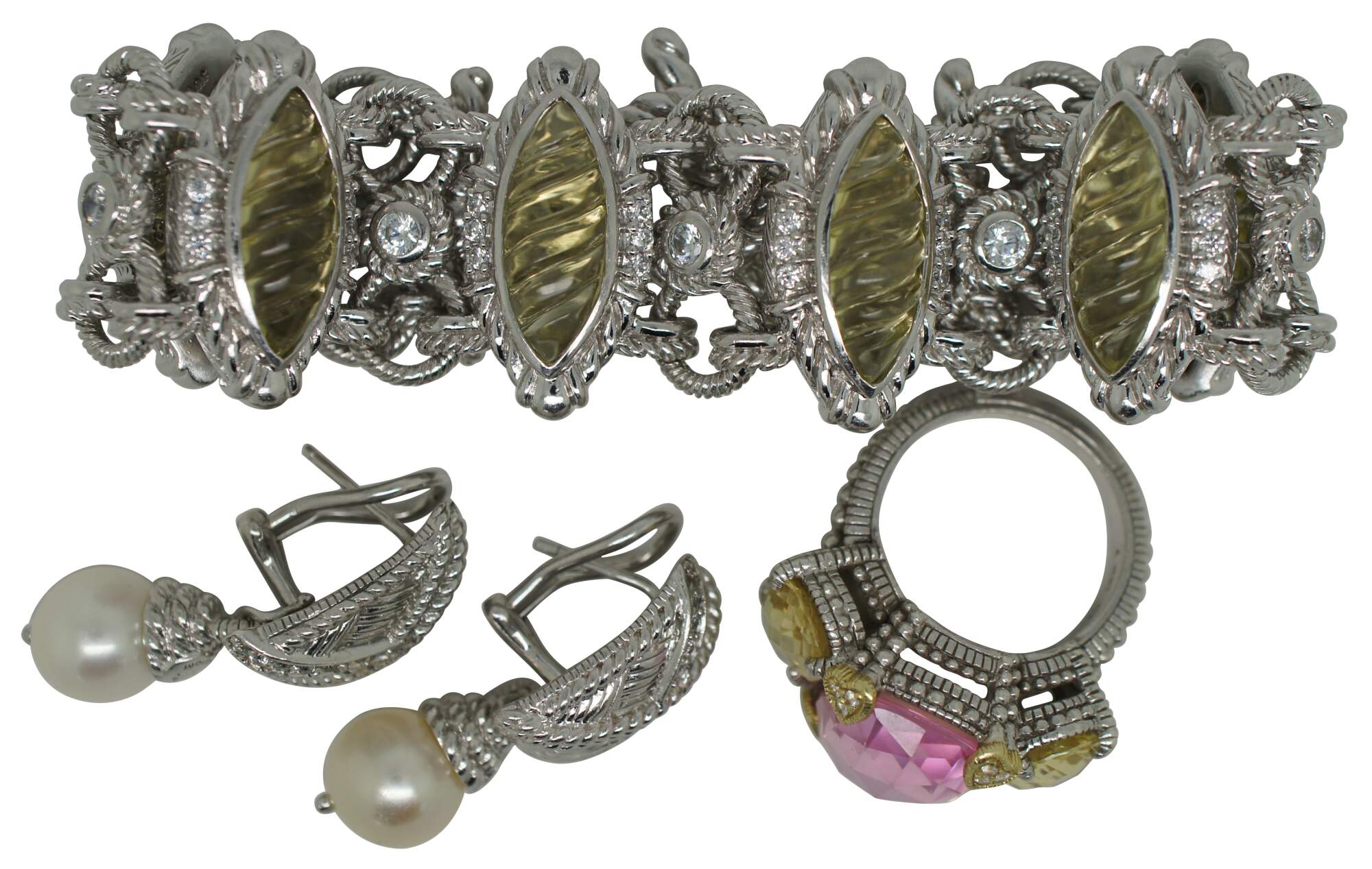 Set of four vintage pieces of jewelry by designer Judith Ripka. Set includes one sterling silver toggle clasp, chain linked bracelet featuring rope twisted accents and alternating white cubic zirconia and pale green, almond shaped, swirl carved gems; pair of clip on sterling silver earrings with crossed rope twist pattern accented with white cubic zirconia and cultured pearl dangles; and a sterling silver and 18K gold cocktail ring featuring a beaded band set with a large pink gem flanked by pale yellow gems, accented at the corners with golden hearts with white cubic zirconia.