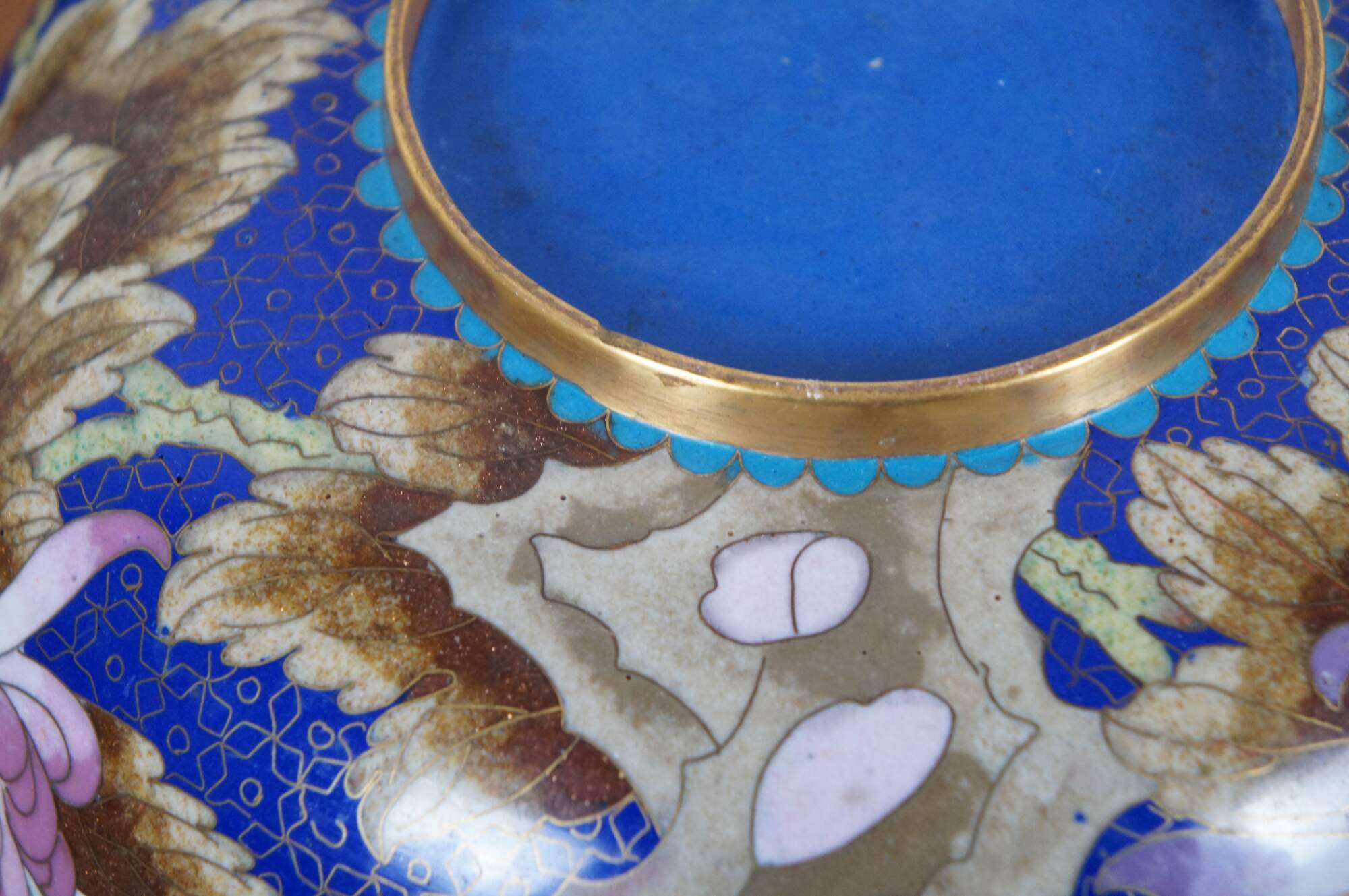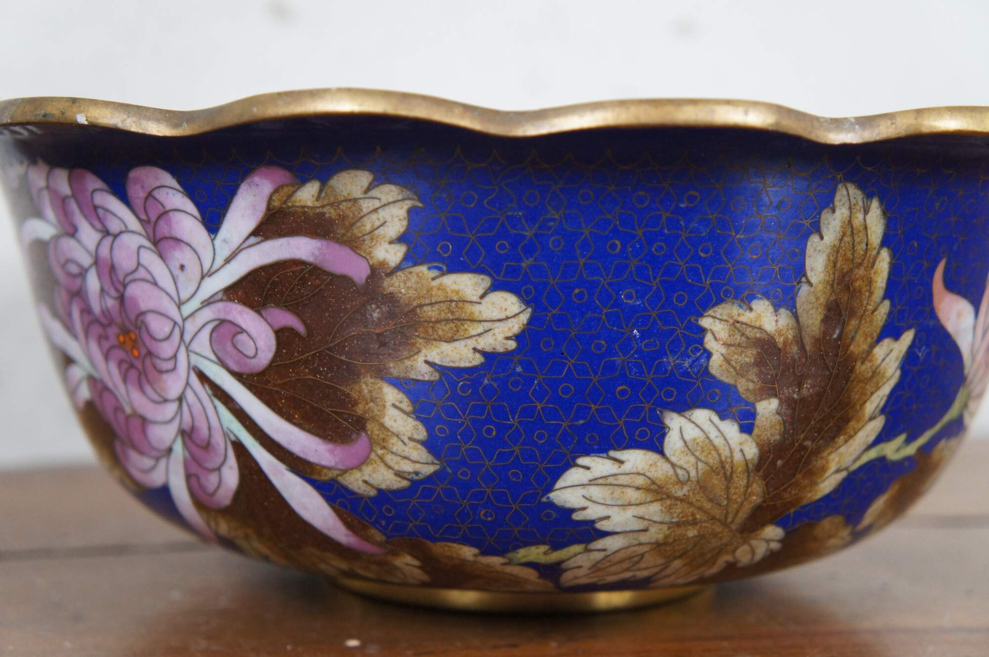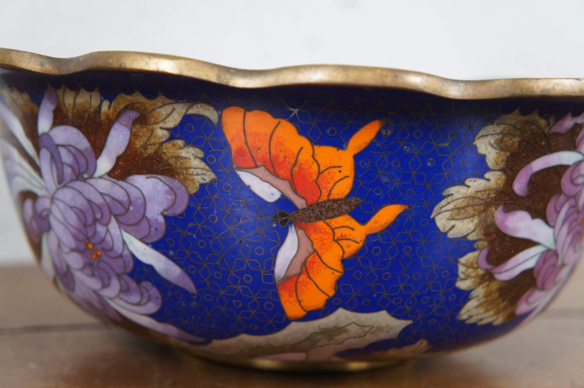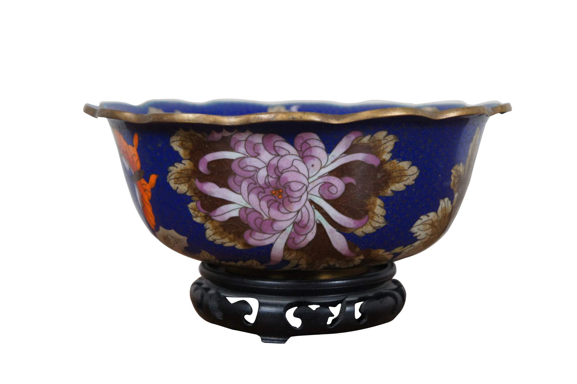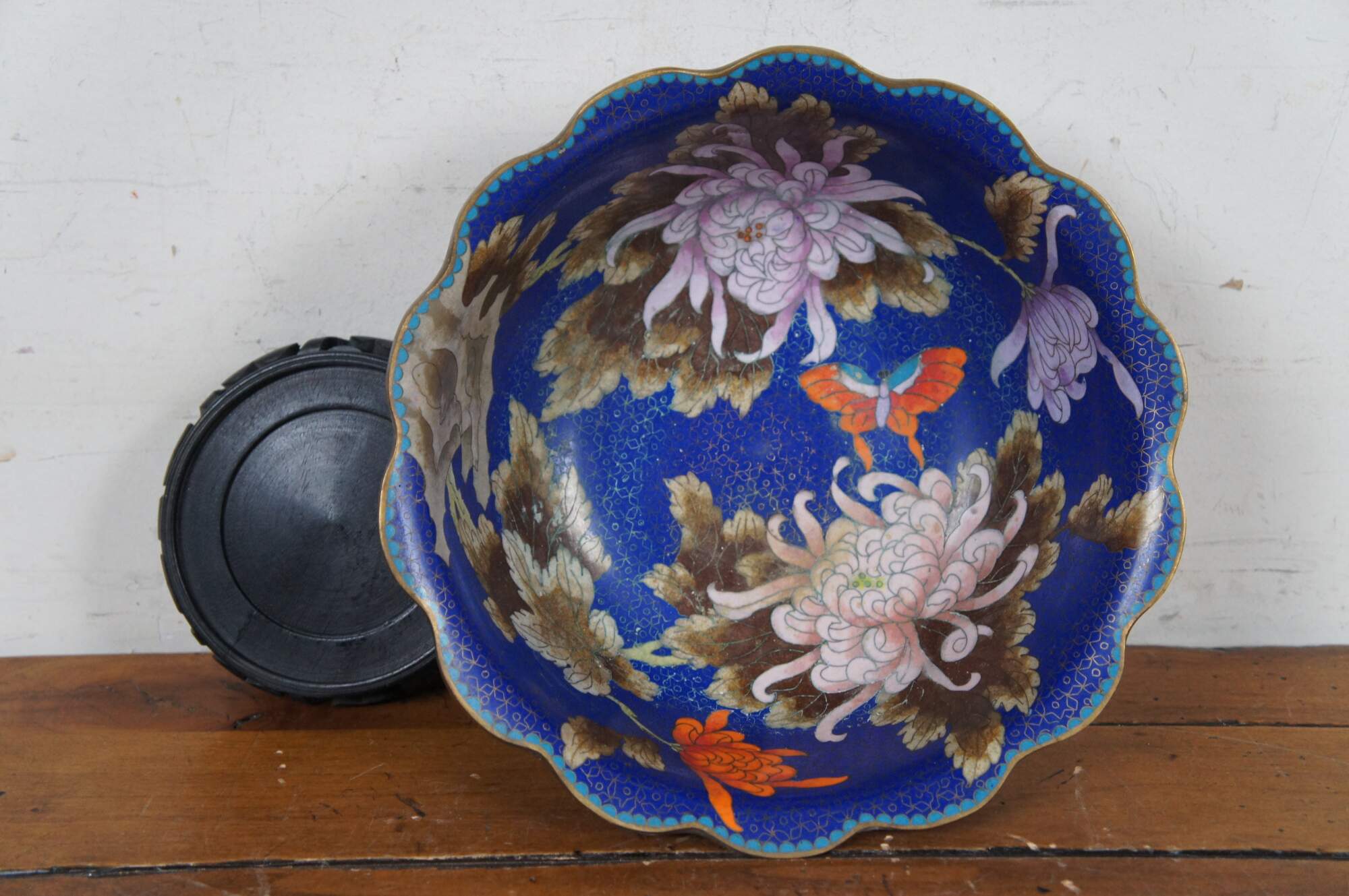 Antique Chinese cloisonné bowl / centerpiece with scalloped rim, decorated with pink and orange chrysanthemums, brown and green leaves, scalloped turquoise trim, and orange butterflies on a floral patterned background of deep sapphire blue. Includes carved wood stand.