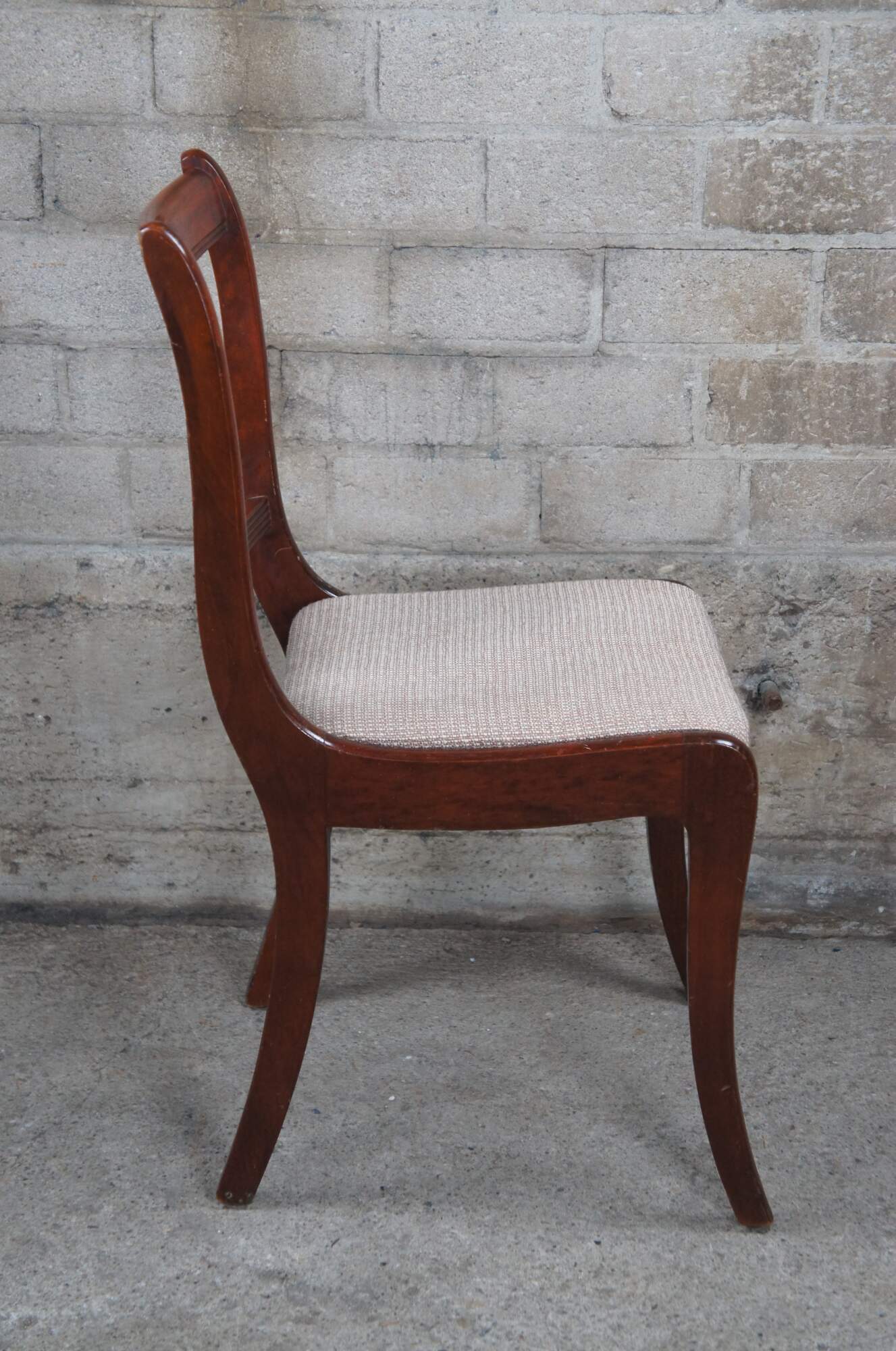 1940s Duncan Phyfe / Regency Style dining side chair. Made from mahogany with a harp / lyre back. Features an upholstered seat and saber legs.