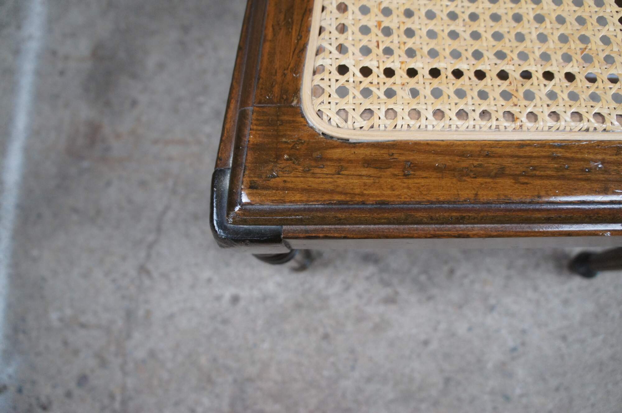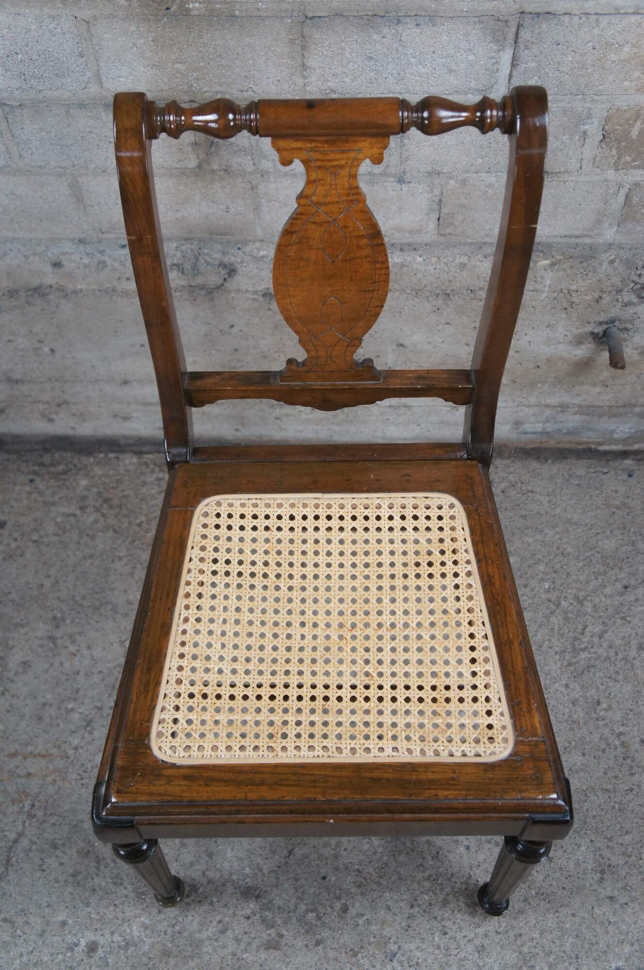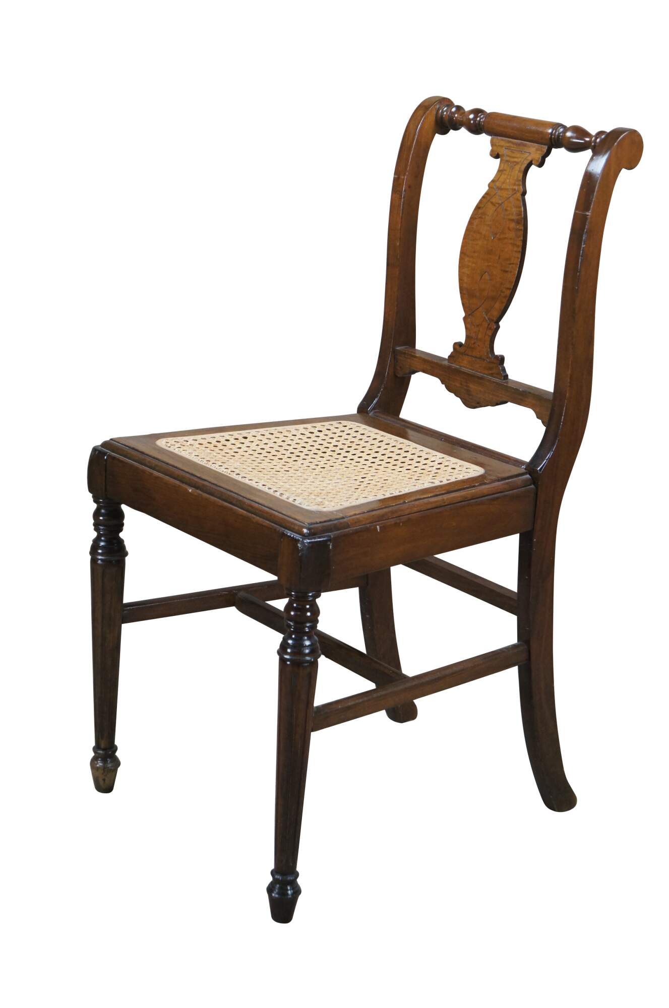 Antique Federal side chair. Made from poplar with curly poplar back splat. Features a scrolled form with turned crest rail and cane seat. Front turned legs are connected to the rear square tapered legs by an H stretcher Front feet are arrow form.