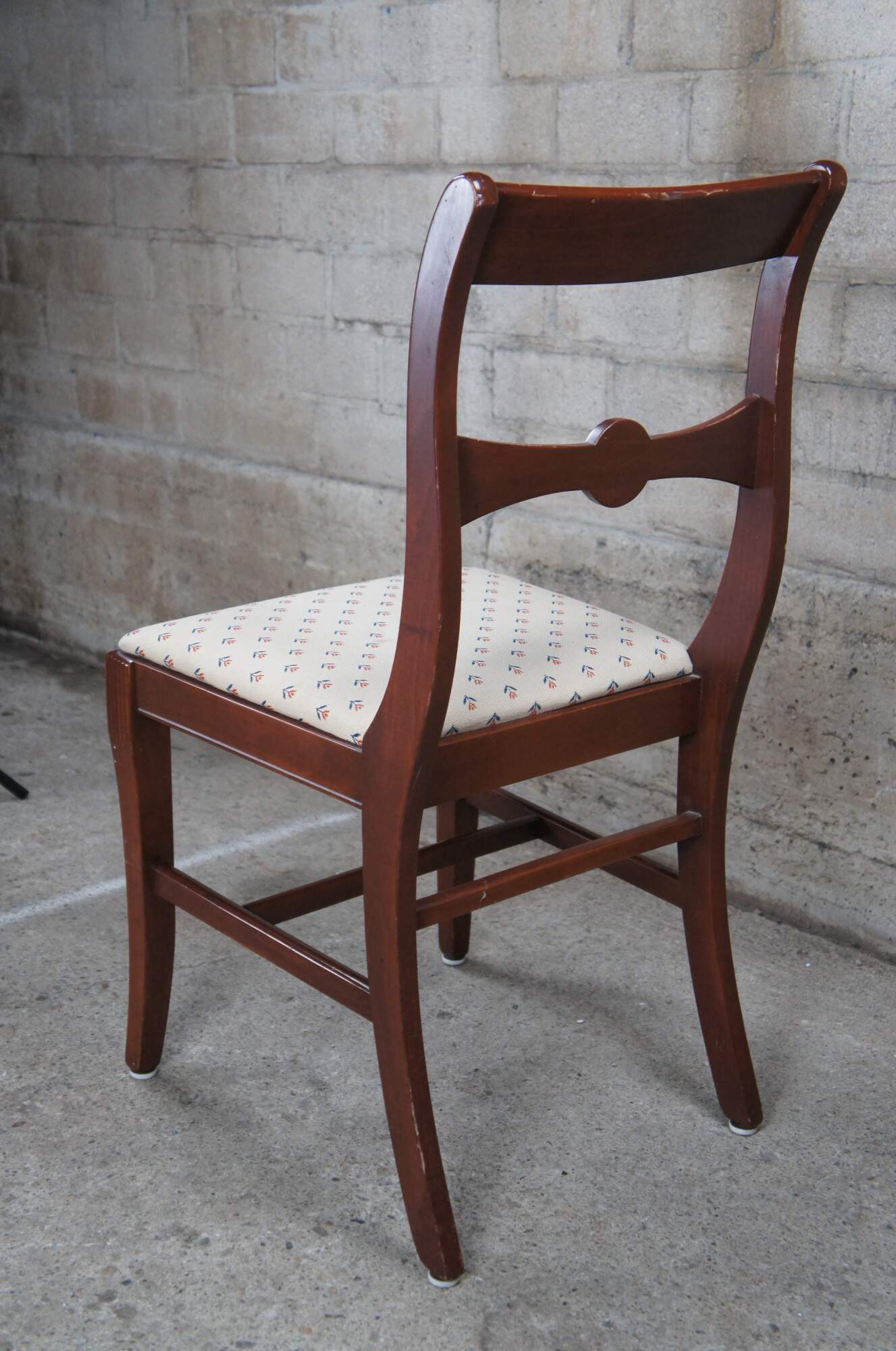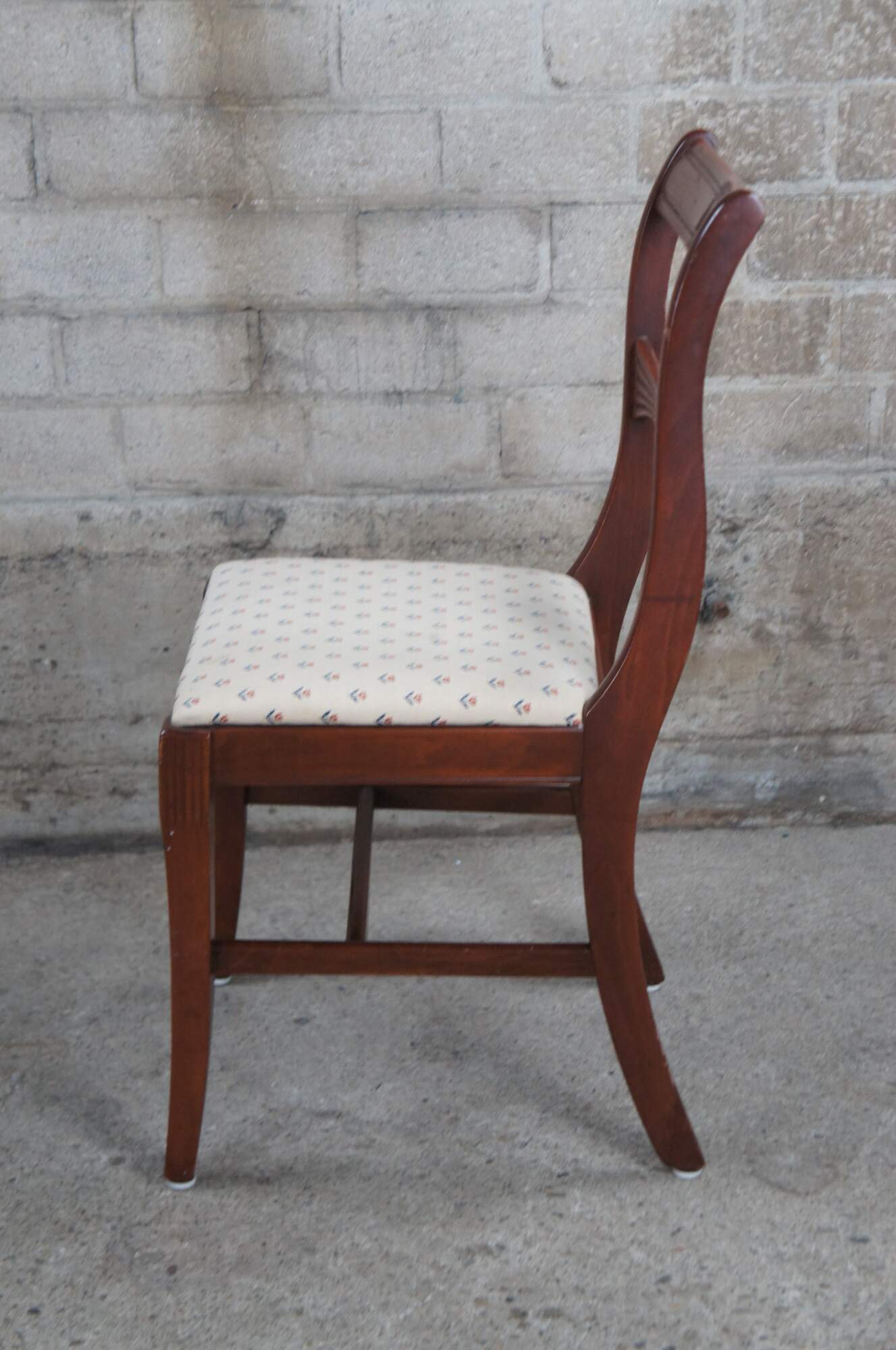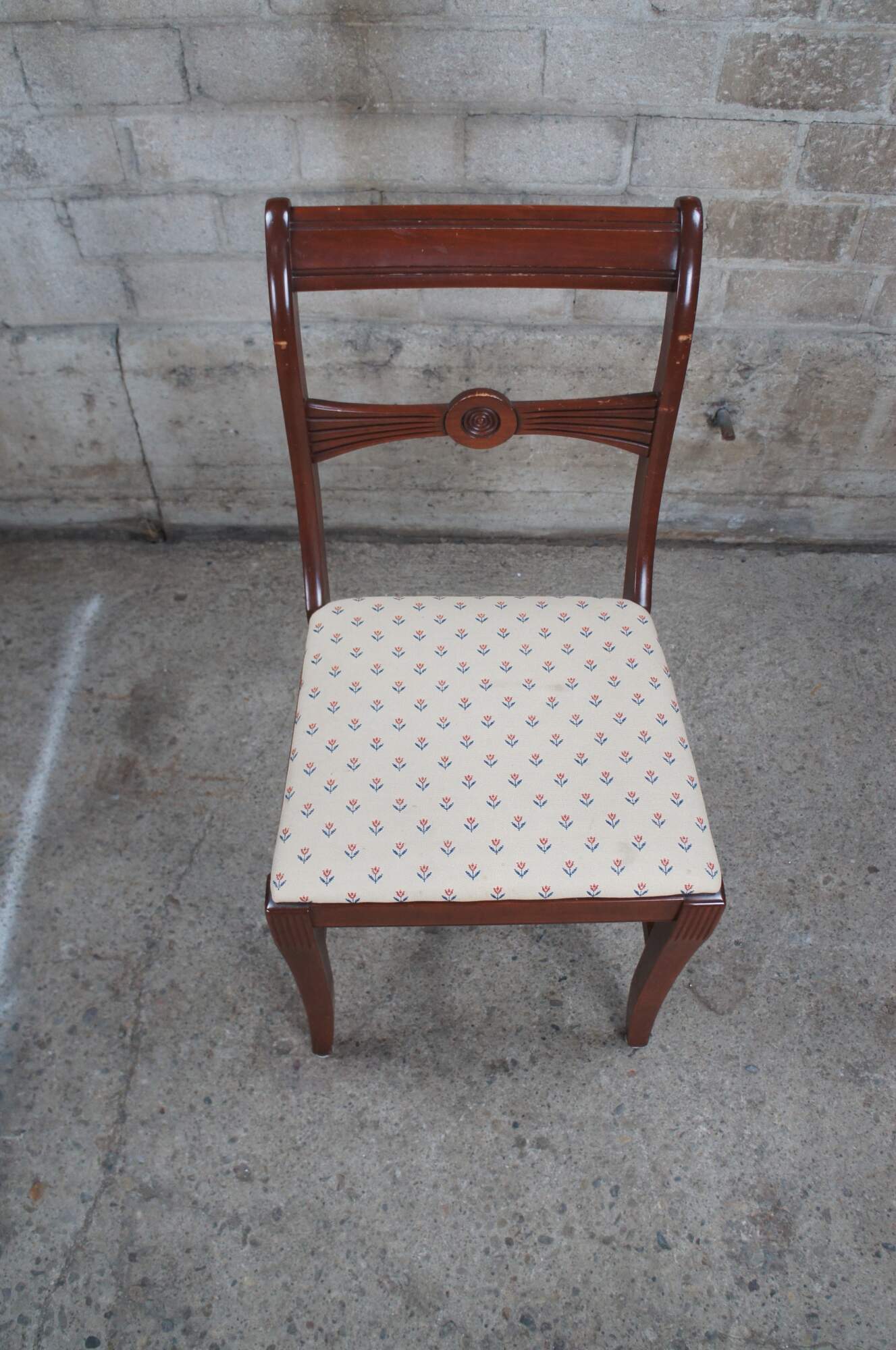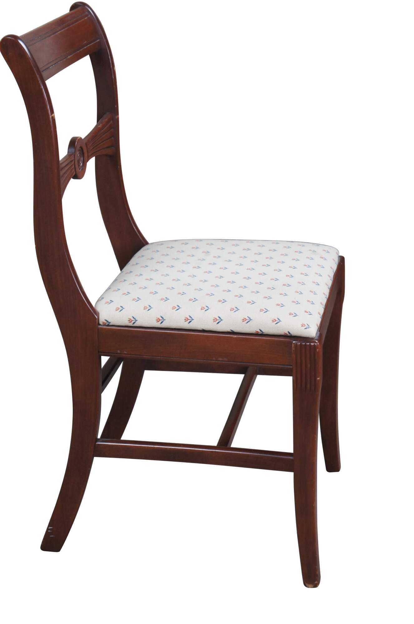 1940s Duncan Phyfe / Regency Style dining side chair. Made from mahogany with a contoured crest rail and bow shaped back. Features an upholstered seat with repeating tulip / rose pattern. Front legs are fluted along the front corner and tapered, connected to the rear spade legs by an H stretcher.