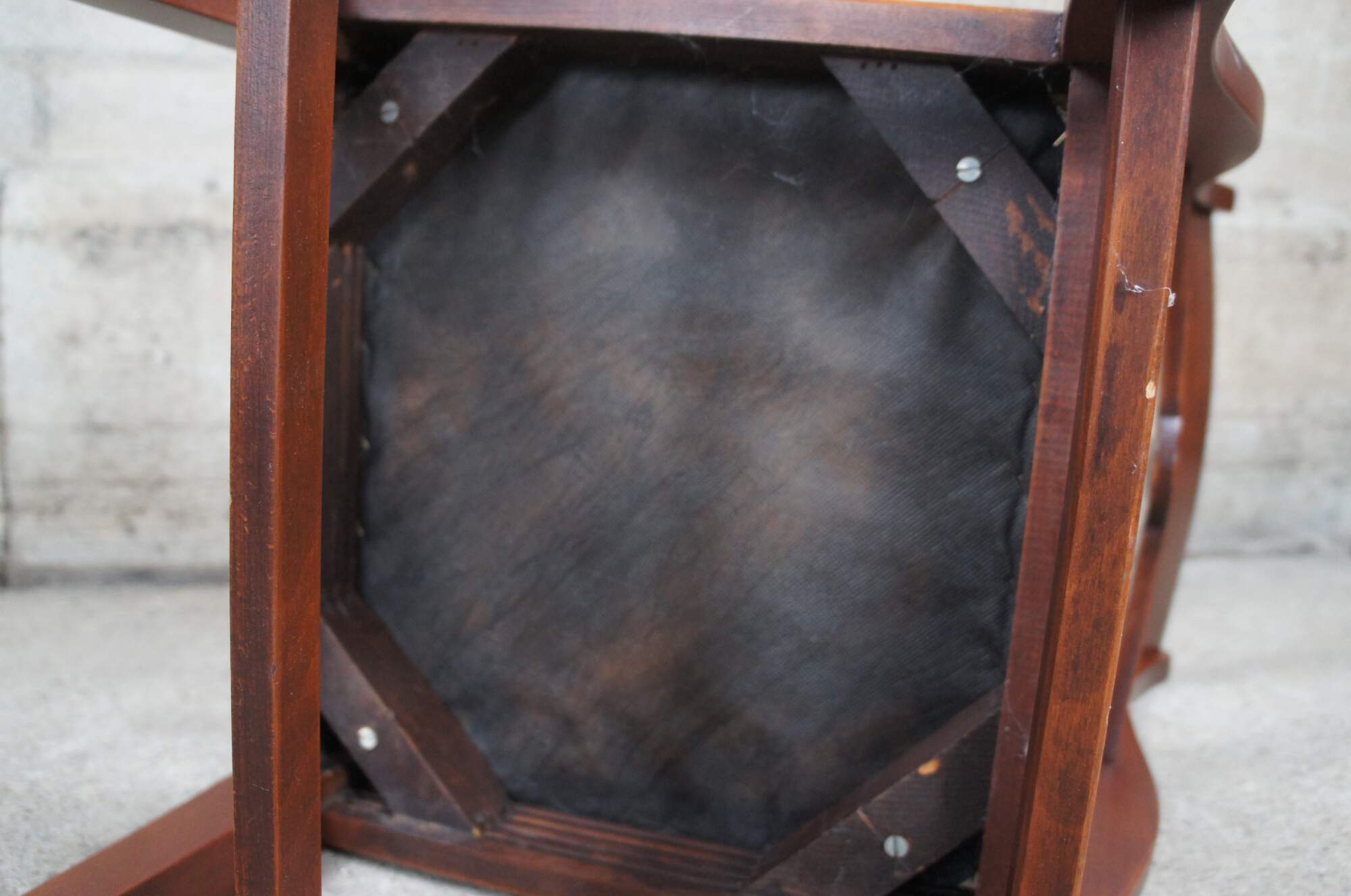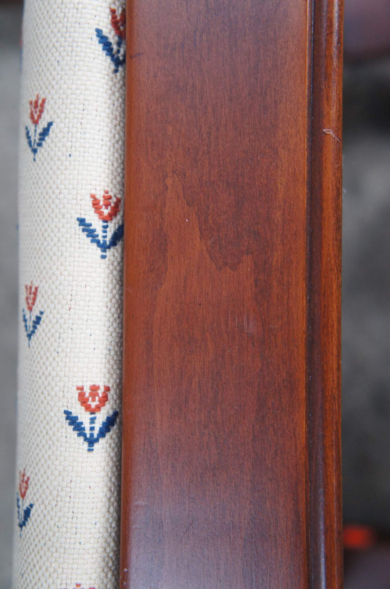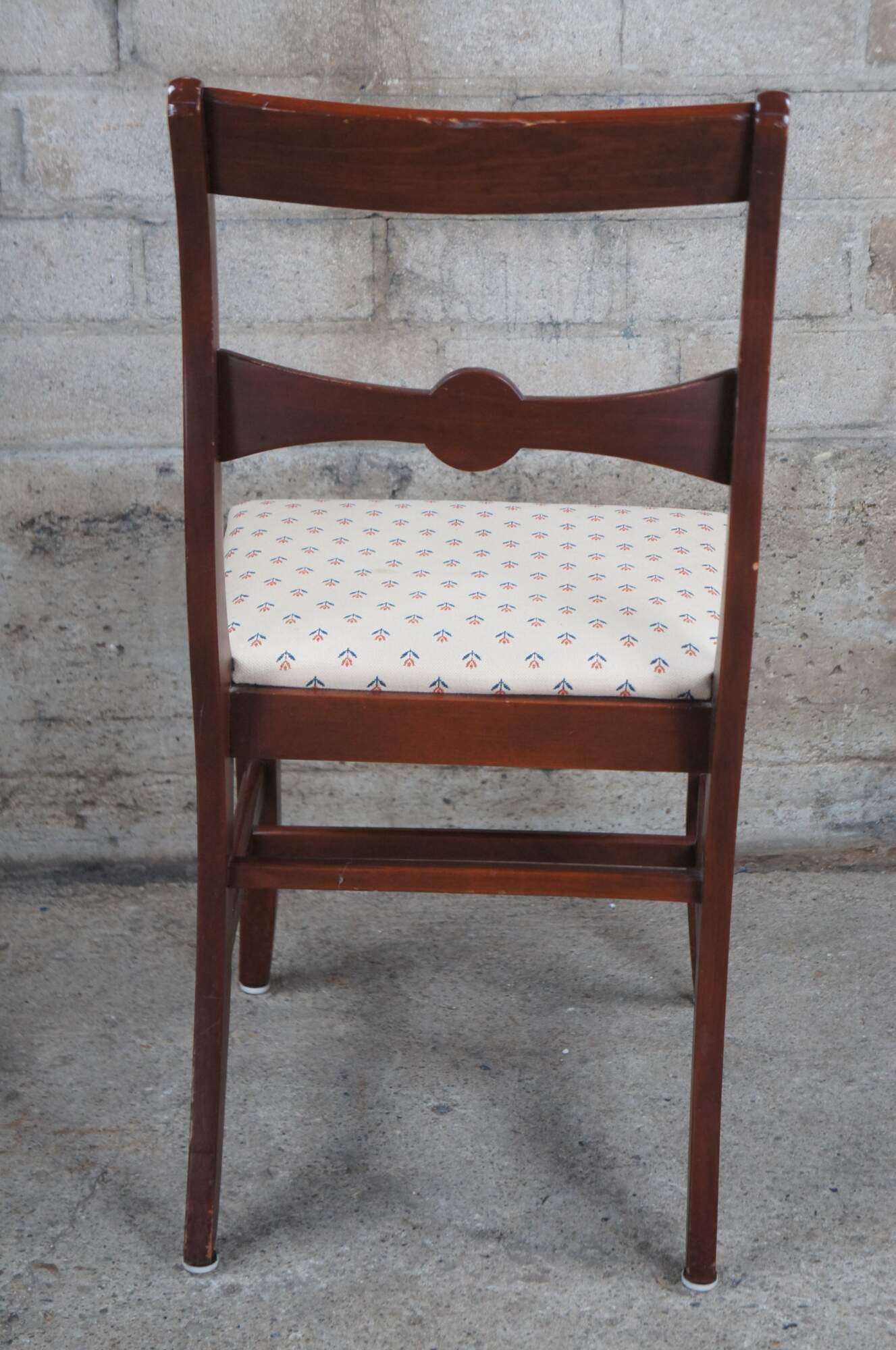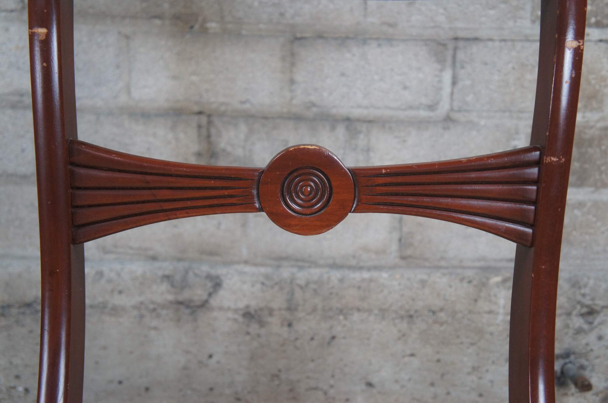 1940s Duncan Phyfe / Regency Style dining side chair. Made from mahogany with a contoured crest rail and bow shaped back. Features an upholstered seat with repeating tulip / rose pattern. Front legs are fluted along the front corner and tapered, connected to the rear spade legs by an H stretcher.