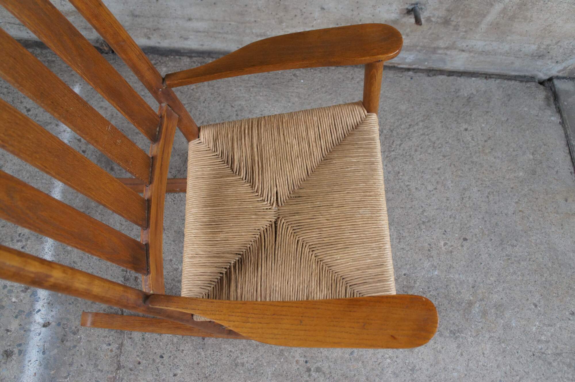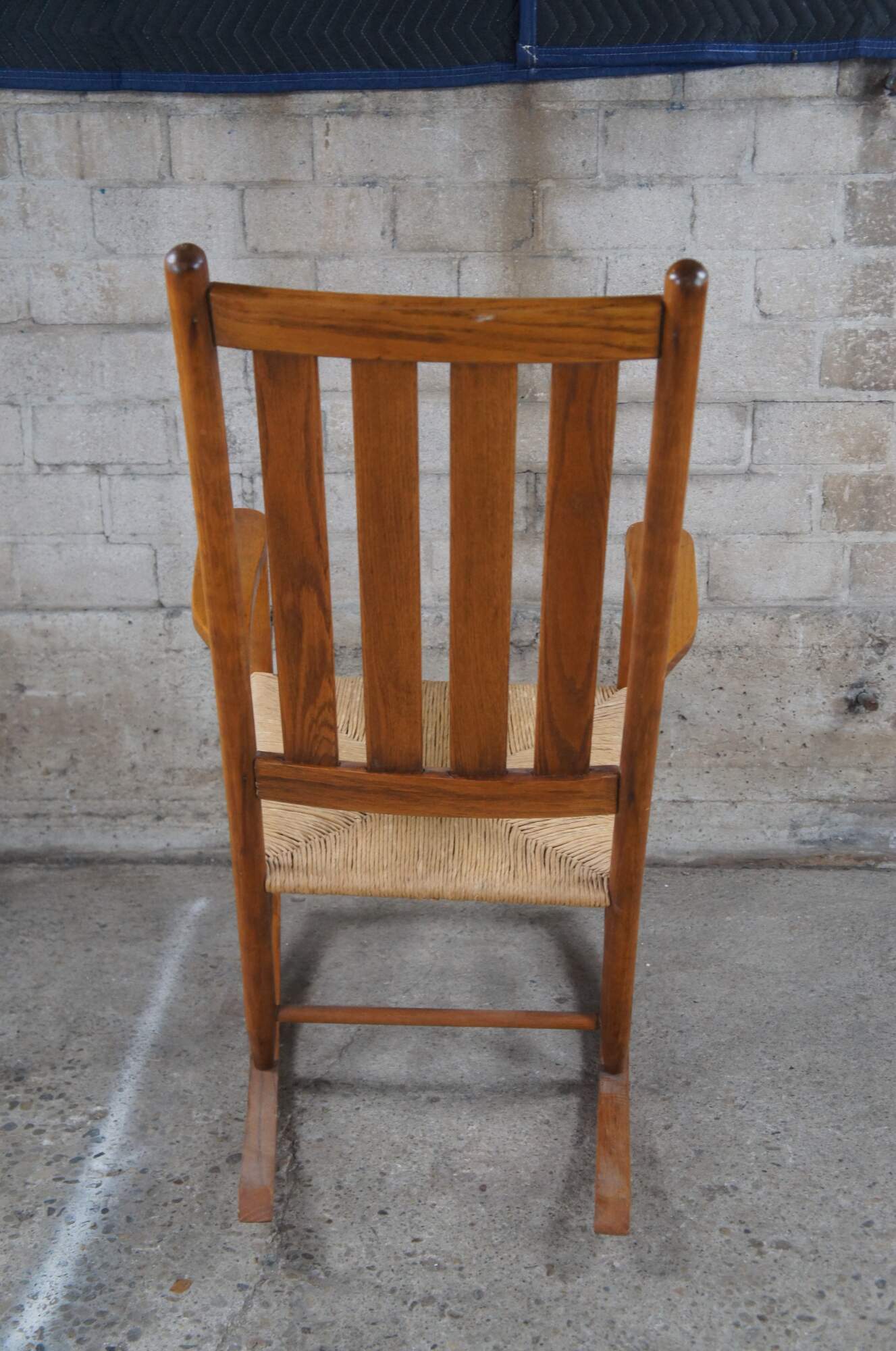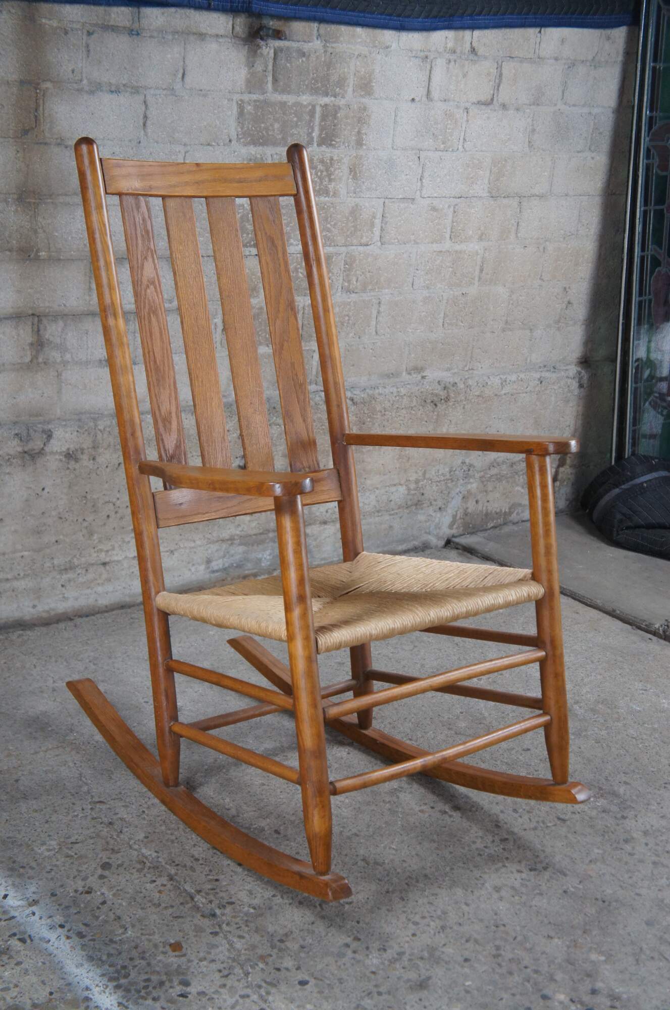 Solid oak American Country / Farmhouse rocking chair. Features a slat back and woven rush seat. Includes optional cushions for added comfort.