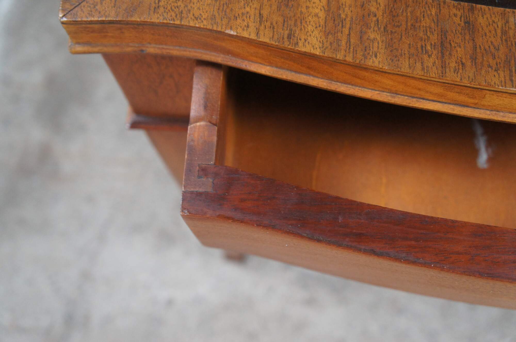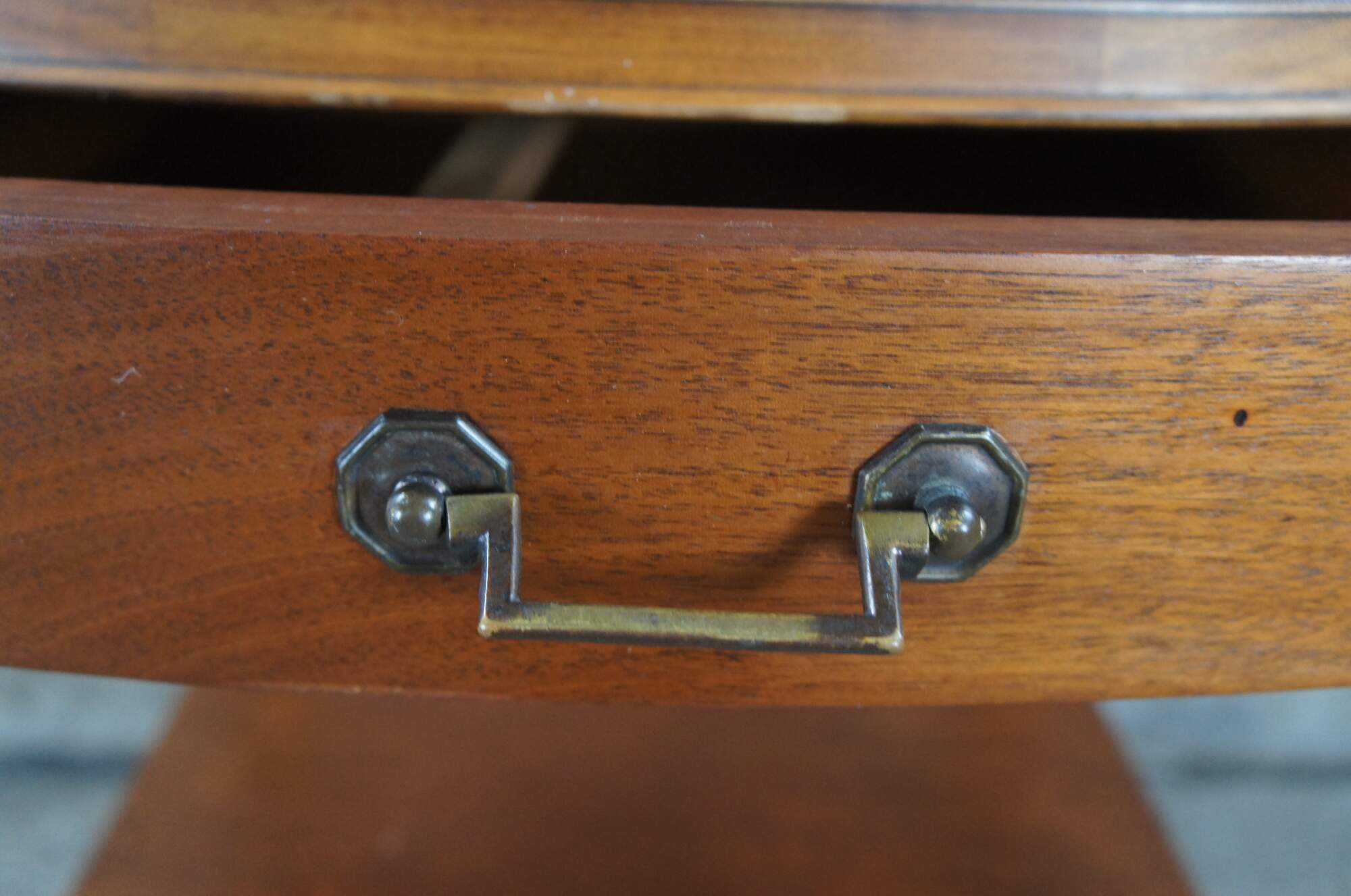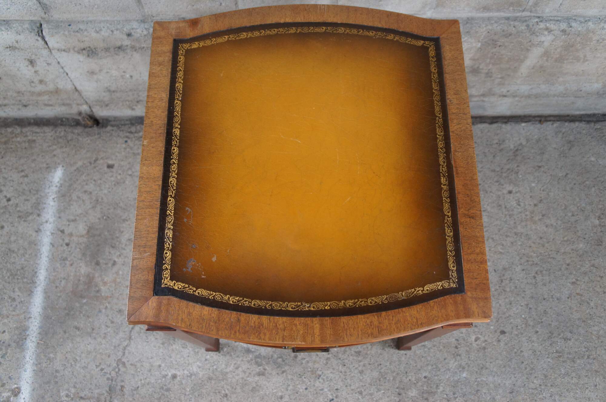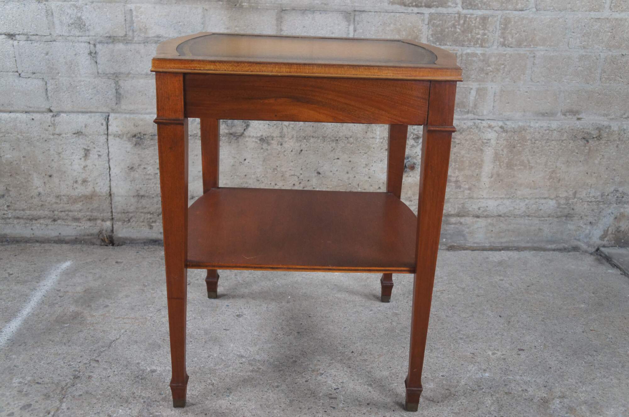 Mid 20th Century mahogany side or end table. Features a traditional Sheraton style form with a serpentine tooled leather top. The table has one drawer with bale hardware and a lower drawer. Supported by square tapered legs with spade feet. The table is marked Genuine Mahogany from the Mahogany Association. The Mahogany Association was instituted to ensure quality control over solid wood furniture. Most of the companies were based around Grand Rapids, Michigan. This table is attributed to Mersman.