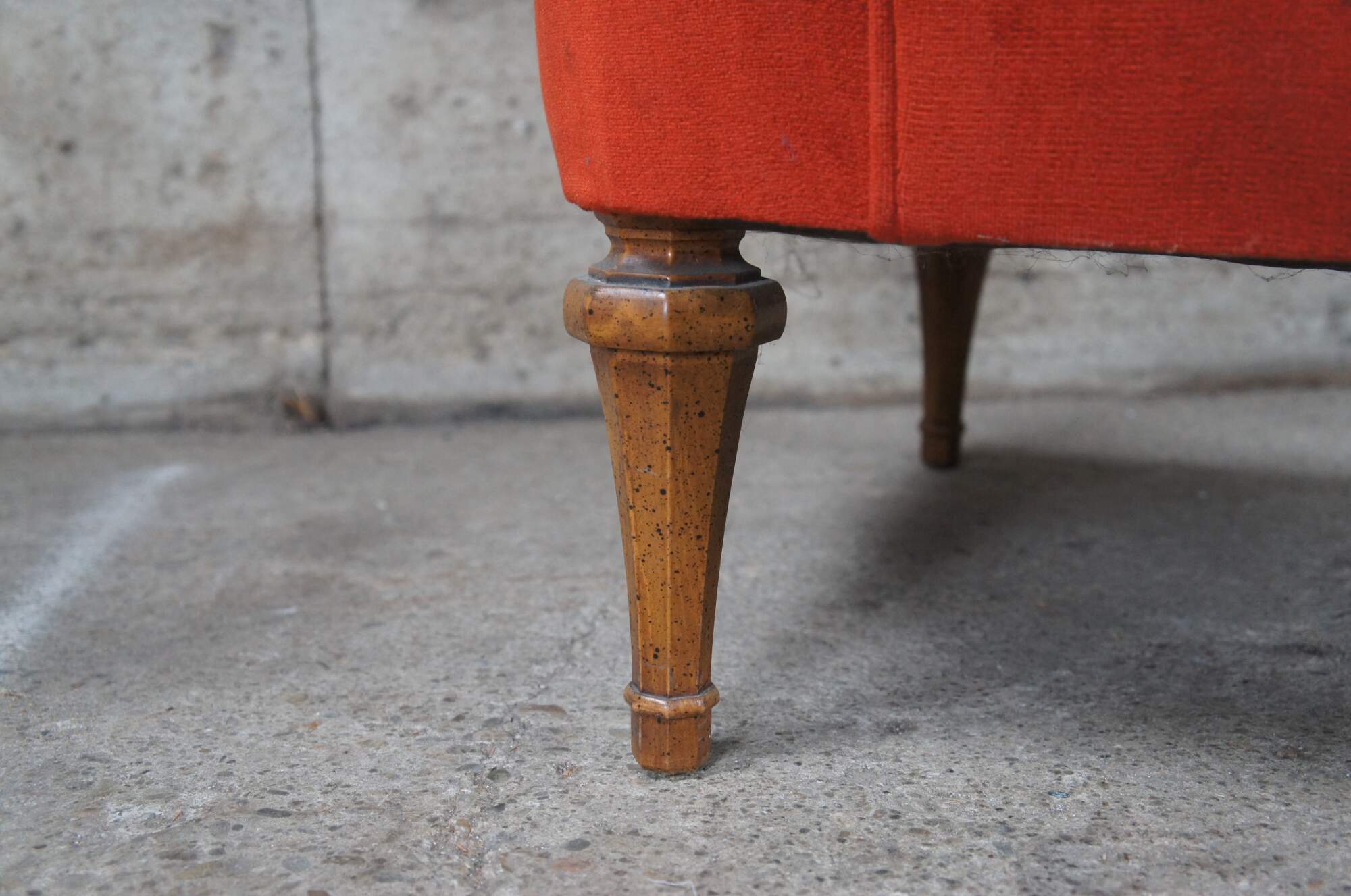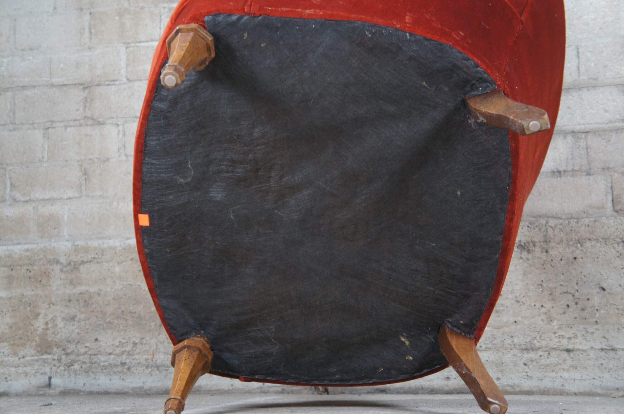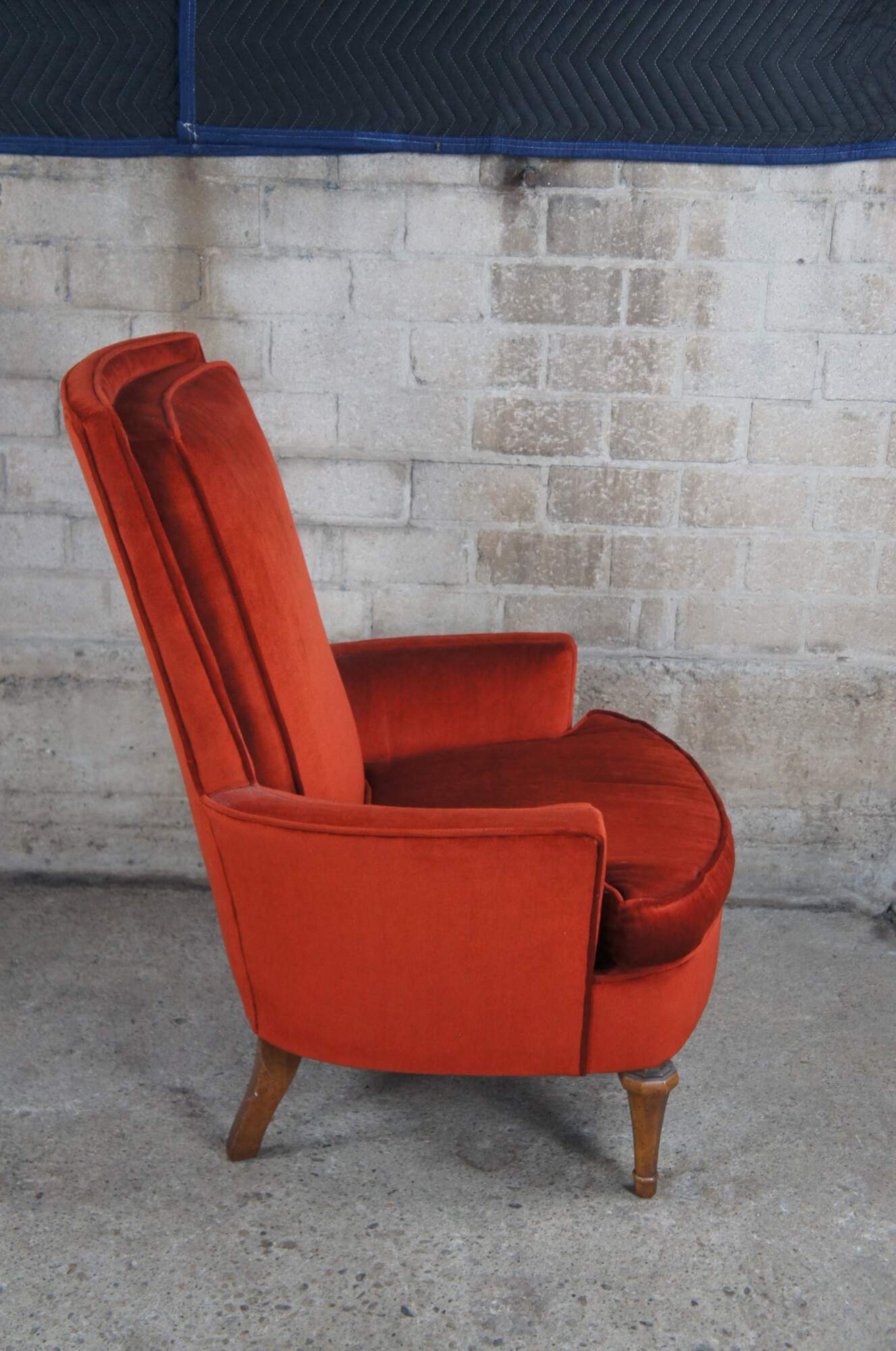 Red velvet highback lounge chair. Features a high padded back and low arms over distressed walnut turned feet.