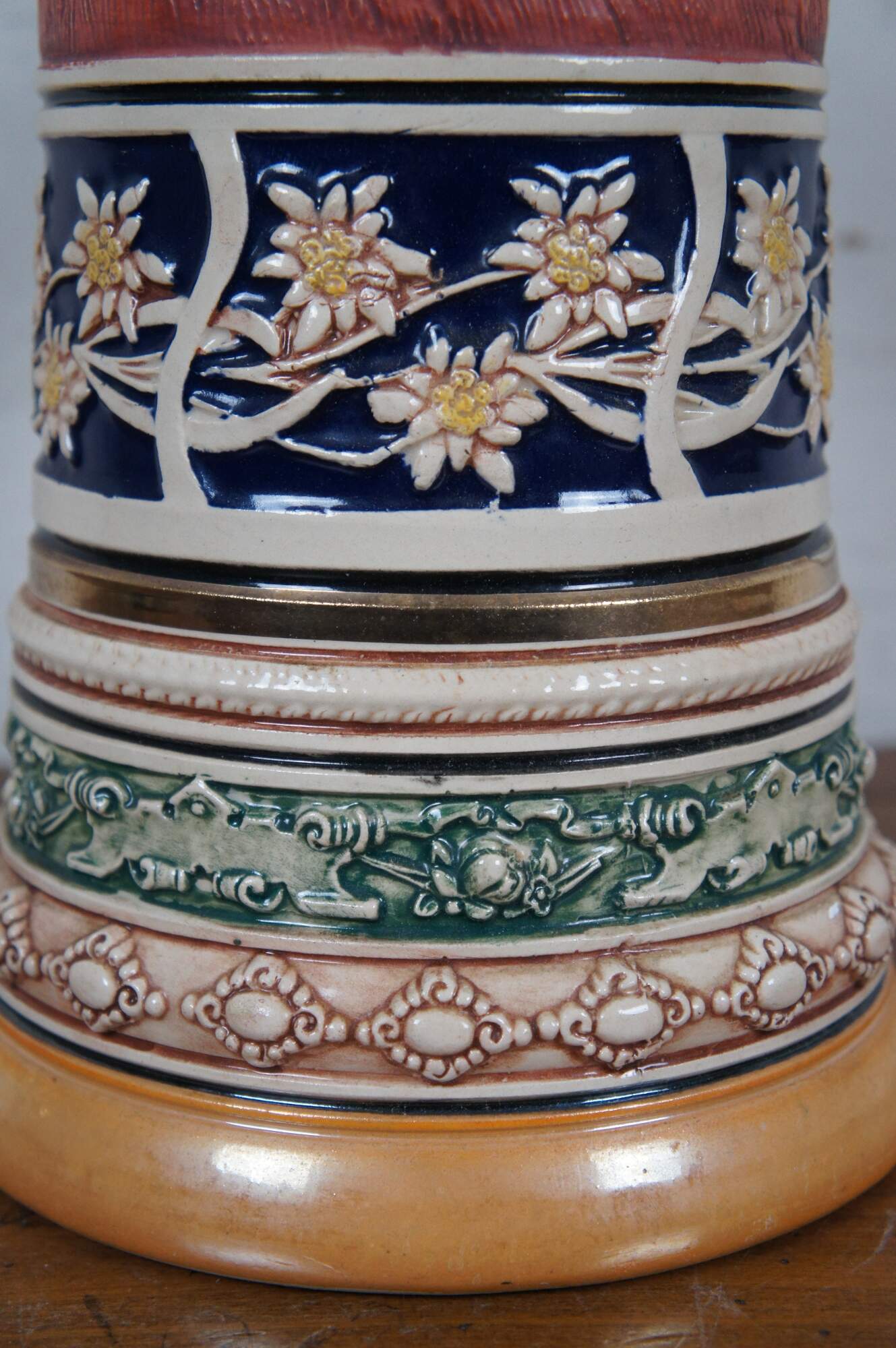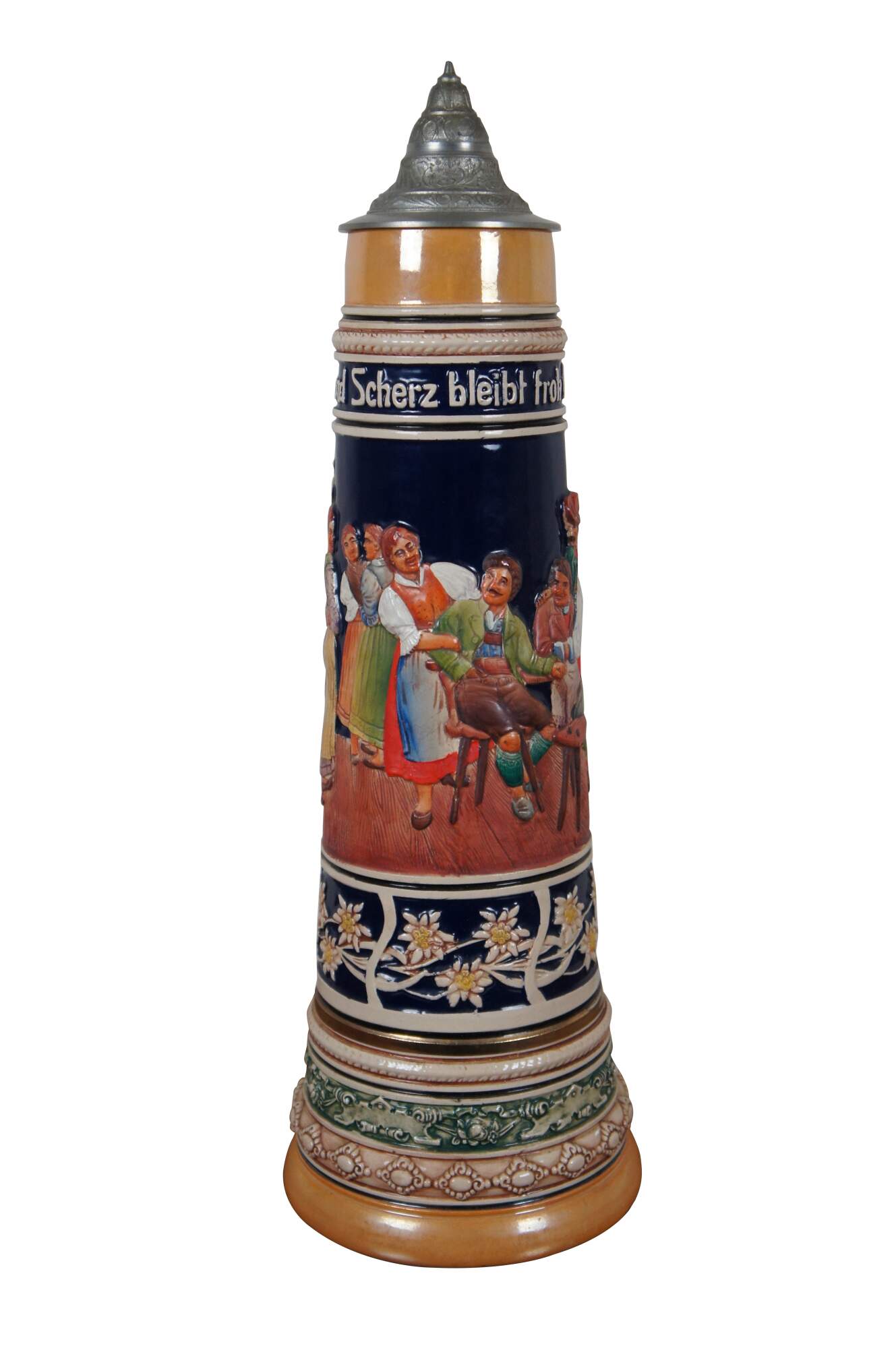 Very large mid 20th century 4 liter ceramic beer stein by Gerz. Decorated with a tavern scene, bands of floral patterned motifs, and twisted branch handle. Band around the top reads "Bei Tanz und Scherz bleibt froh das Herz" (The heart stays happy when dancing and joking). Patterned tin lid.