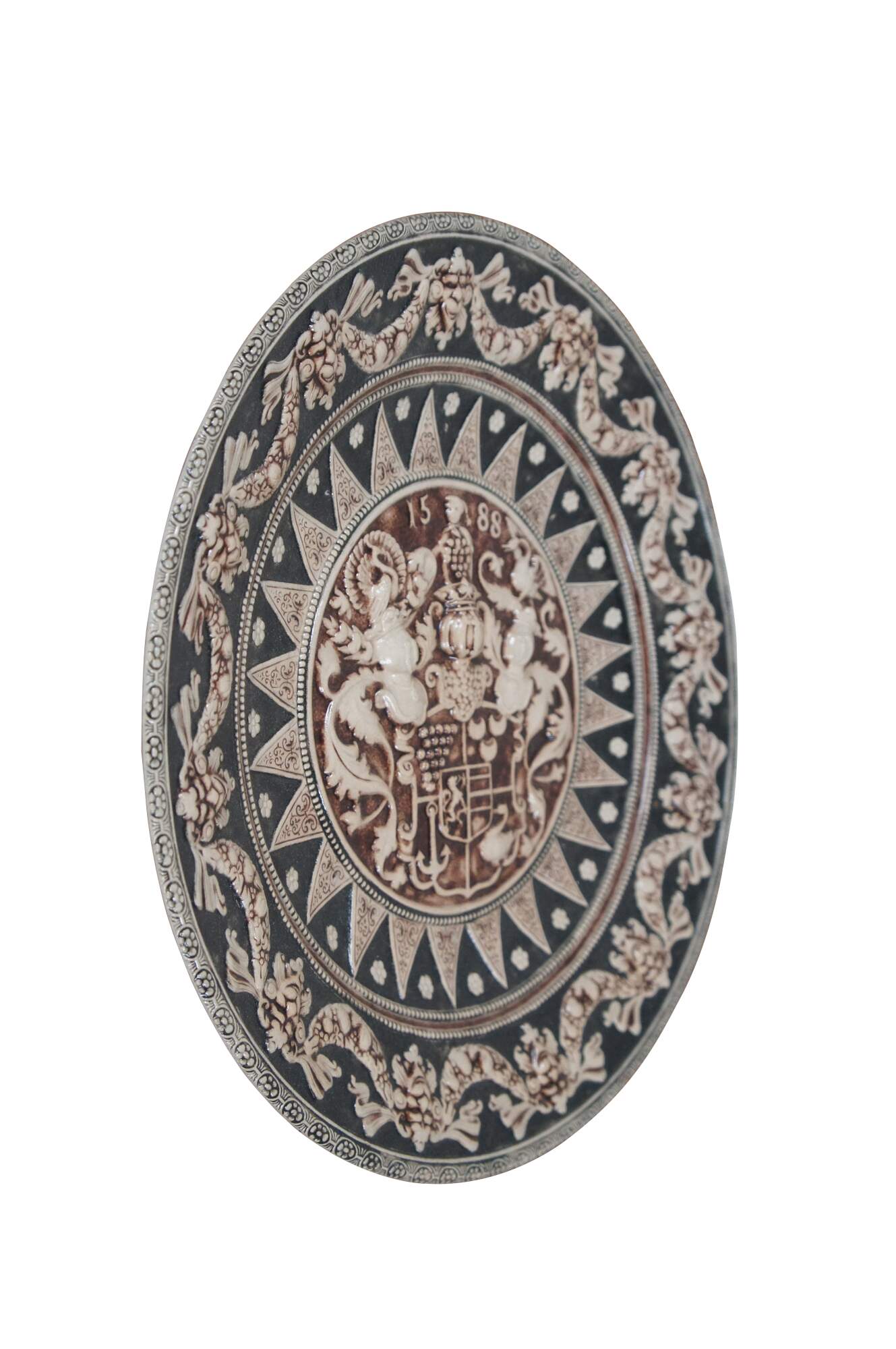 Mid to late 20th century German Westerwald salt glaze stoneware wall hanging plate / charger accented with deep charcoal and brown glaze, featuring a heraldic design in relief depicting an elaborate coat of arms festooned with plumed helmets, foliage, and the head of a jester flanked by the date 1588. Around this central motif is a decorative sunburst, patterned bands, and a garland of fruited swag and forest spirt / Green Man type faces. No maker's marks.