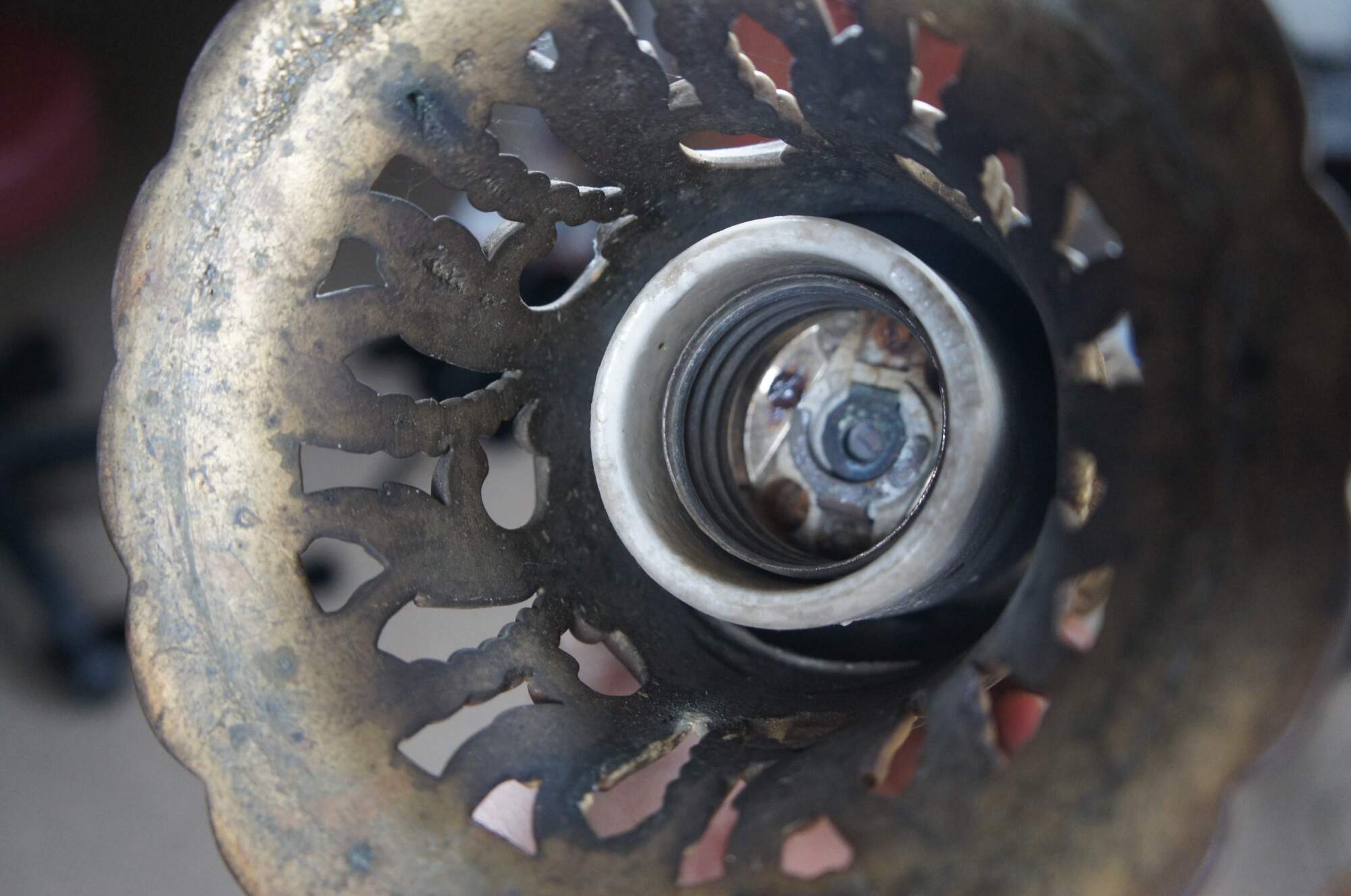 Good Overall - Gentle wear/tarnish; some scuffs to base decor; part of shade edge chipped; cord spliced together at base
