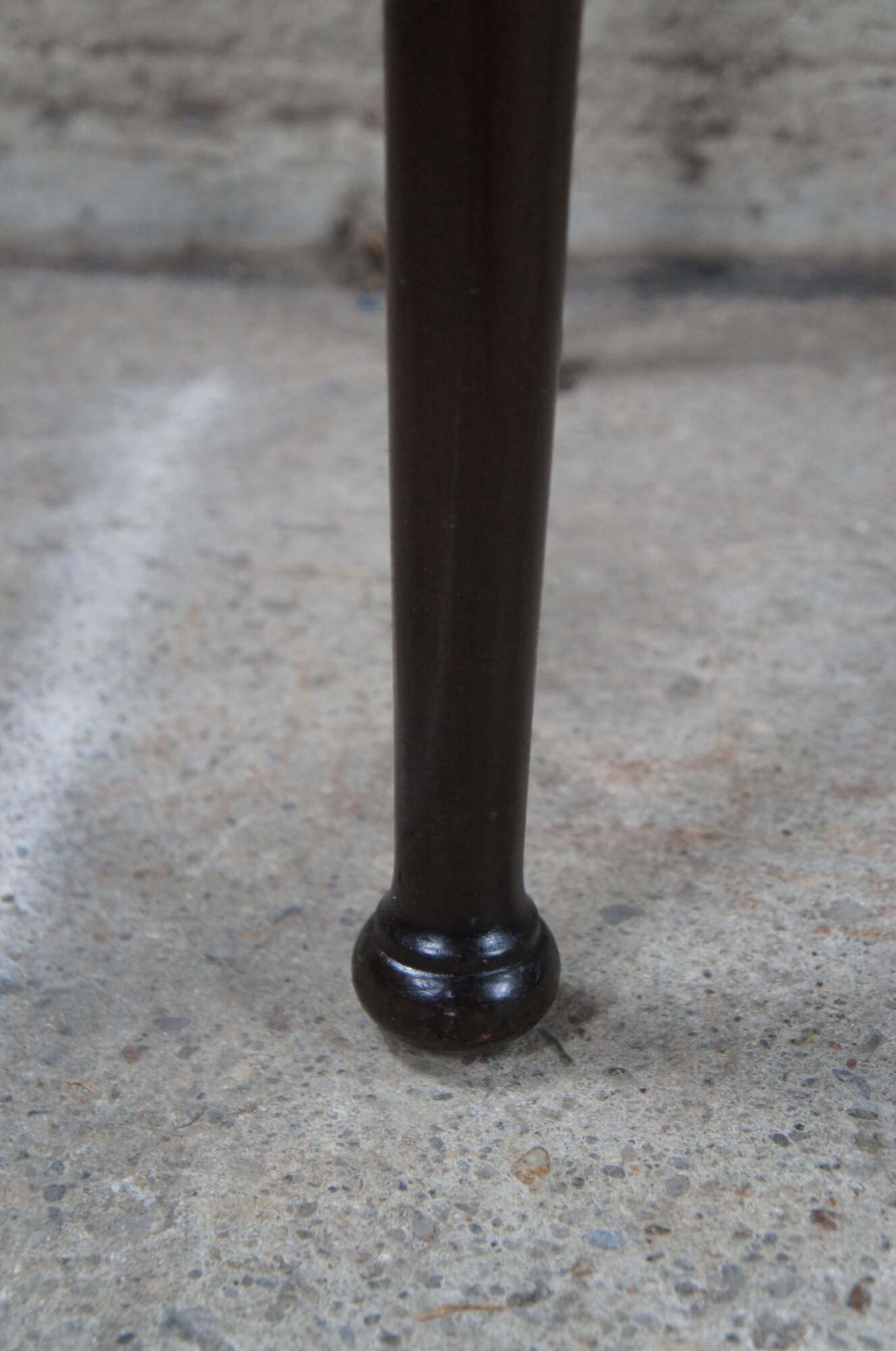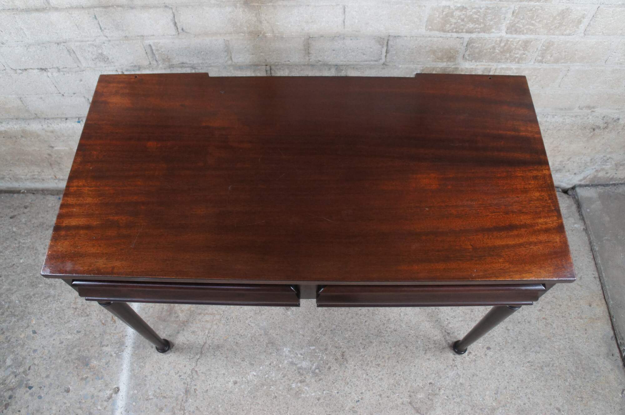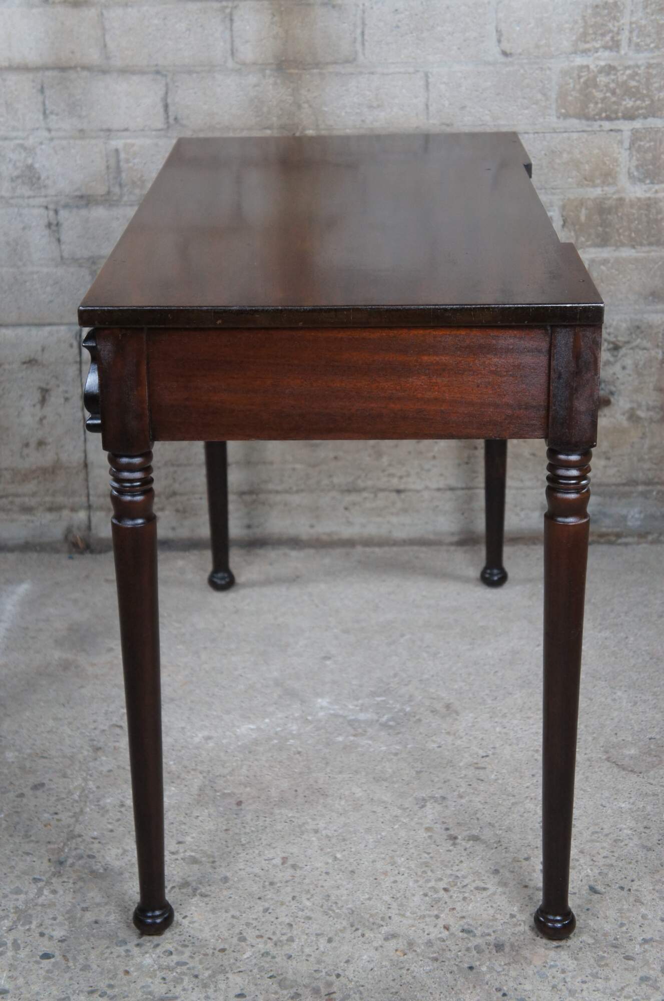 An antique American Empire style dressing table, circa 1930s. Originally featured a mirror along the back which was eventually removed to use as an office desk. Made from mahogany with two dovetailed drawers. The piece is supported by turned and tapered legs leading to bun feet.