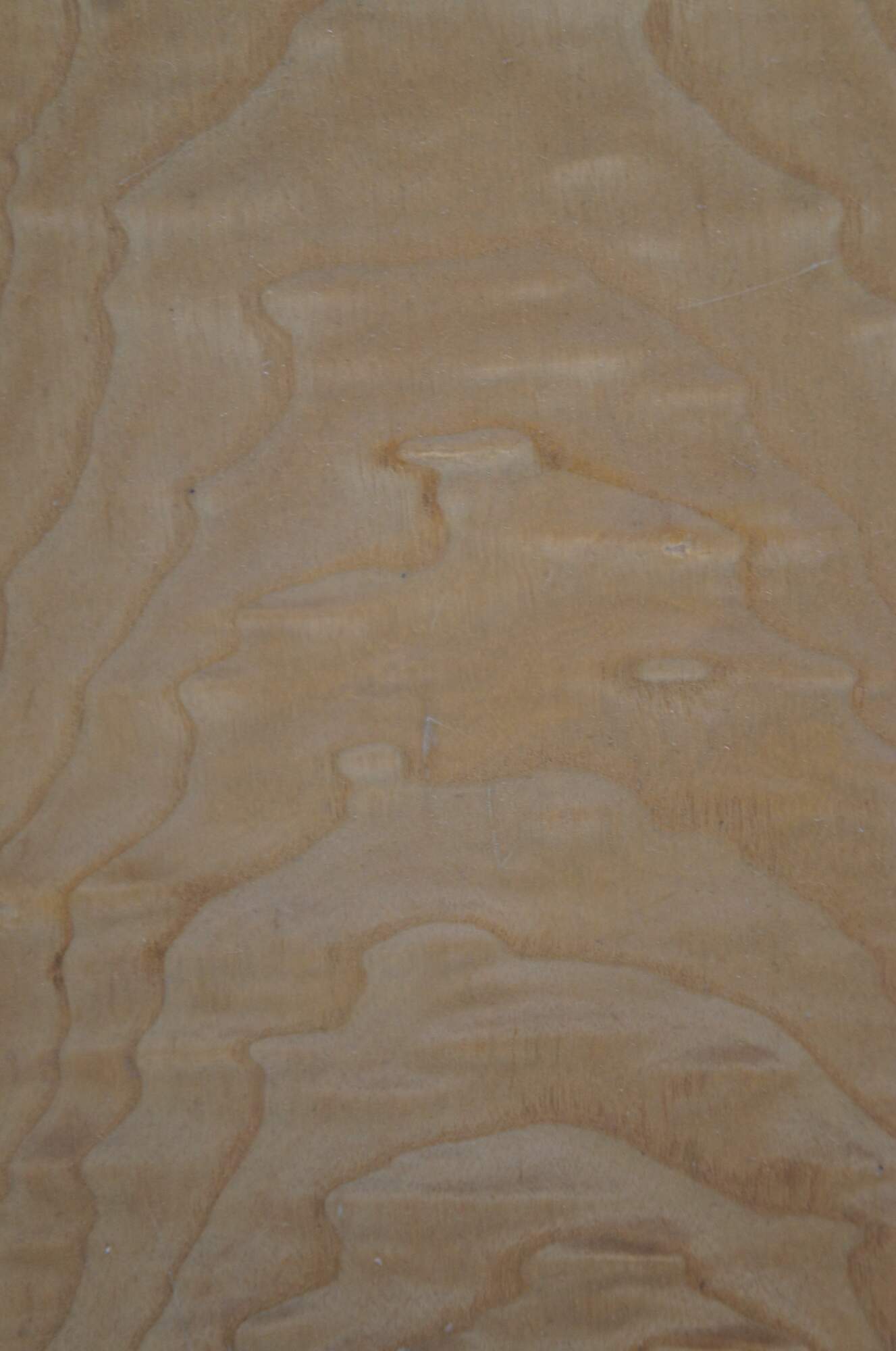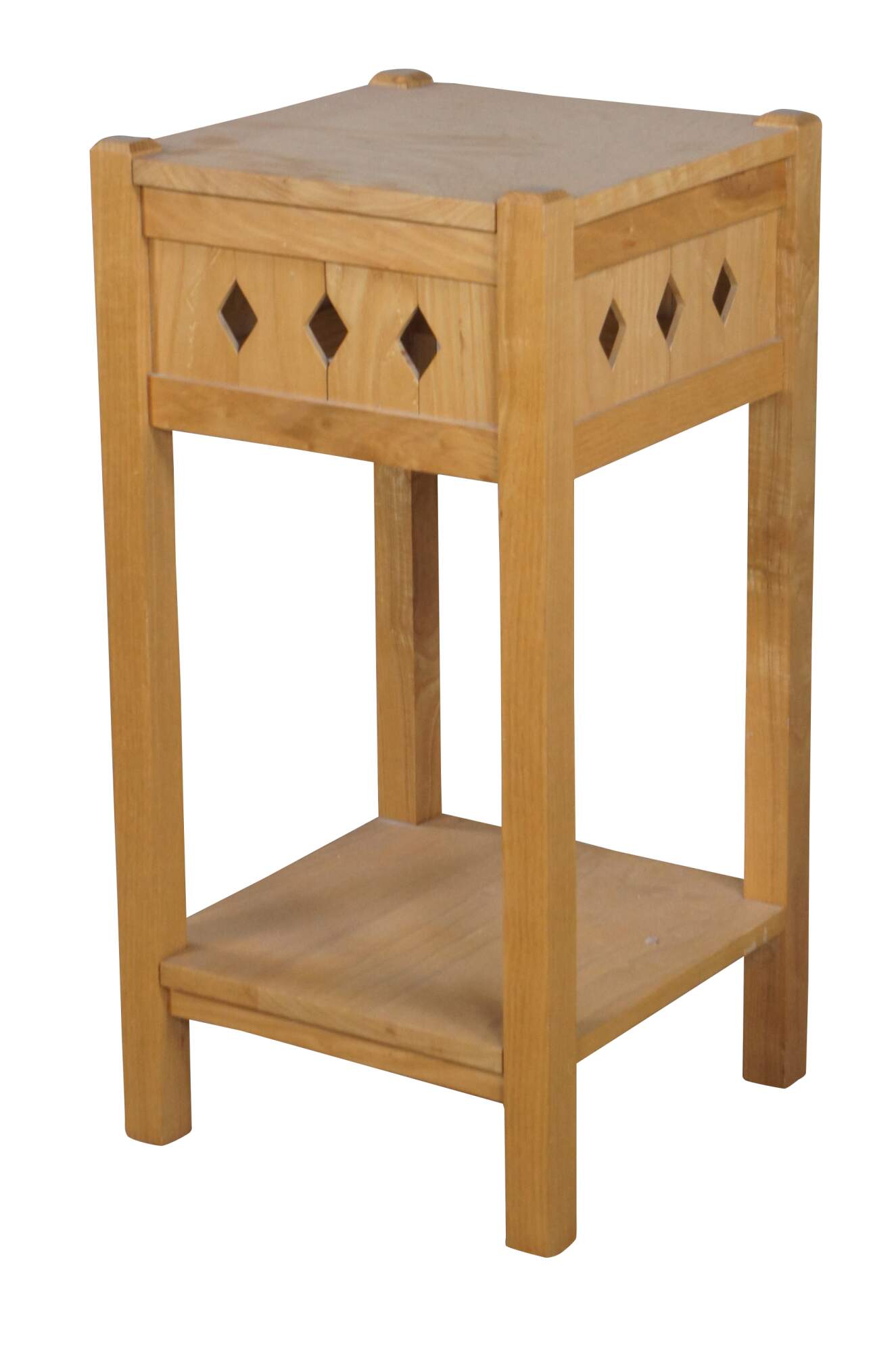 Pair of Late 20th century mission/arts & crafts inspired table by Matthew Baker of Dayton, Ohio. A square two tier design with diamond pierced apron. Made from Ash with a (quilted ash) curly ash top. In the manner of California Arts & Crafts. After the Douglas Fir Square Side Table, a copy of Brooks Furniture Co design.