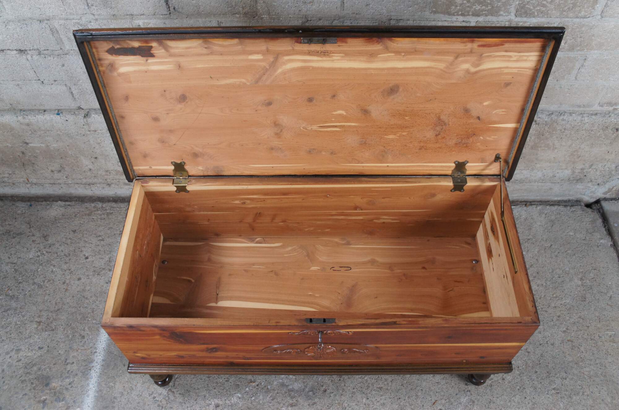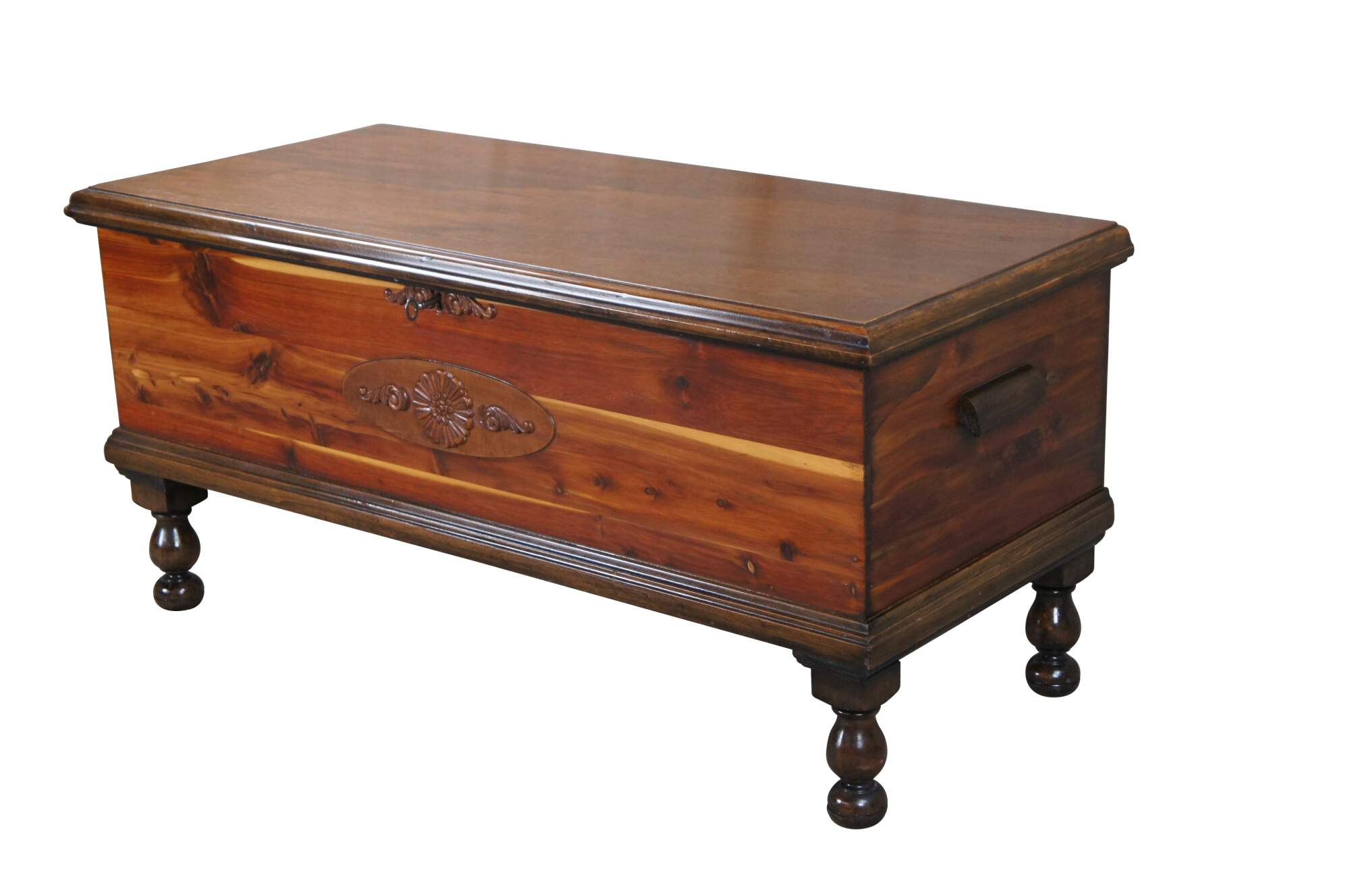 An antique cedar trunk by E.R. Co, circa 1940s. Features a primitive American Country design with footed base, carved embellishments along the front and handles at the sides. The trunk is hinged and cedar lined. Part of E.R. Co's Forest Park Line.
