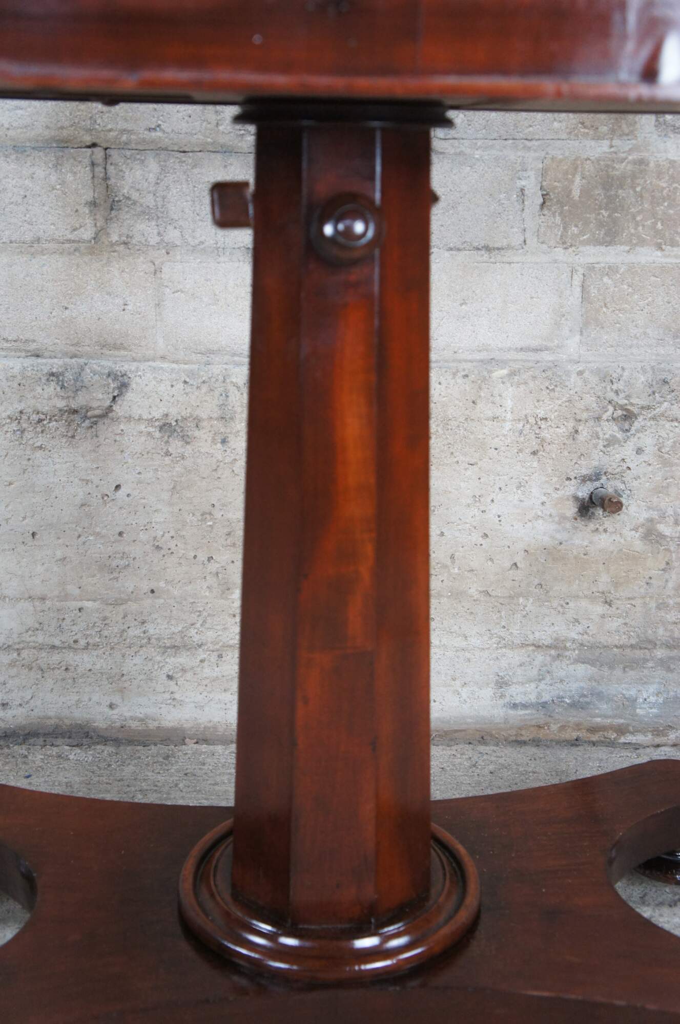 An impressive William IV era mahogany Invalids table. Features a rectangular sliding top with a pair of ratcheted reading slopes to one side, over an adjustable octagonal stem above a shaped quadripartite base over flared bun feet with metal casters. Each slope has a small hole with brass insert towards the base for tray / reading shelf attachments. The tables versatile size allows for use as a console, lectern or duet music stand.