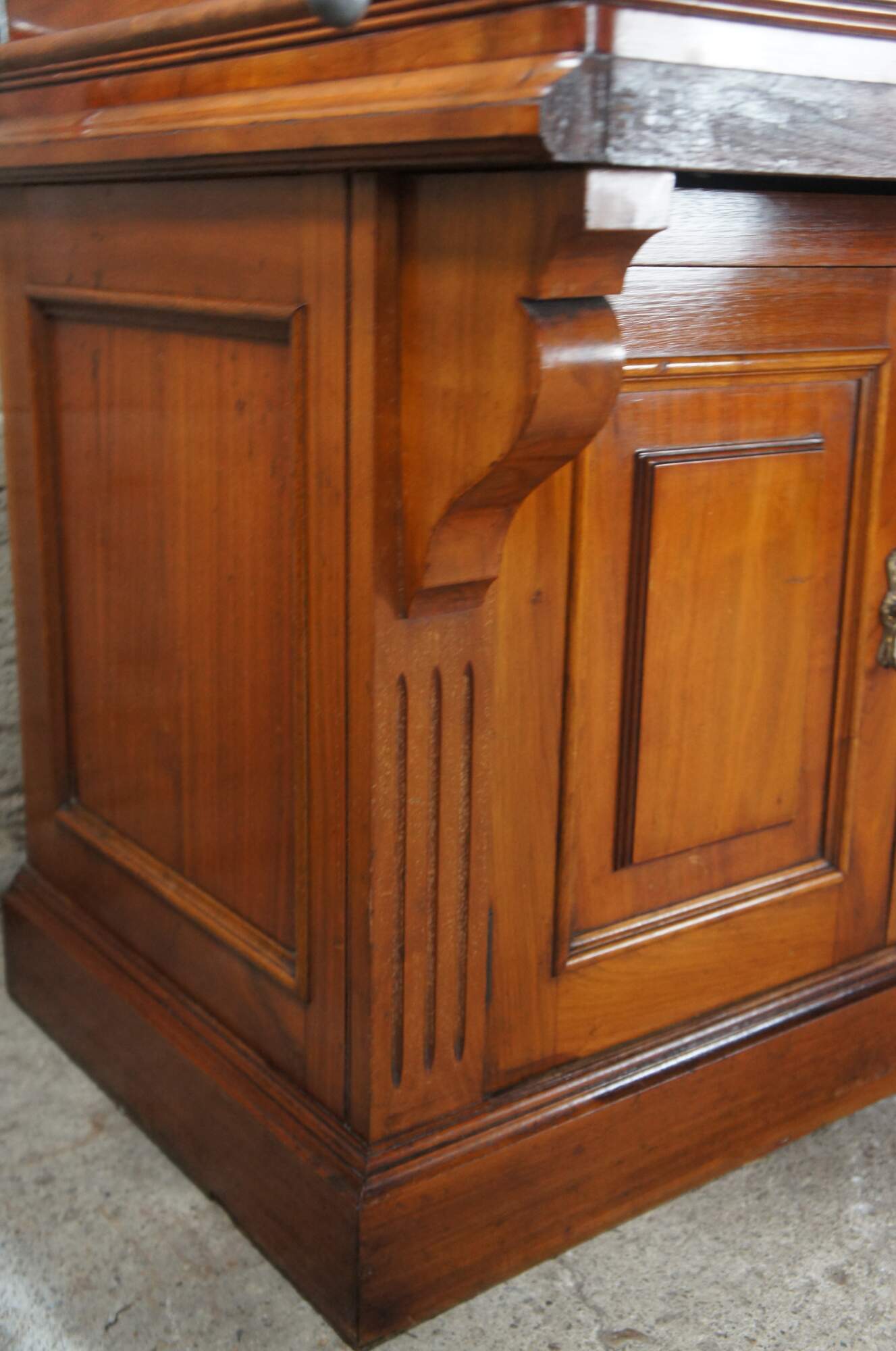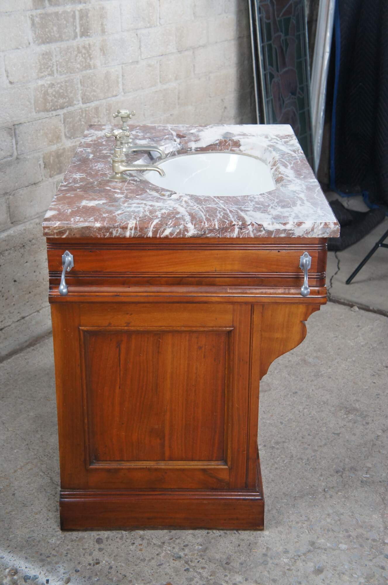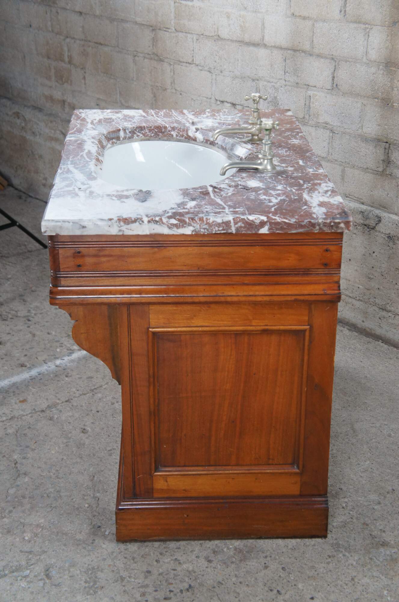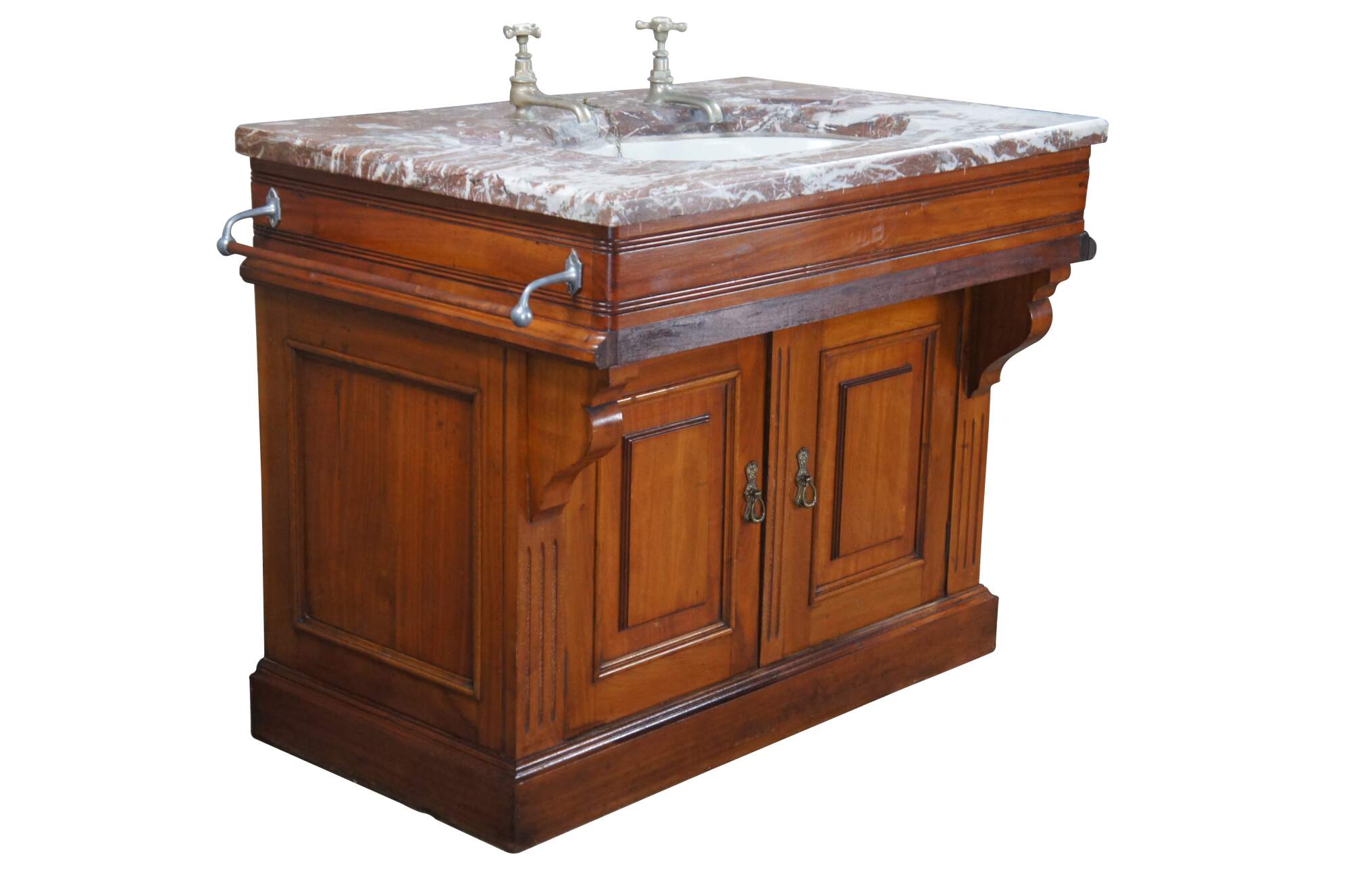 An exceptional Victorian Era bathroom vanity. Made from walnut with red and white vein marble top. Features a porcelain delta sink with hot and cold spigot. The cabinet has a traditional form with spandrels leading to fluting along the stiles and paneled doors that open via brass hardware with rear catch. Includes towel bar off the left side