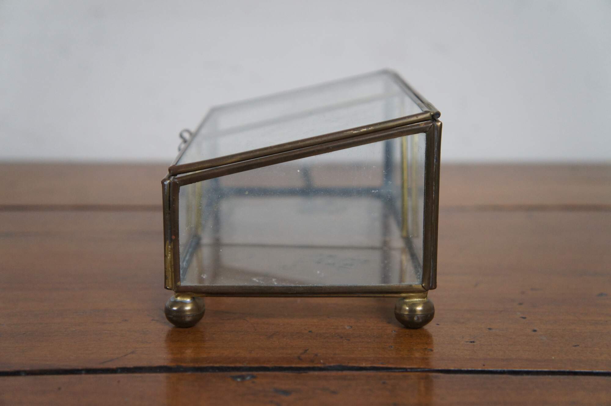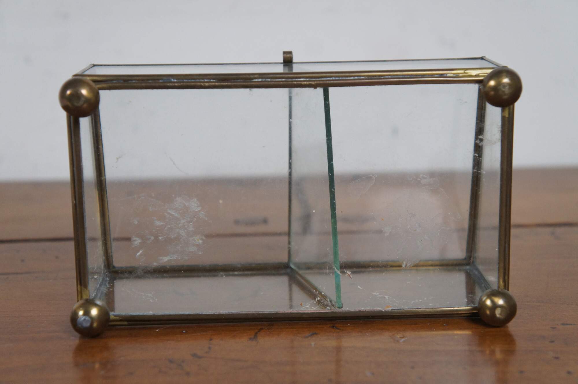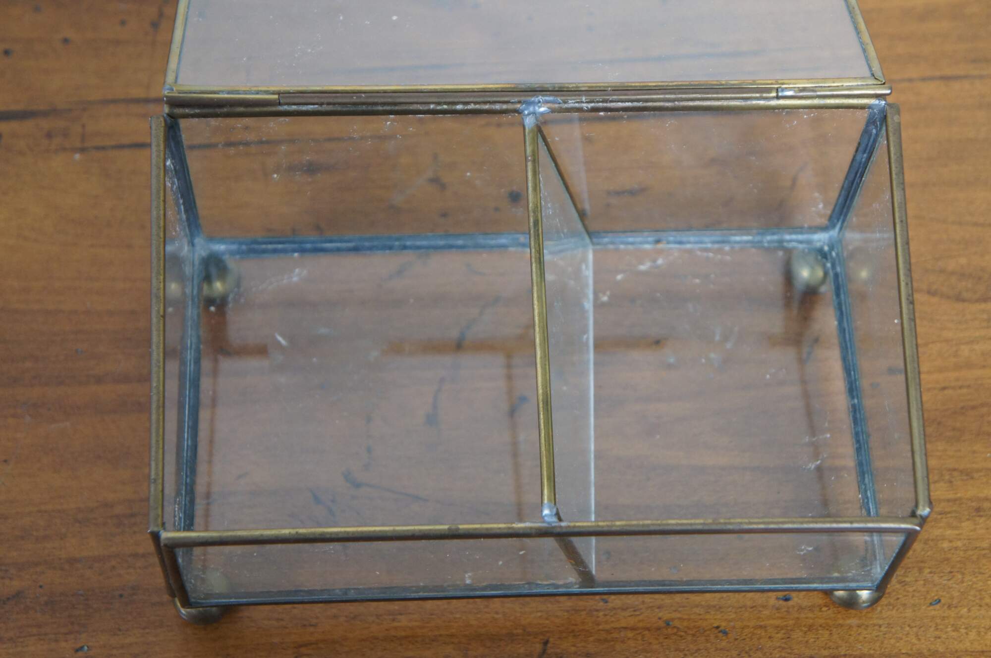 Vintage brass framed glass trinket / display box with round feet and divided interior.