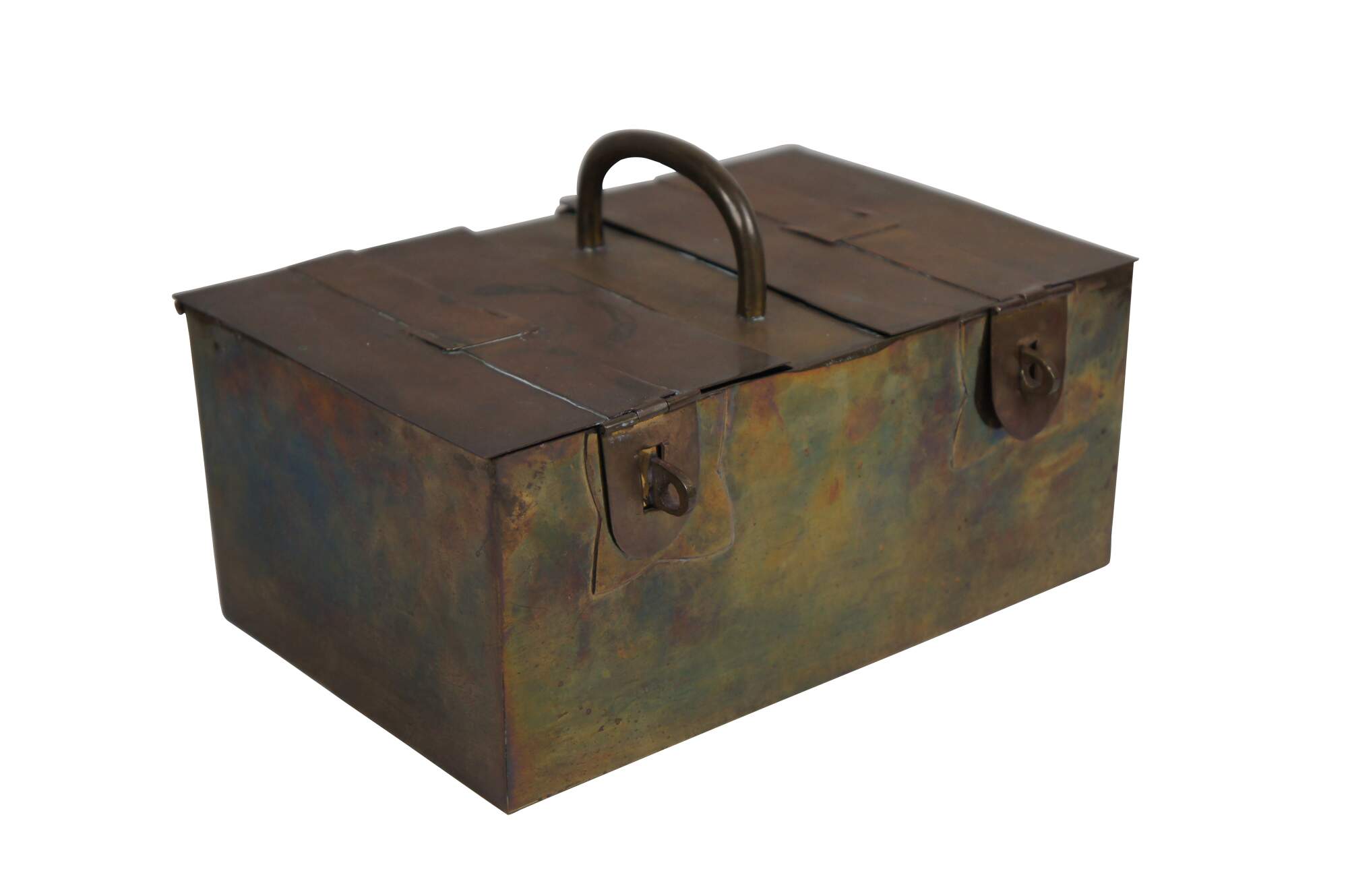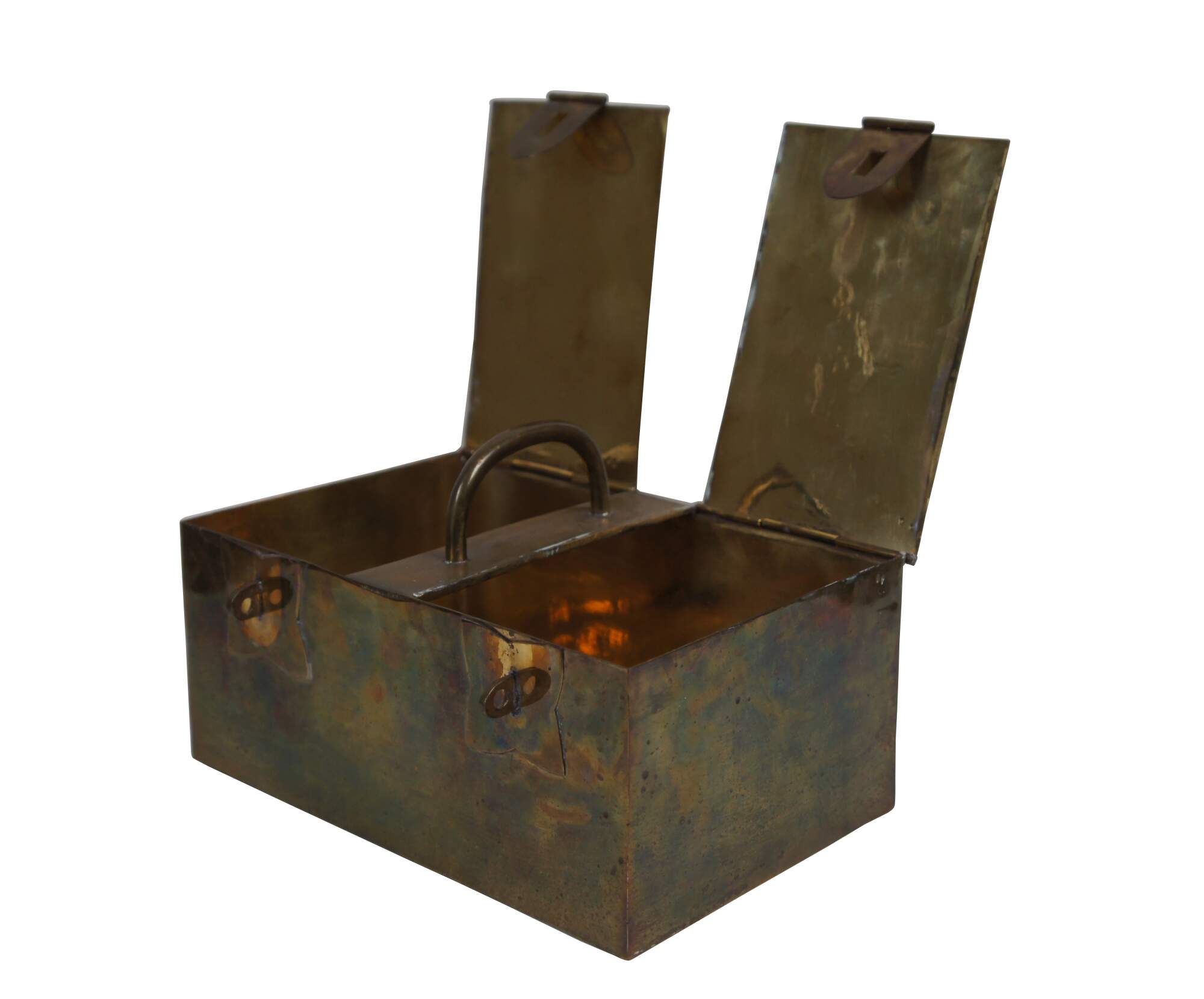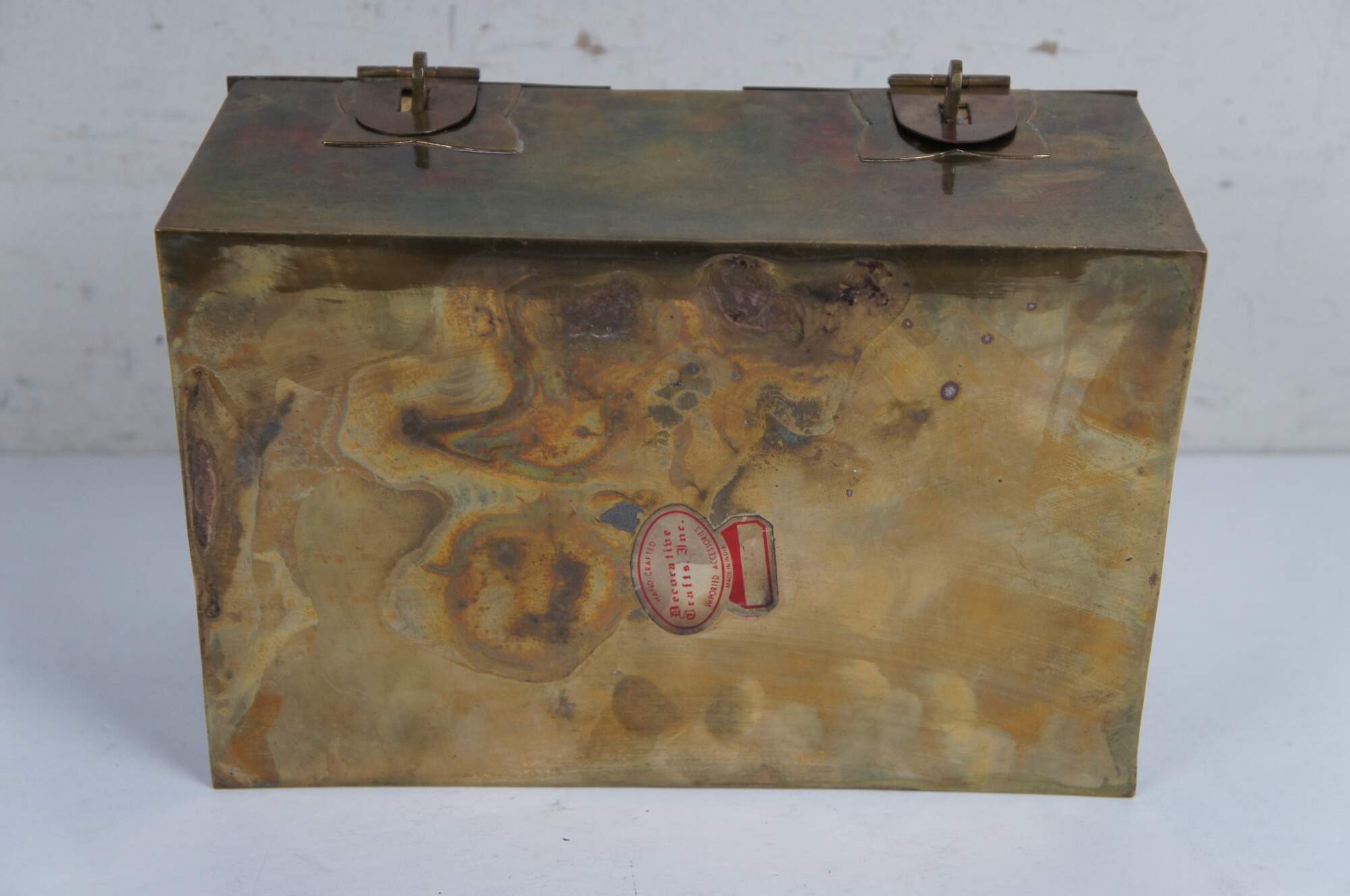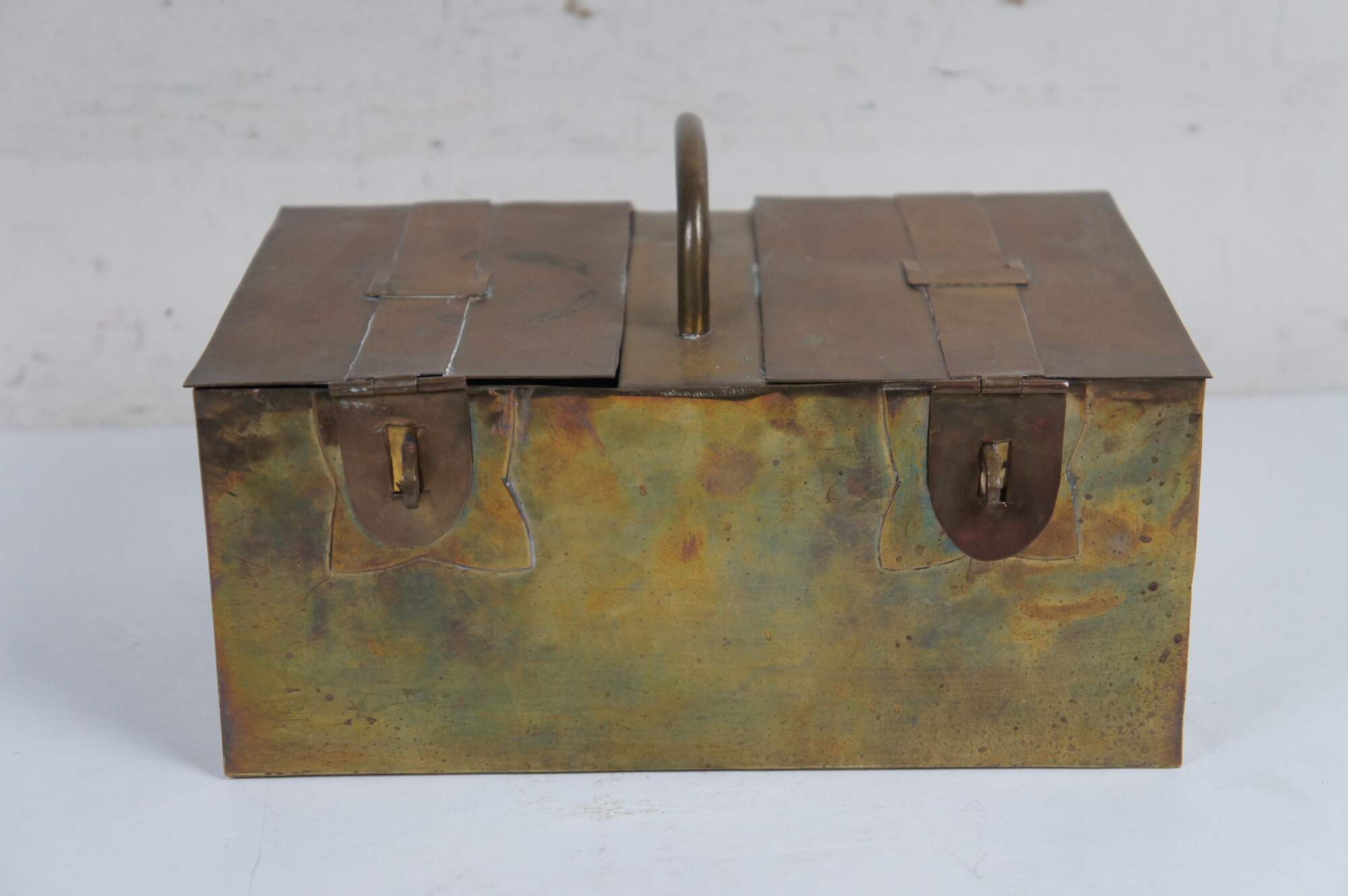 Vintage Decorative Crafts Inc hand crafted brass strong box / lock box. Rectangular form with fixed handle at center of top, two hinged lids with padlock hasps and decorative imitation straps, and single interior compartment. Made in India.