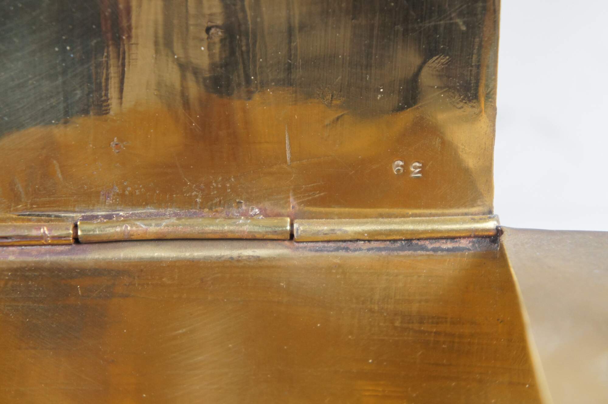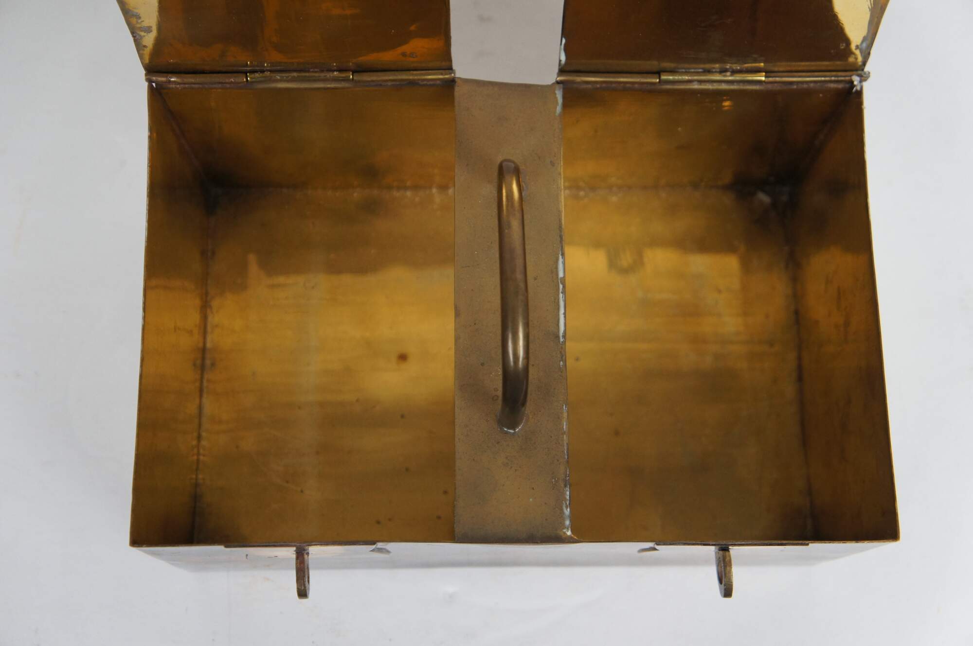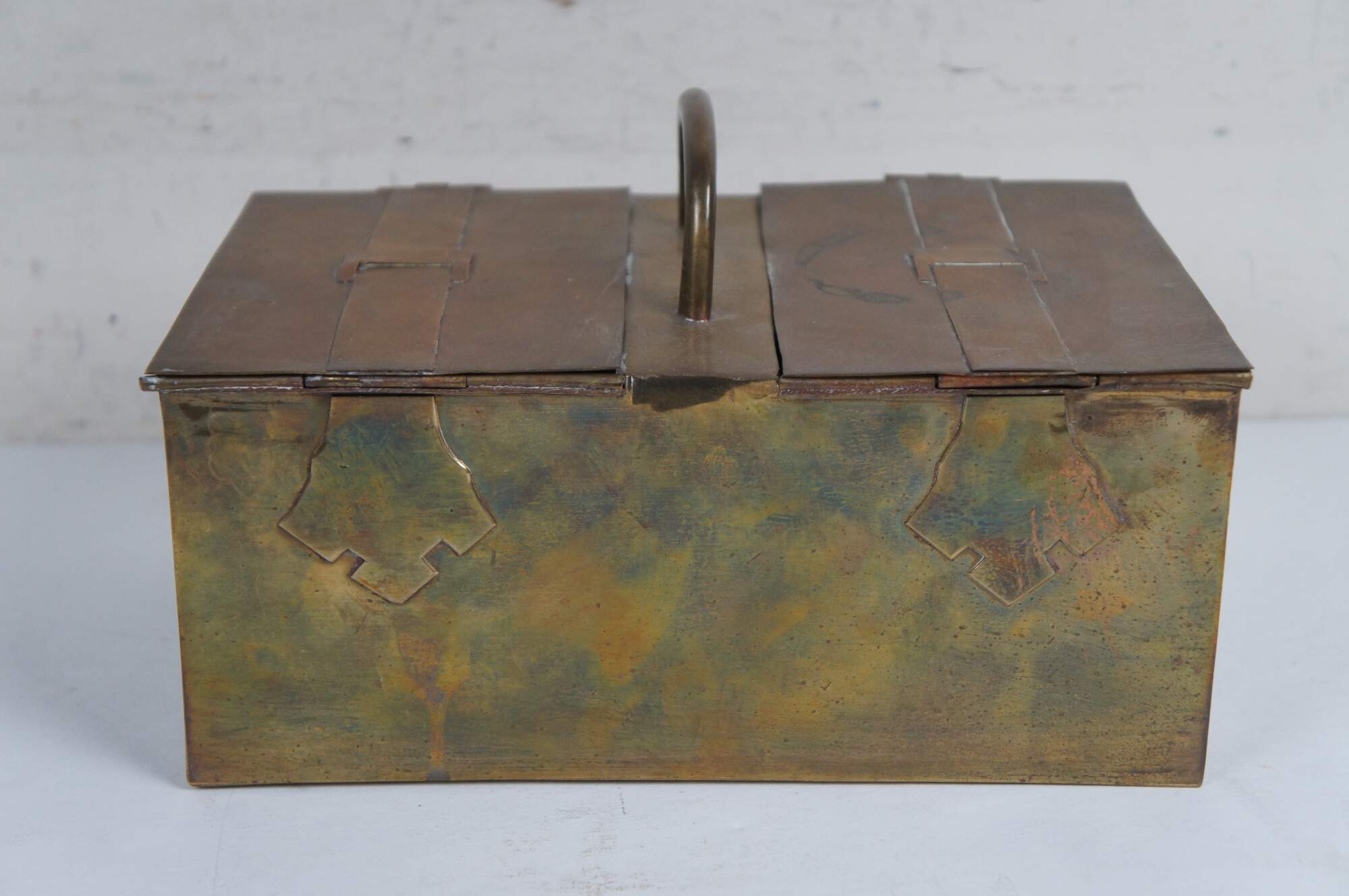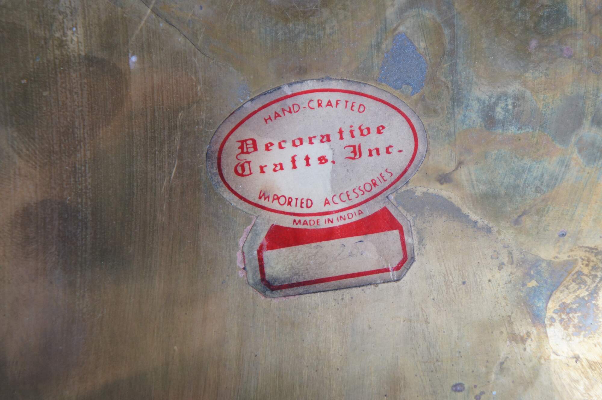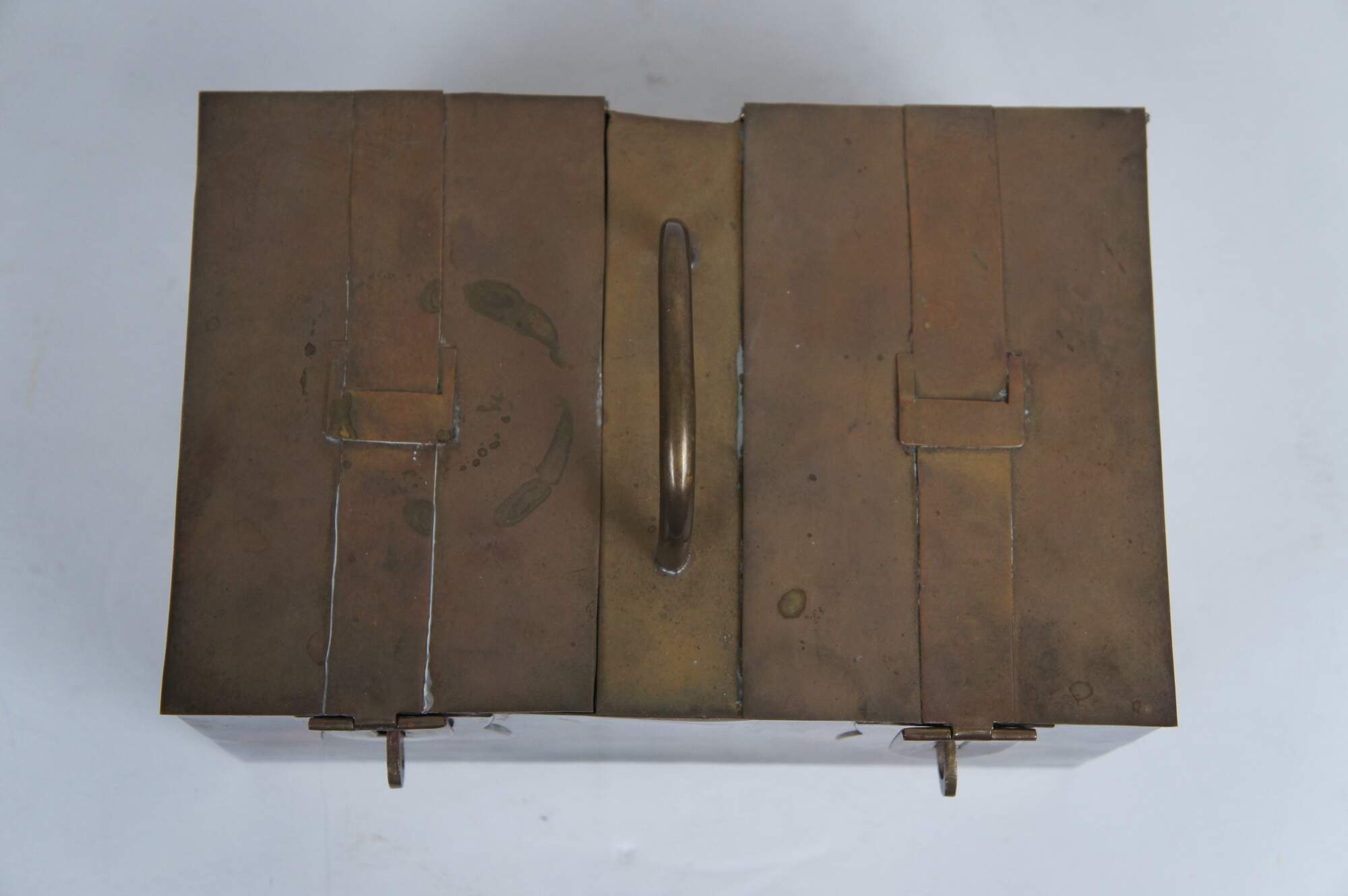 Vintage Decorative Crafts Inc hand crafted brass strong box / lock box. Rectangular form with fixed handle at center of top, two hinged lids with padlock hasps and decorative imitation straps, and single interior compartment. Made in India.