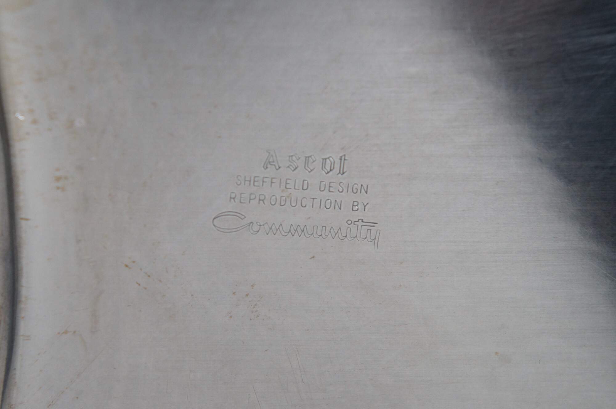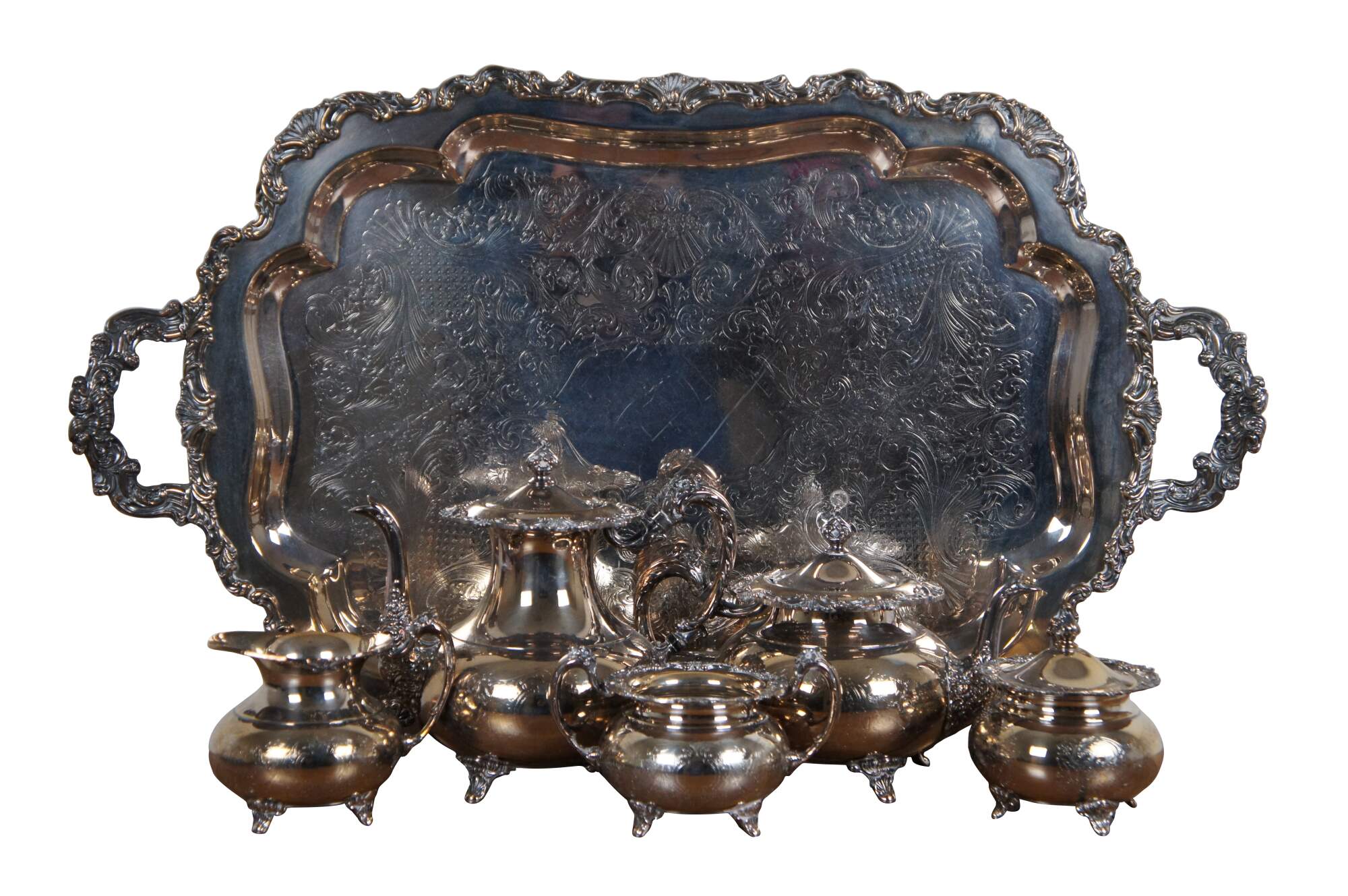 Mid century 6 piece Sheffield Design Reproduction by Community silver plate tea set, including a large handled / footed tray, tea pot and coffee pot with hinged lids, cream pitcher, waste pot, and lidded sugar bowl. Decorated with molded and etched scallops / florals.