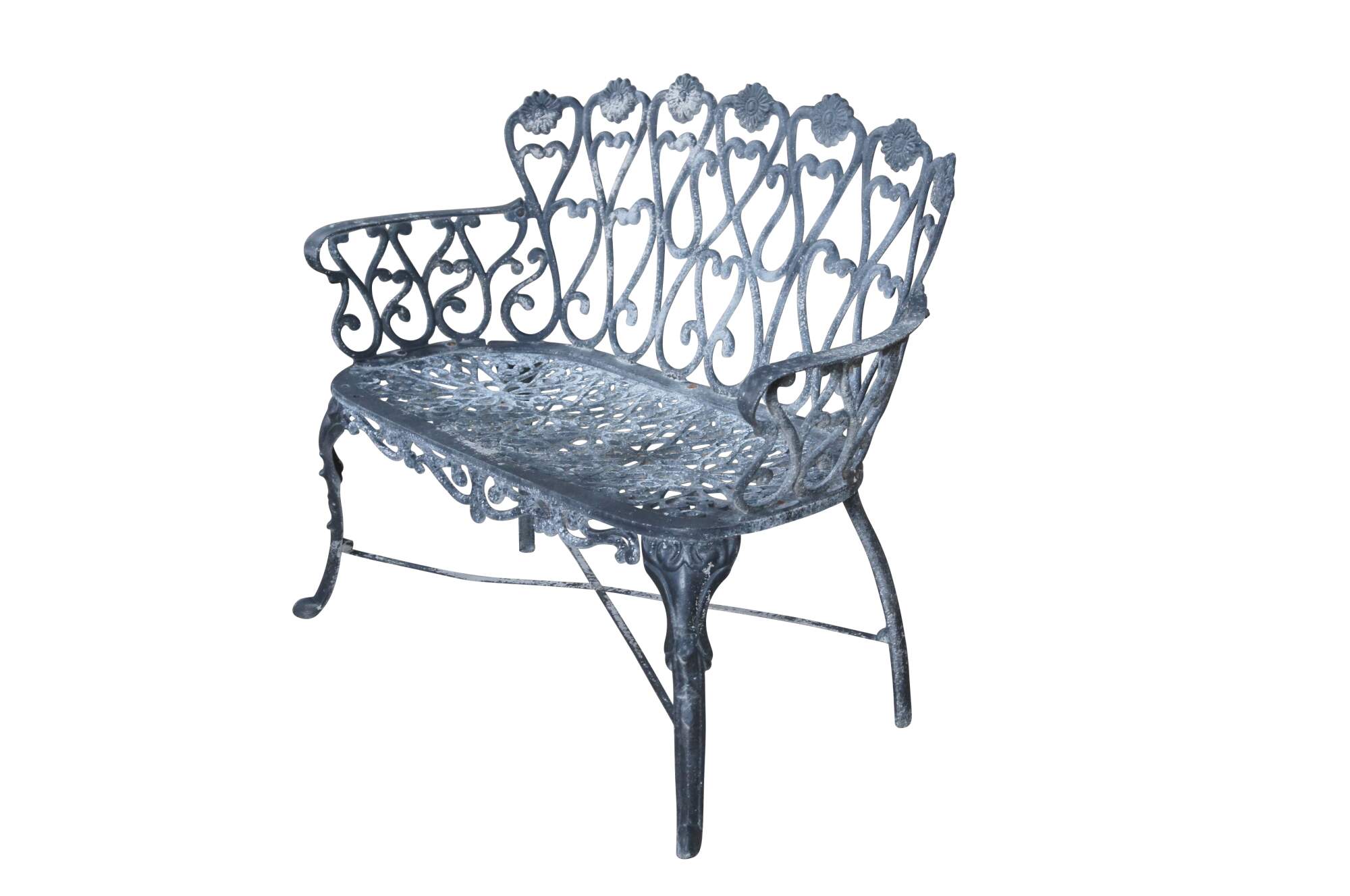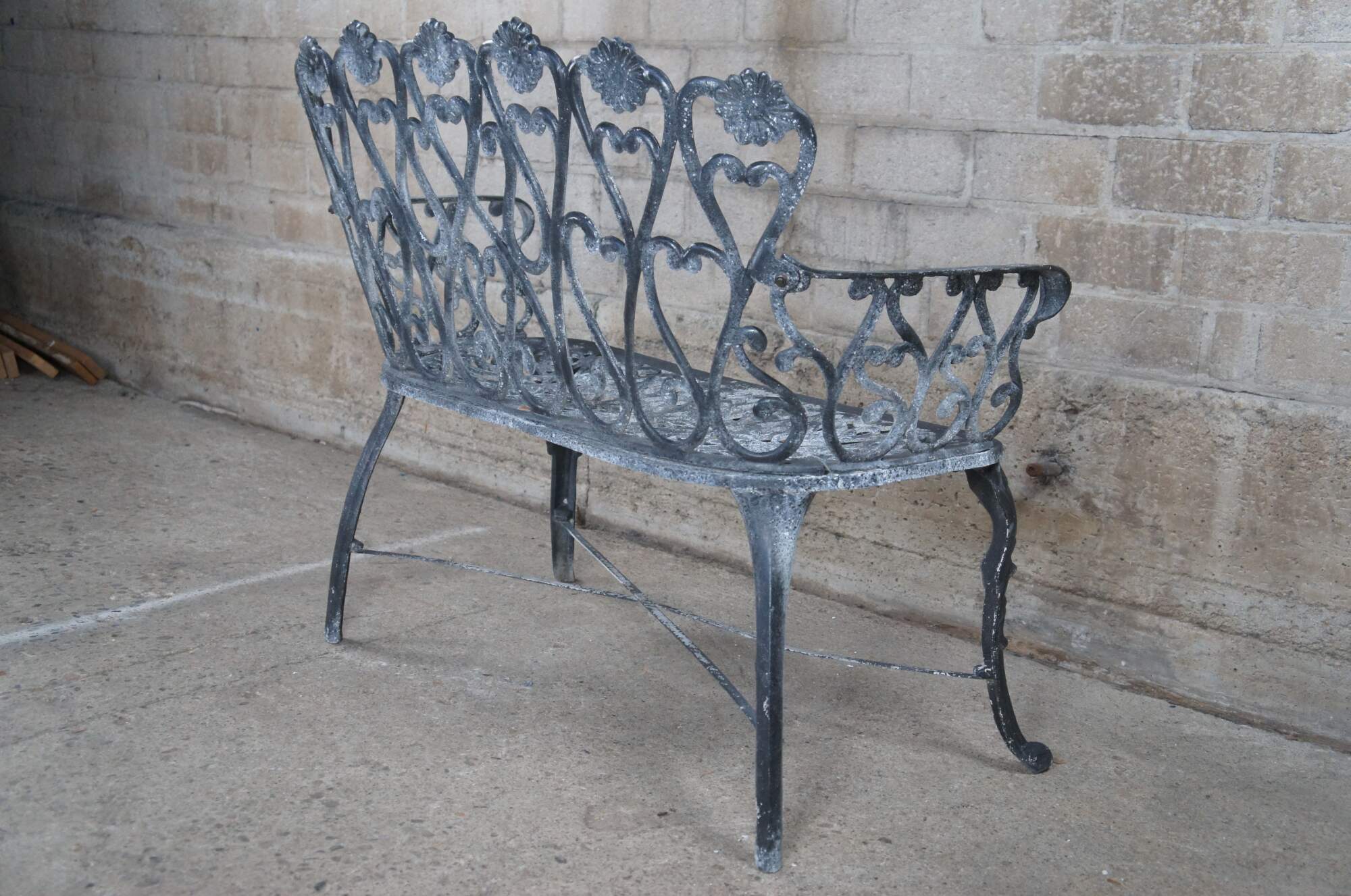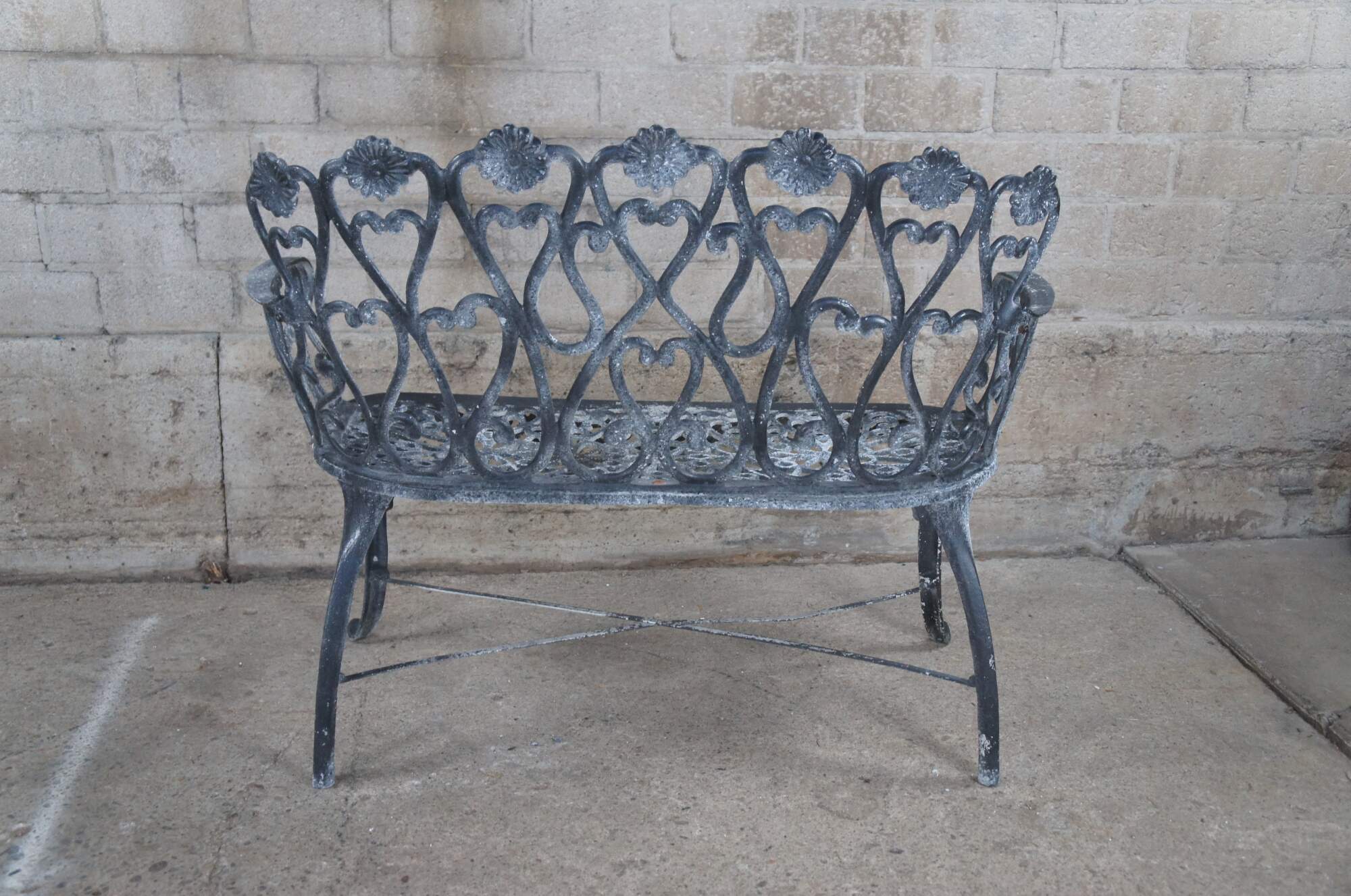 A cast aluminum outdoor garden settee with prominent scrolls, floral medallions, x-form stretcher and resting on front pad feet.