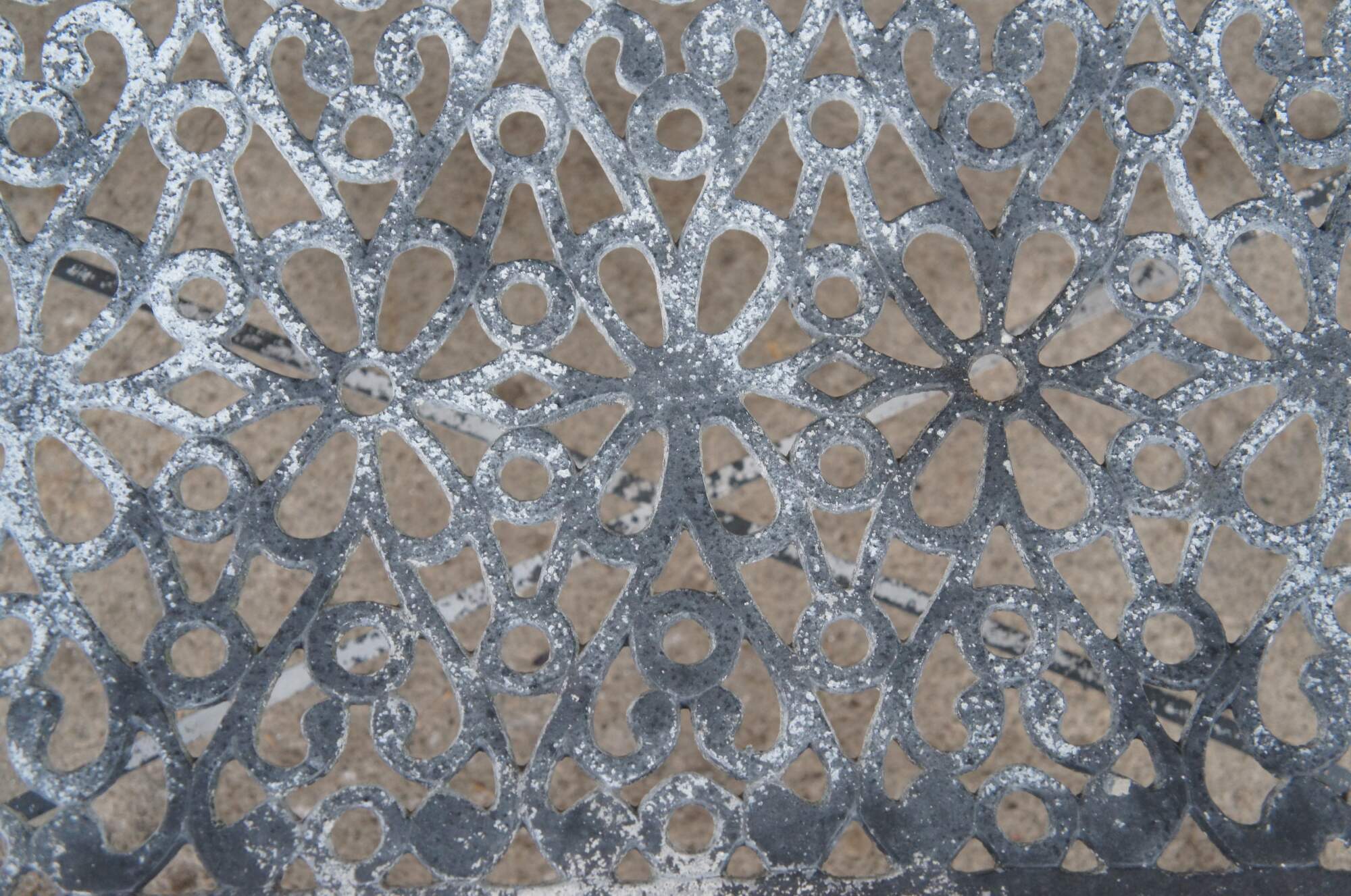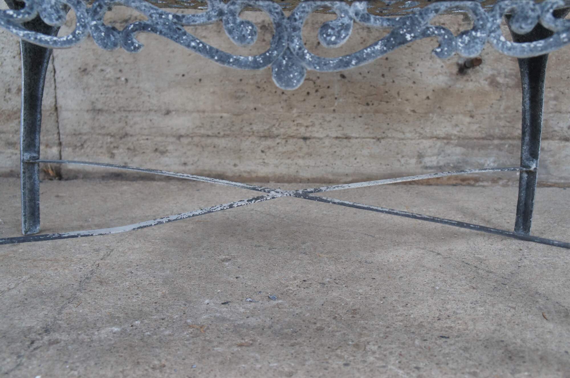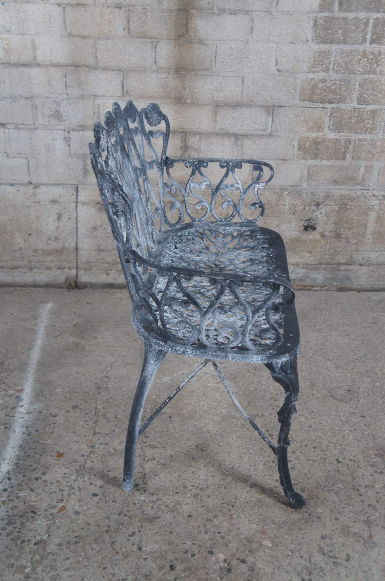 A cast aluminum outdoor garden settee with prominent scrolls, floral medallions, x-form stretcher and resting on front pad feet.