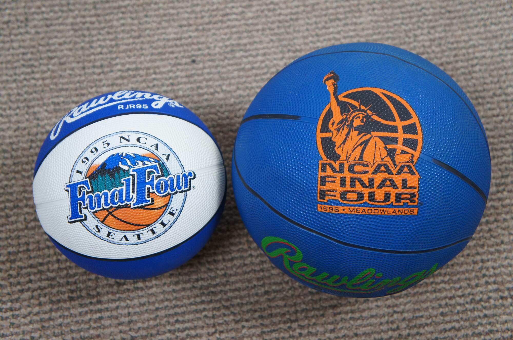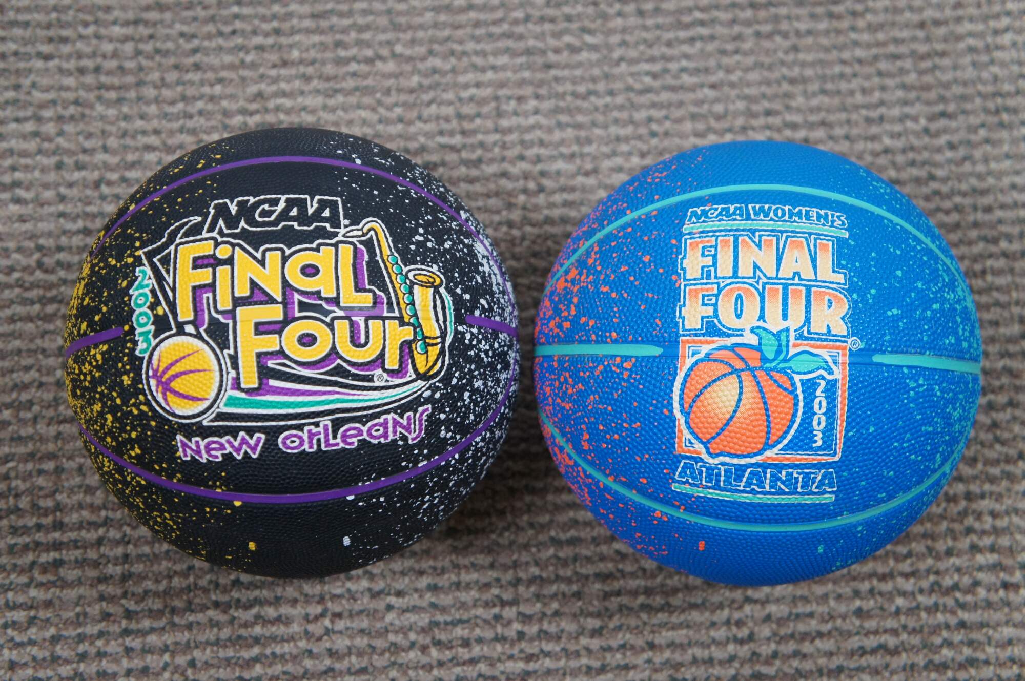 Large rare lot of 21 NCAA Final Four Tournament souvenir basketballs. Years represented: 1991 Indianapolis, 1993 New Orleans, 1995 Seattle, 1996 Meadowlands, 2001 Twin Cities (2 designs), 2002 Atlanta, 2003 (mens New Orleans and womens Atlanta), 2004 San Antonio (2 designs), 2005 St Louis, 2006 Indianapolis, 2007 (mens Atlanta and womens Cleveland), 2008 San Antonio, 2009 Detroit, 2014 North Texas, 2016 Houston, 2019 Minneapolis. One basketball was not pictured, its a 2015 Indianapolis Final Four mini ball.