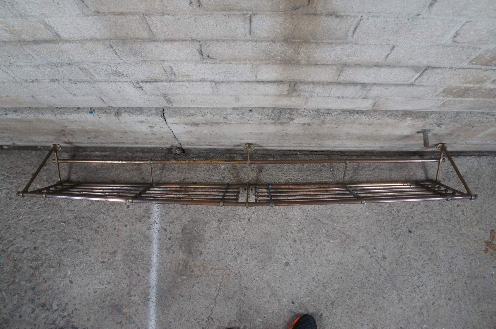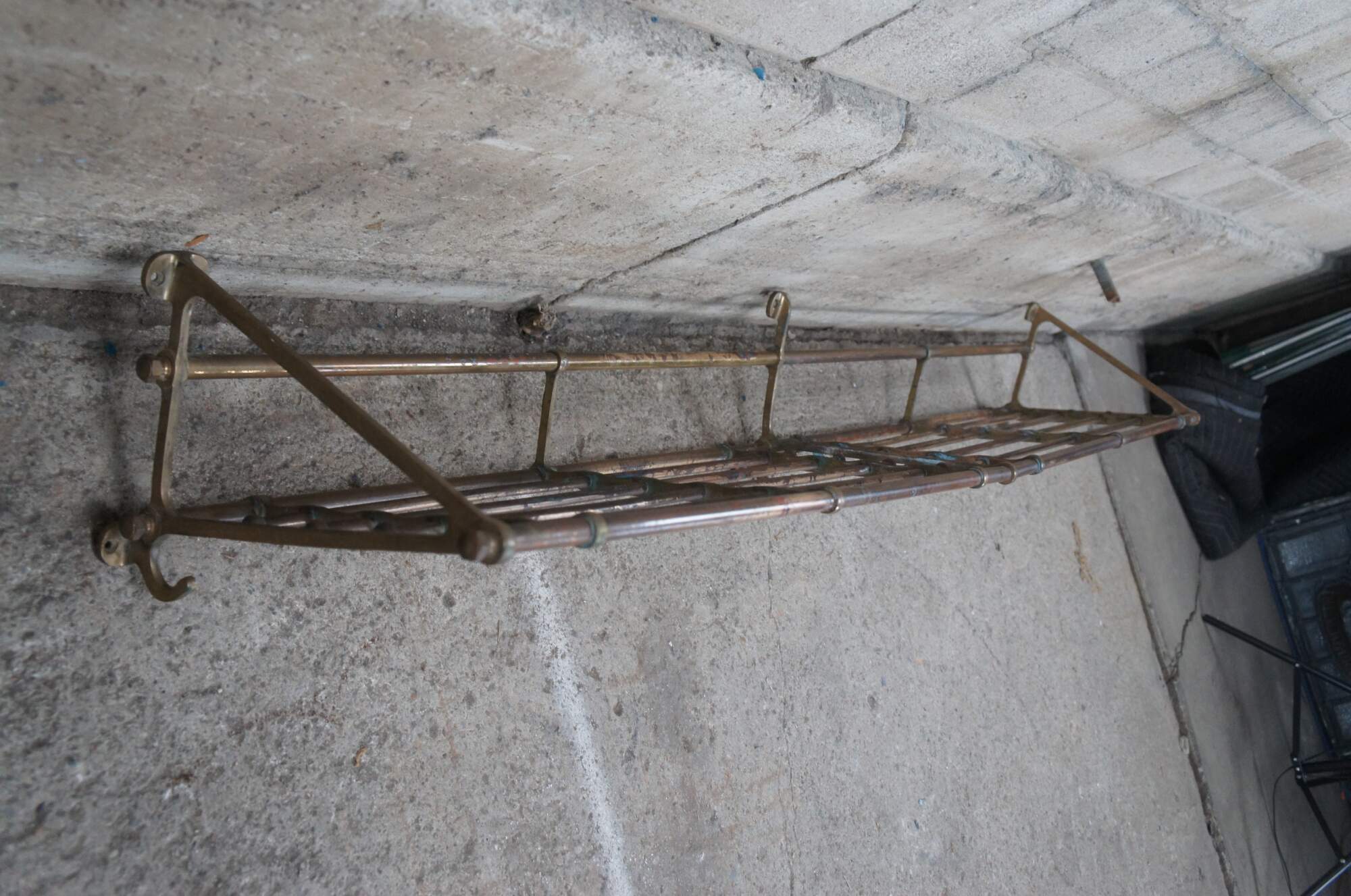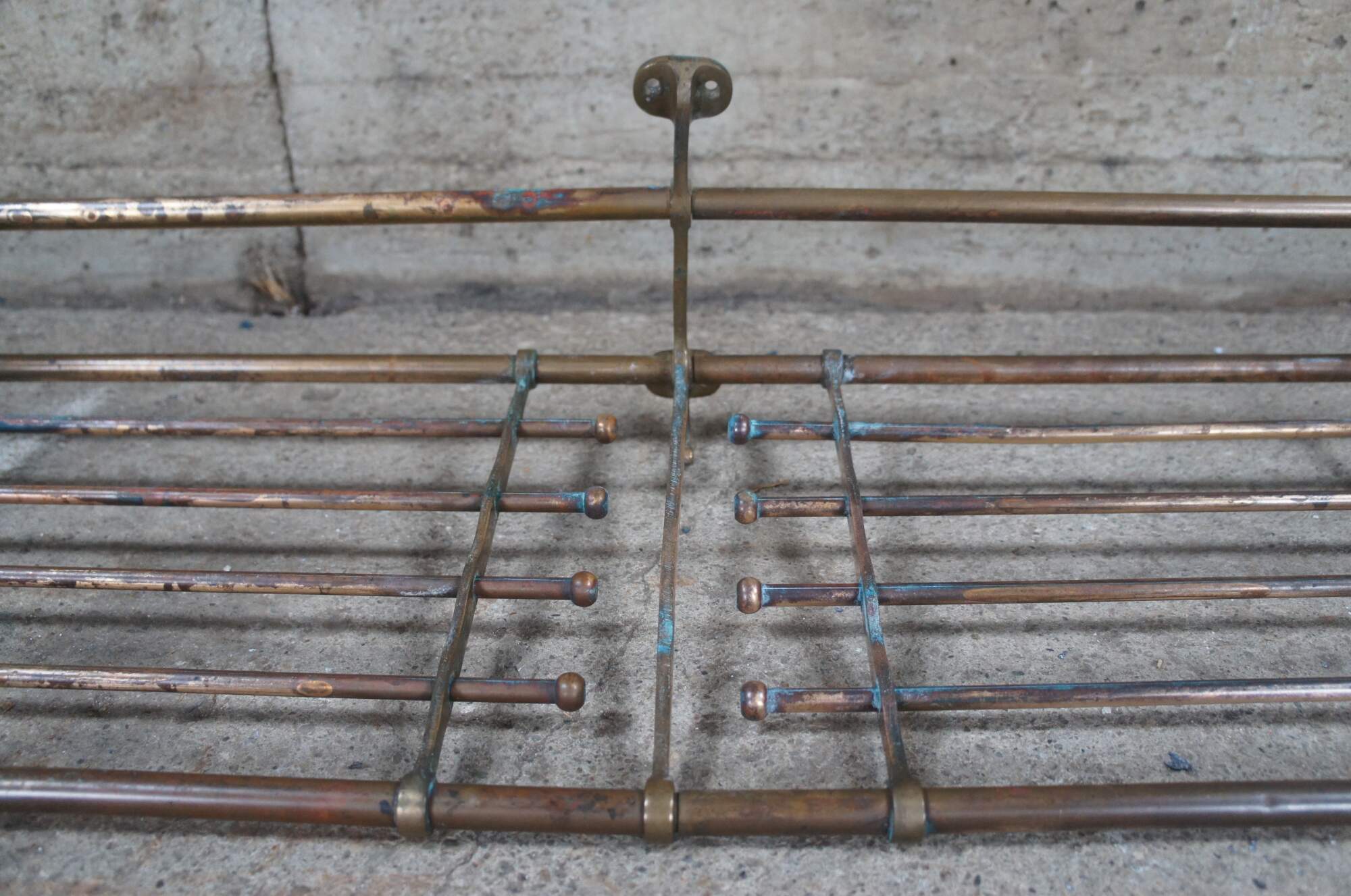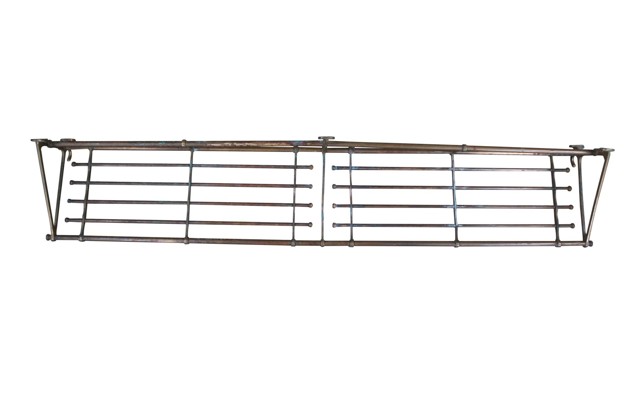 An antique wall mount tubular brass train luggage rack. Features beautiful lines and patina. Includes lower hooks along the ends for garments. These racks were often used on The Union Pacific Railroad