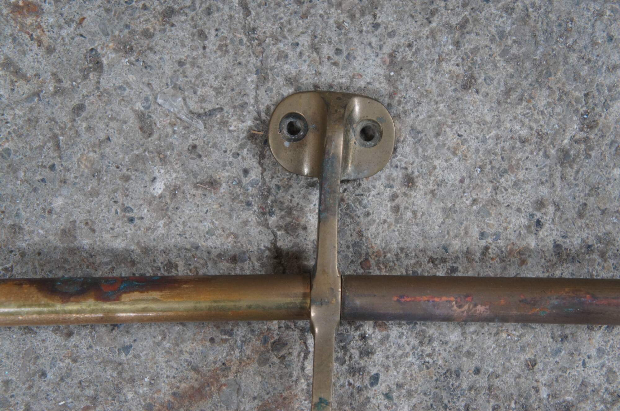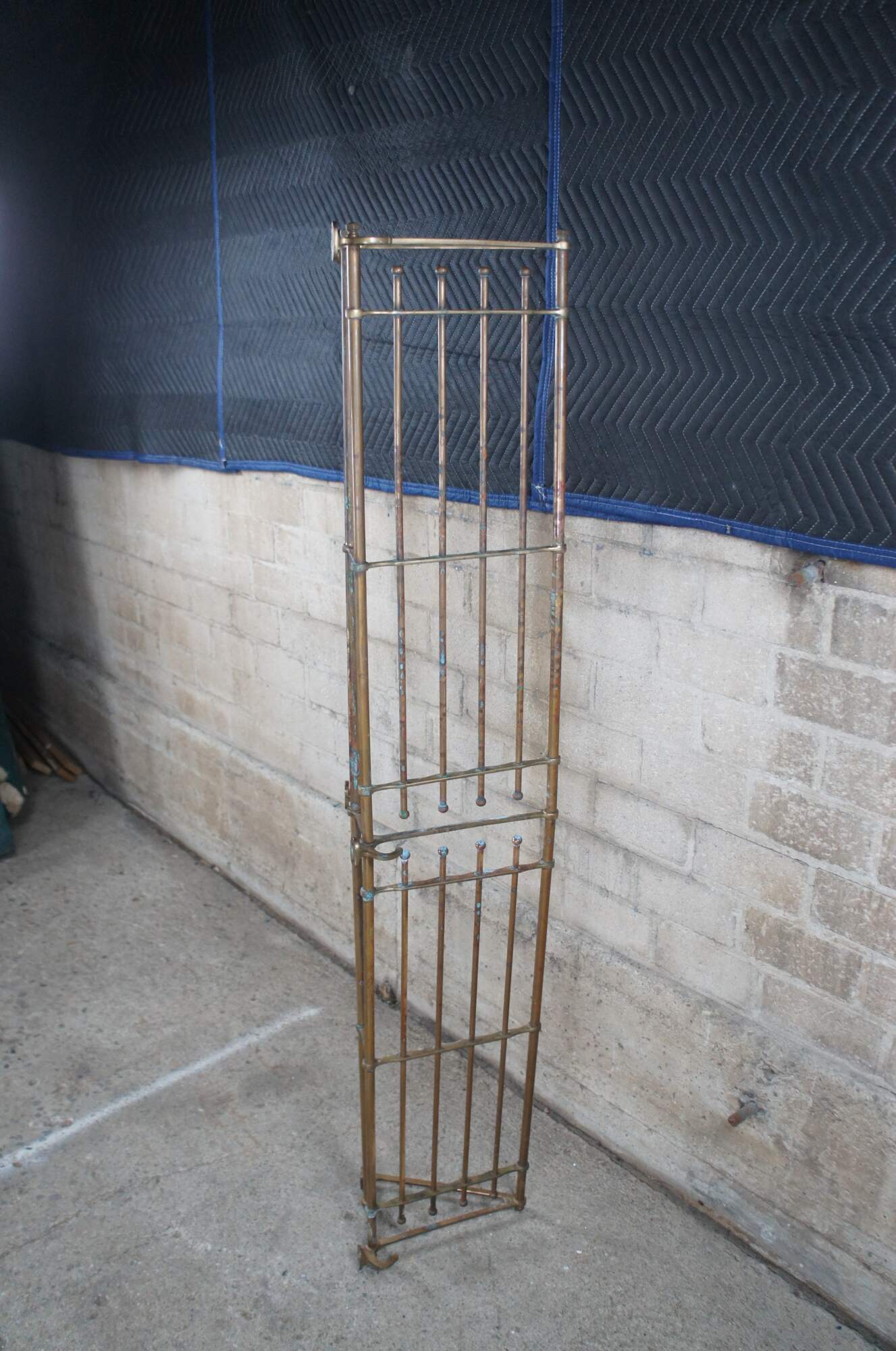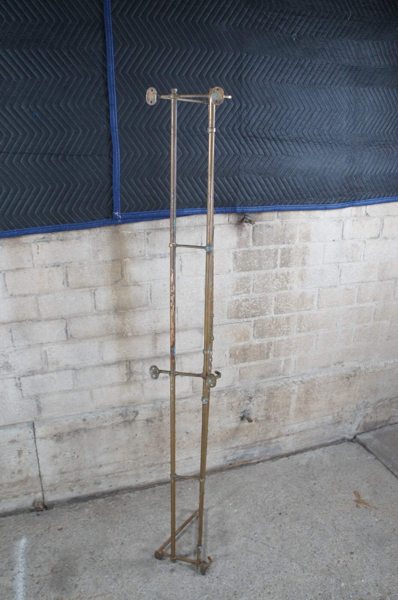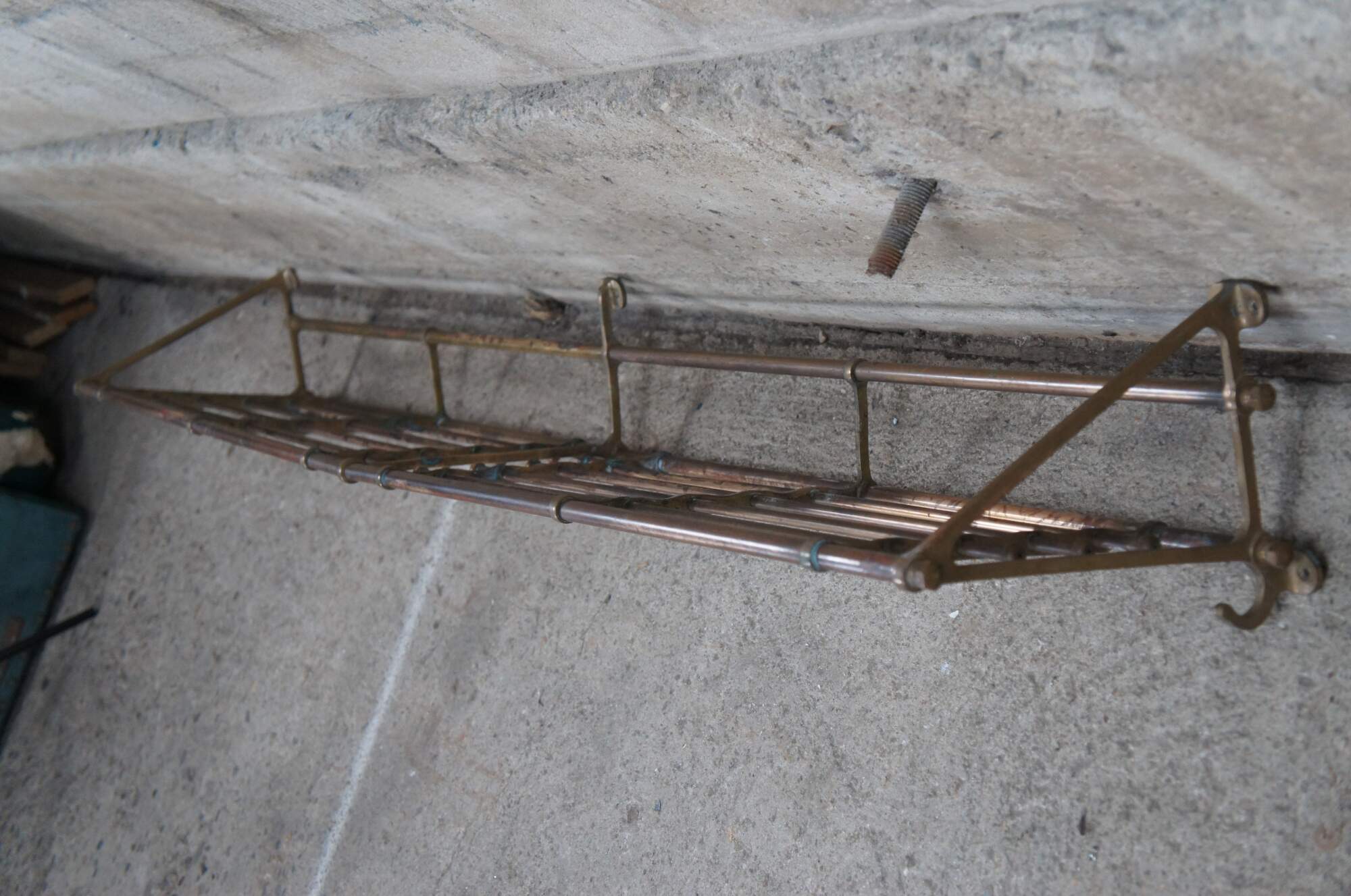 An antique wall mount tubular brass train luggage rack. Features beautiful lines and patina. Includes lower hooks along the ends for garments. These racks were often used on The Union Pacific Railroad