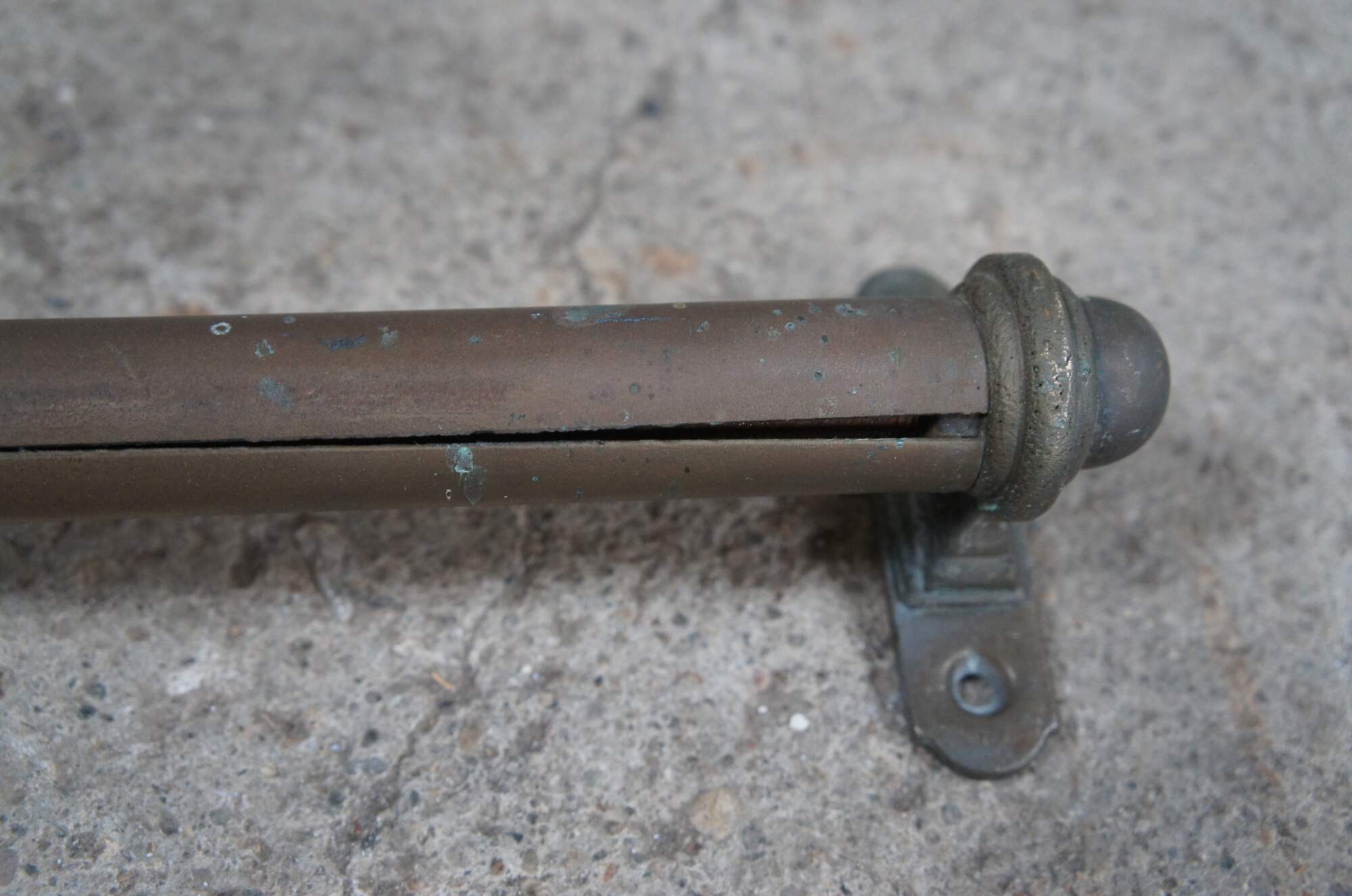 Pair of antique brass shower rods. Features ornate brackets with tubular style brass centers.