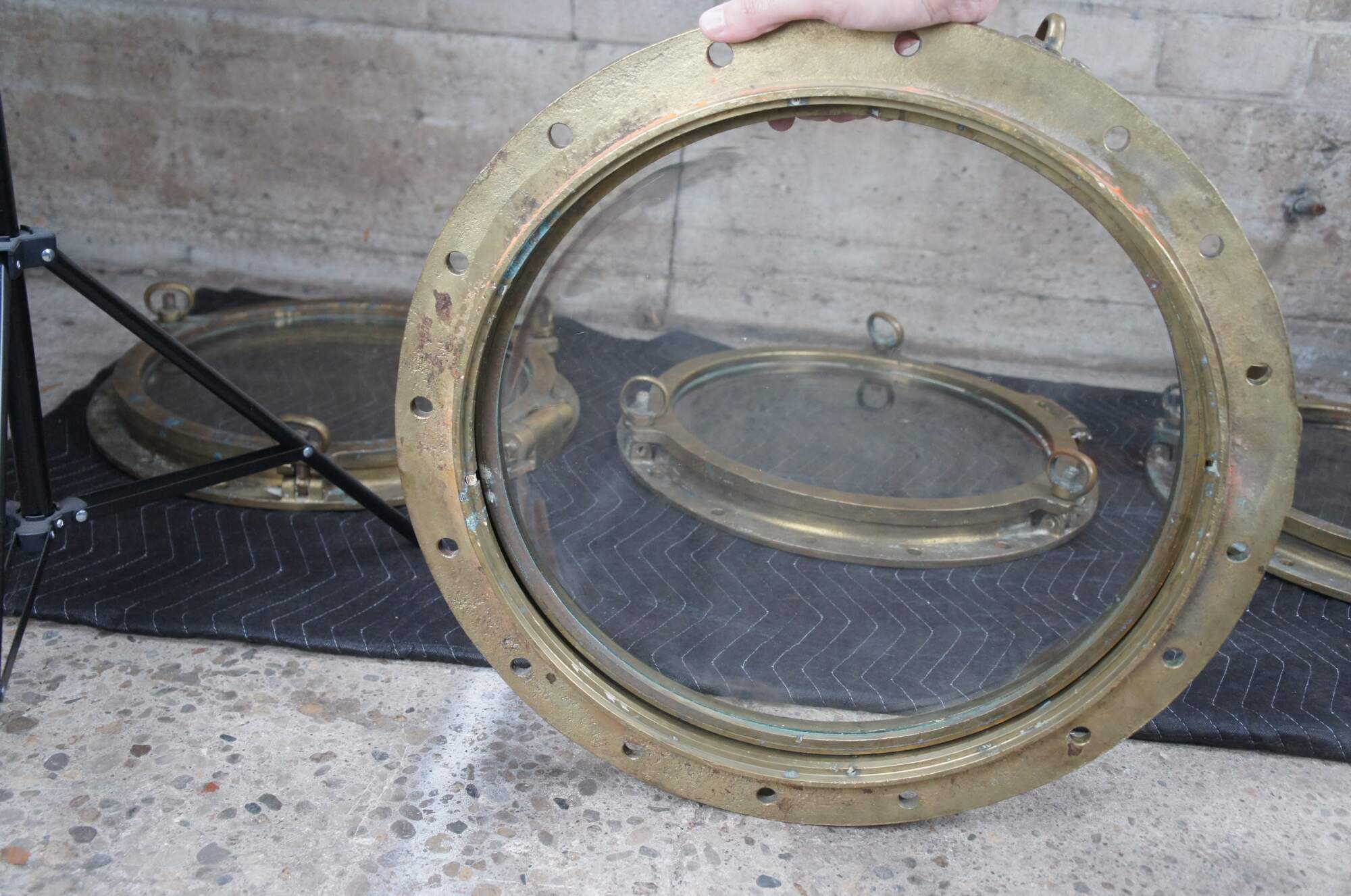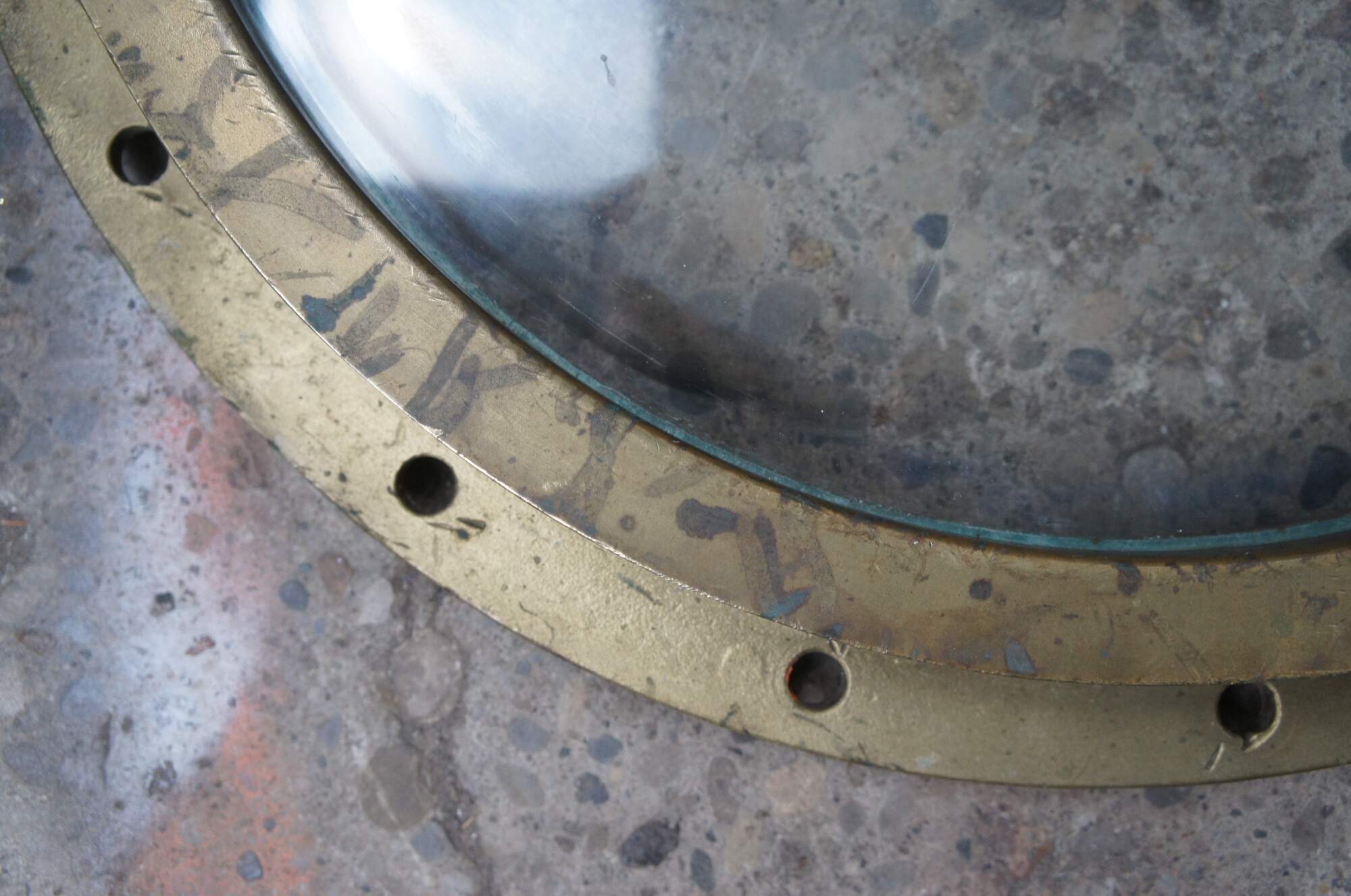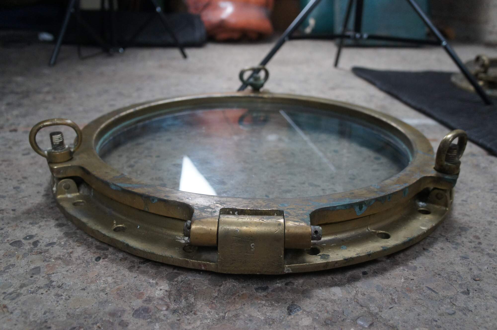 Extremely unique original large antique heavy solid bronze maritime Ship's Porthole or Hatch. The majority are rather simple and made from aluminum or nickel plated rather than heavy bronze like this unique specimen. The vast majority of portholes on the market today are modern or reproduction's. This aged beauty is complete with original green glass and 3 dogs. High quality construction and hefty weight. Includes Sekurit Weather Glass.