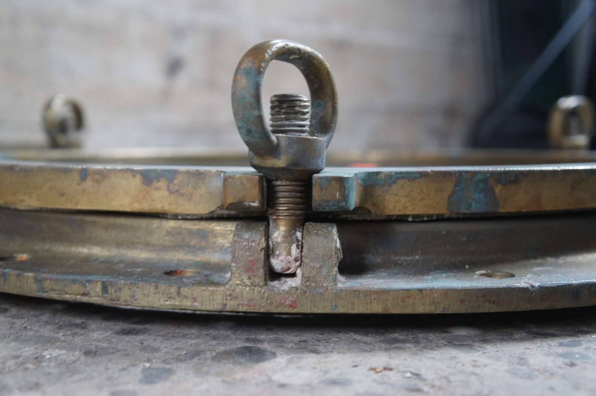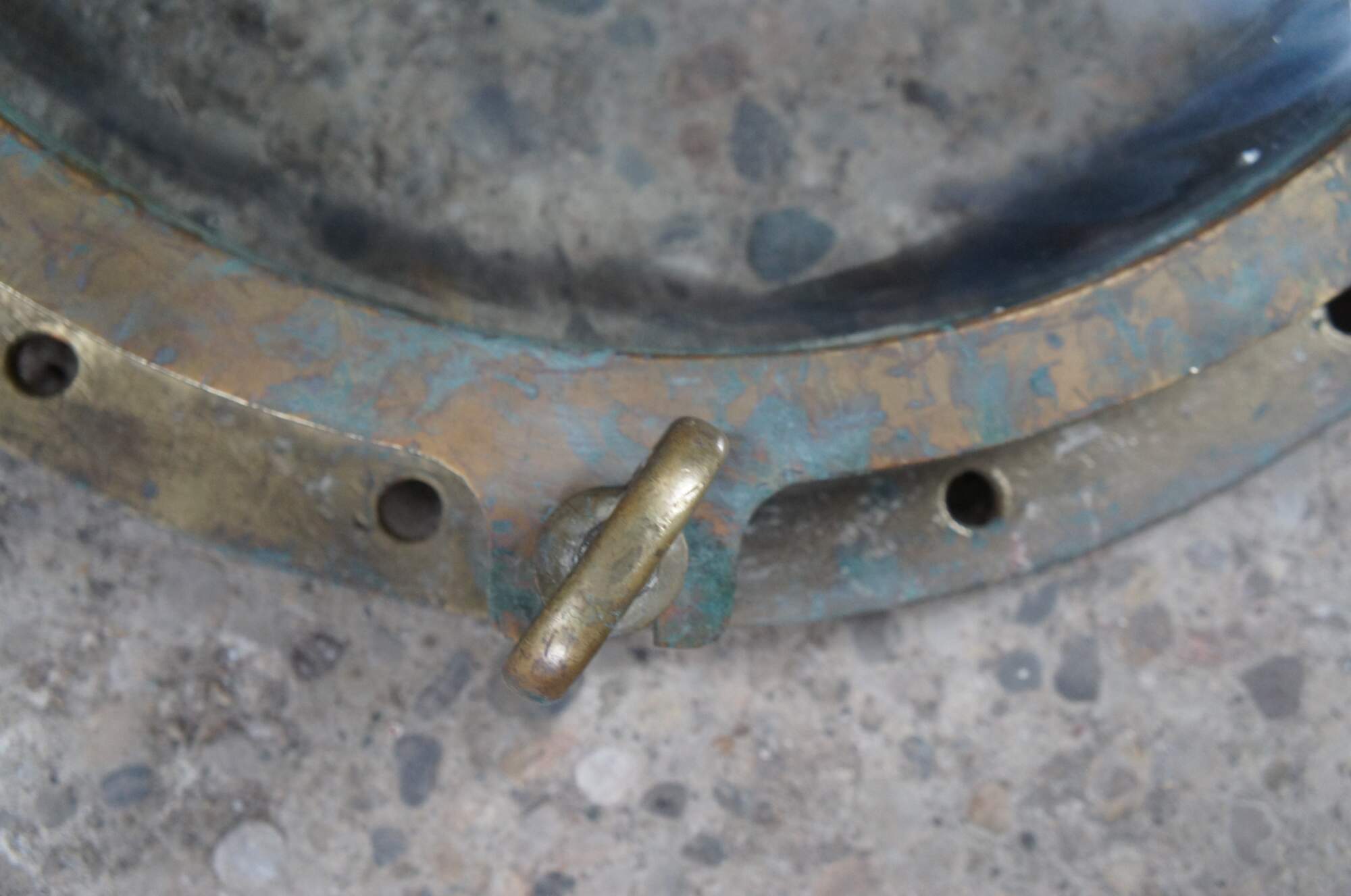 Extremely unique original large antique heavy solid bronze maritime Ship's Porthole or Hatch. The majority are rather simple and made from aluminum or nickel plated rather than heavy bronze like this unique specimen. The vast majority of portholes on the market today are modern or reproduction's. This aged beauty is complete with original green glass and 3 dogs. High quality construction and hefty weight. Includes Sekurit Weather Glass.