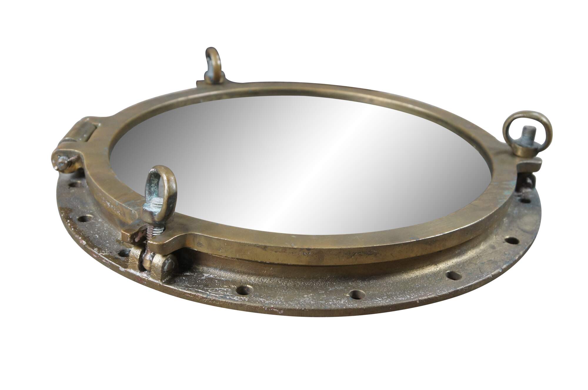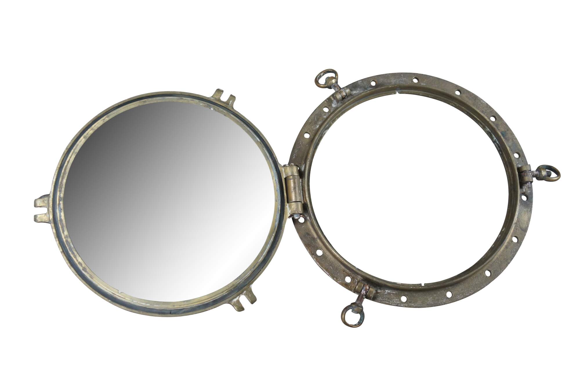 Extremely unique original large antique heavy solid bronze maritime Ship's Porthole or Hatch. The majority are rather simple and made from aluminum or nickel plated rather than heavy bronze like this unique specimen. The vast majority of portholes on the market today are modern or reproduction's. This aged beauty is complete with original green glass and 3 dogs. High quality construction and hefty weight. Includes Sekurit Weather Glass.