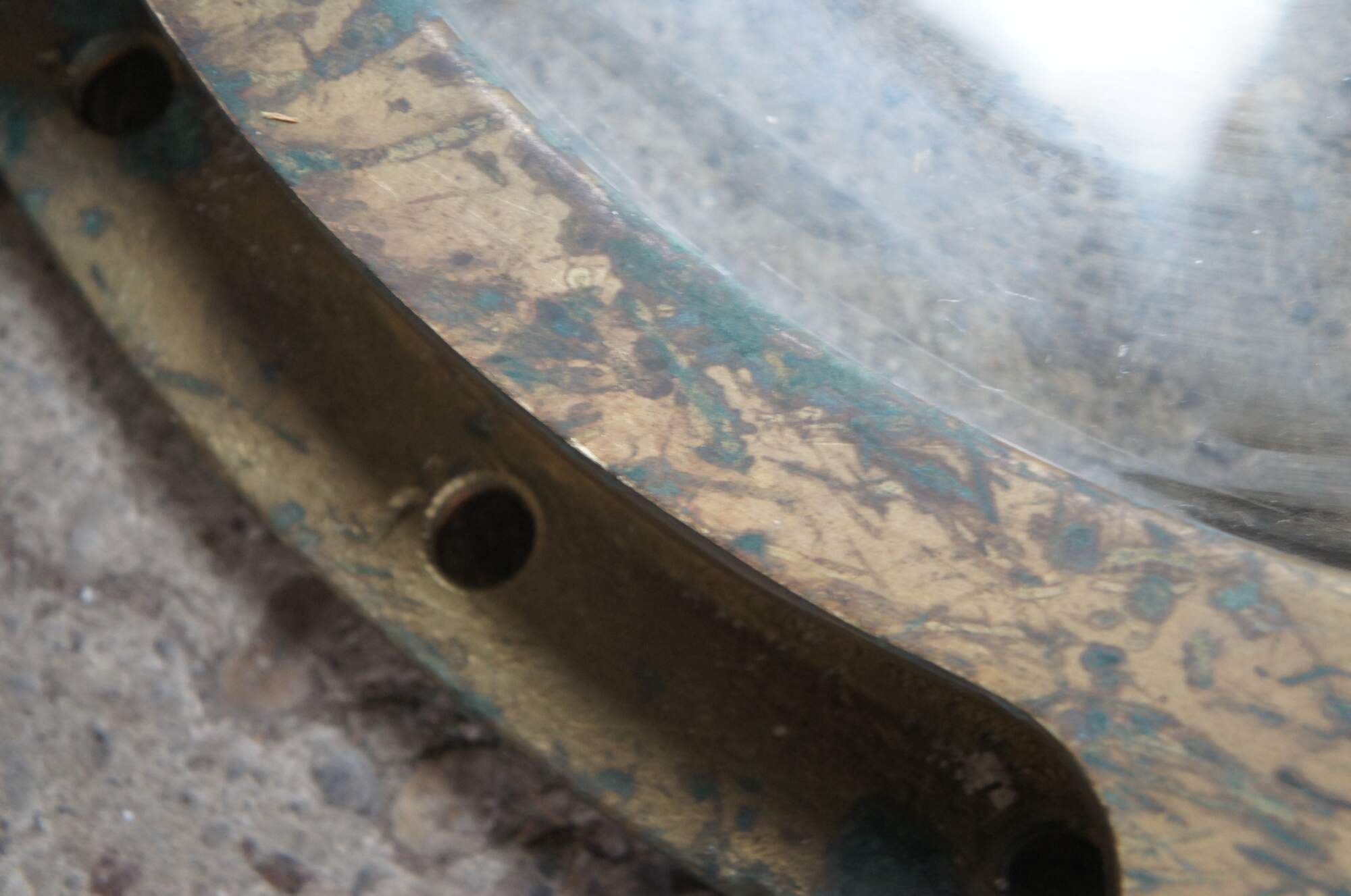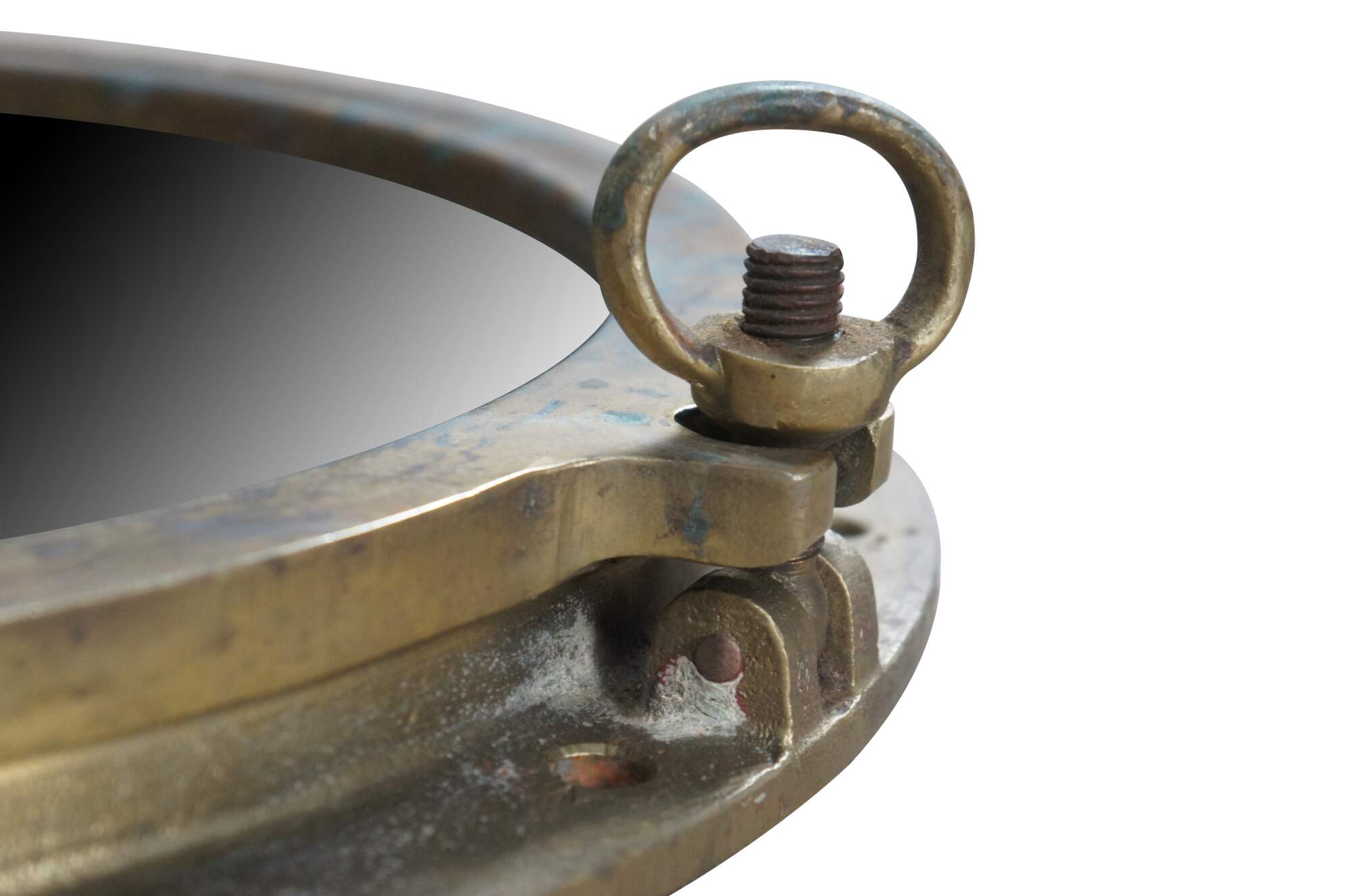 Extremely unique original large antique heavy solid bronze maritime Ship's Porthole or Hatch. The majority are rather simple and made from aluminum or nickel plated rather than heavy bronze like this unique specimen. The vast majority of portholes on the market today are modern or reproduction's. This aged beauty is complete with original green glass and 3 dogs. High quality construction and hefty weight. Includes Sekurit Weather Glass.