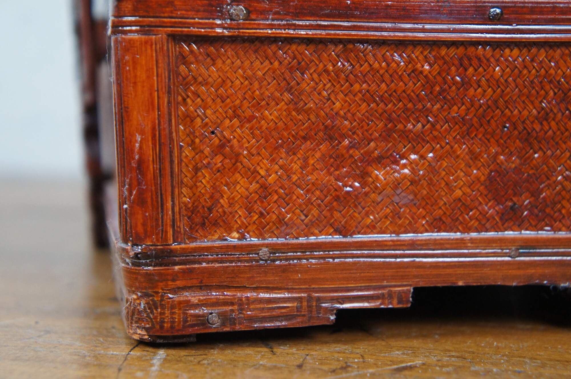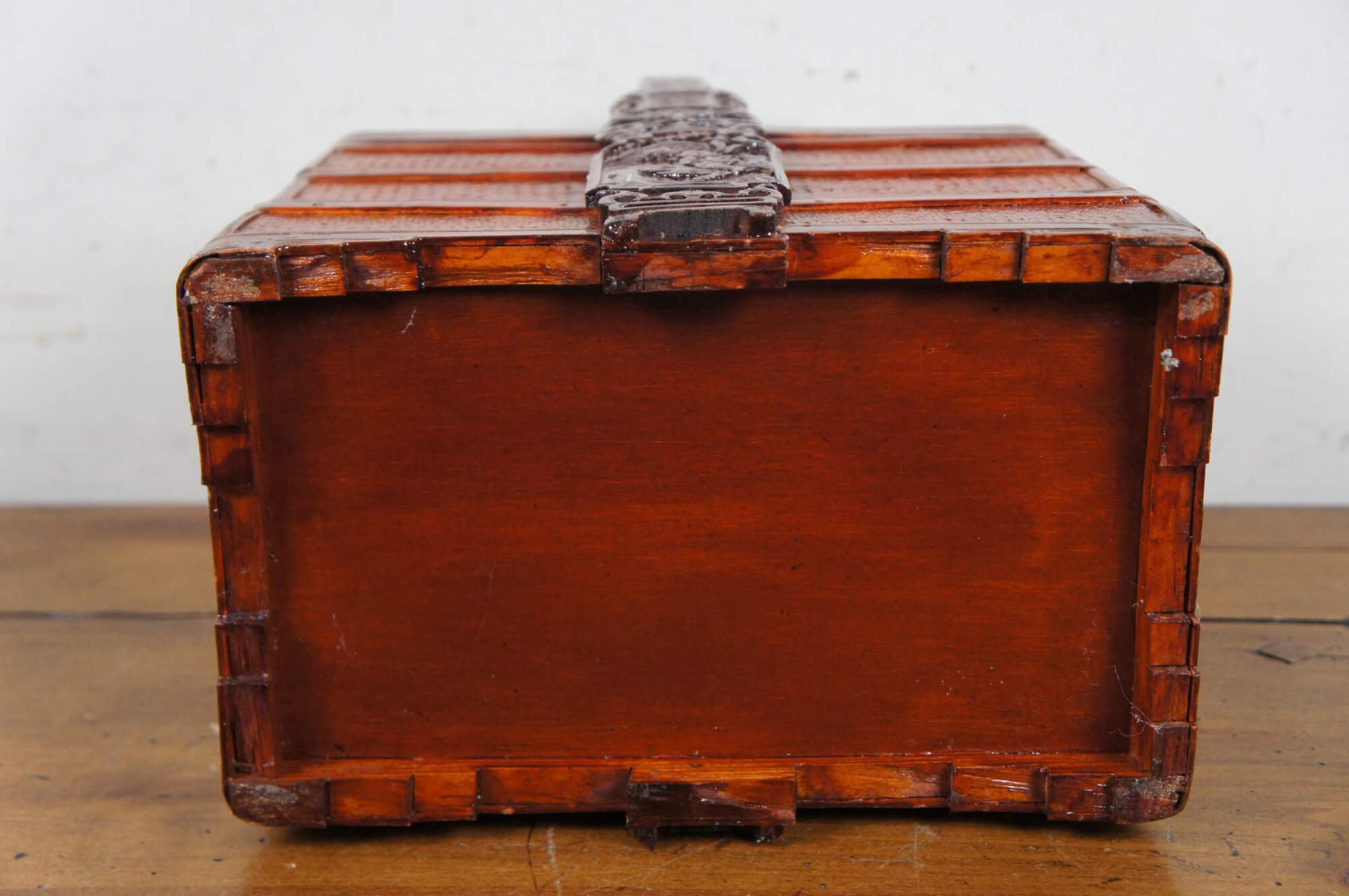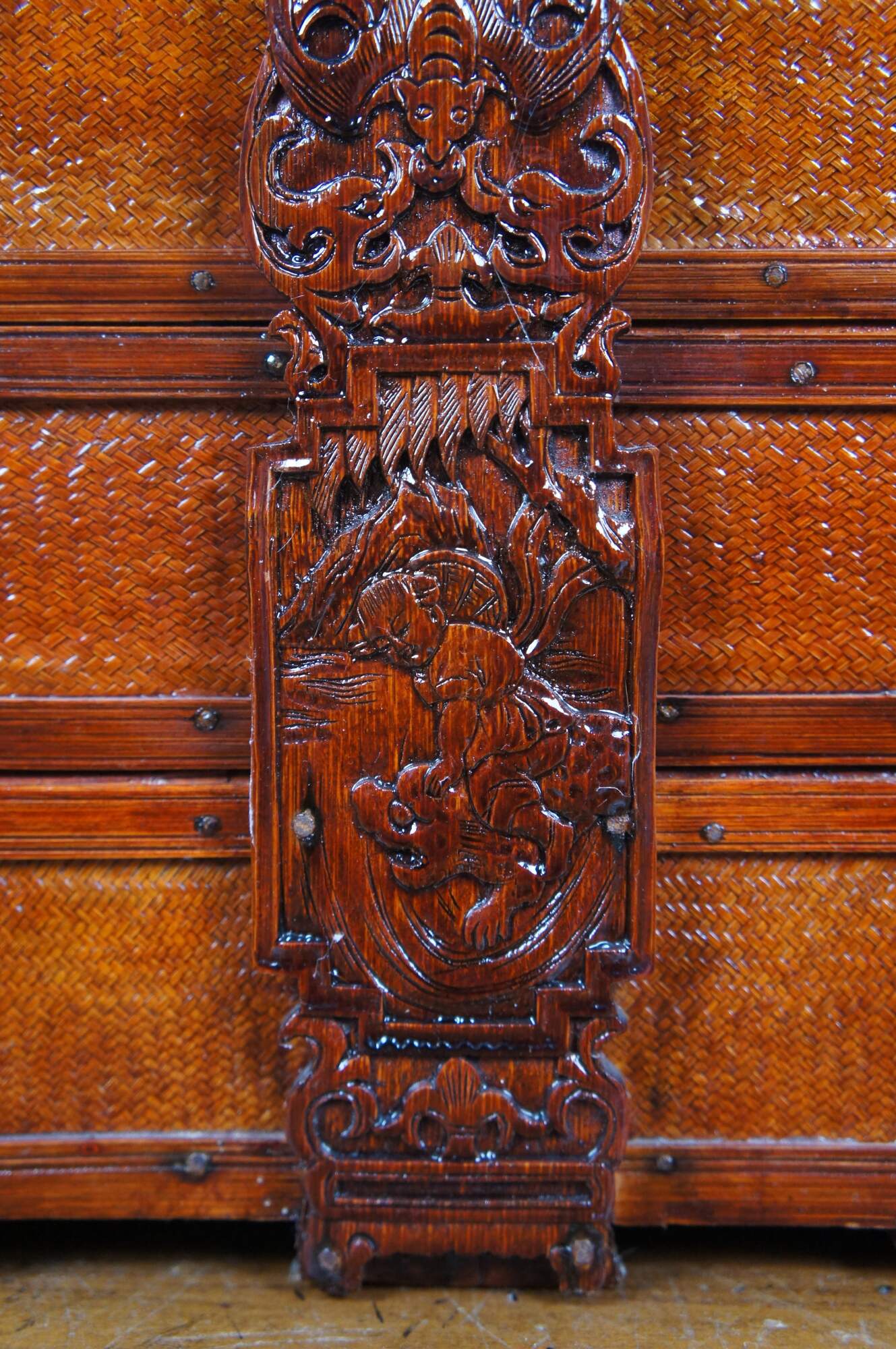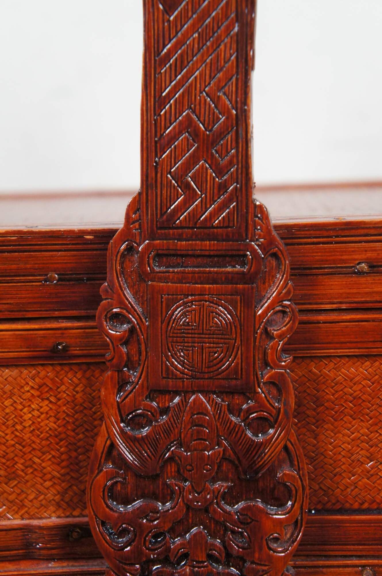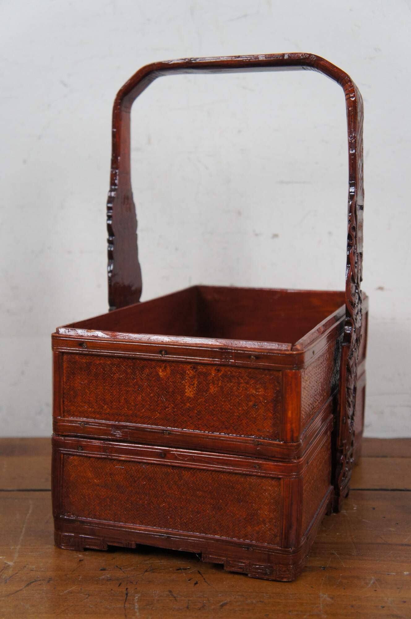 Vintage 20th century Chinese three tiered wedding basket / storage box. Rectangular form of carved wood and woven rattan finished in a glossy lacquer. Three storage compartments, lid and fixed handle, carved with figures, bats and flowers.