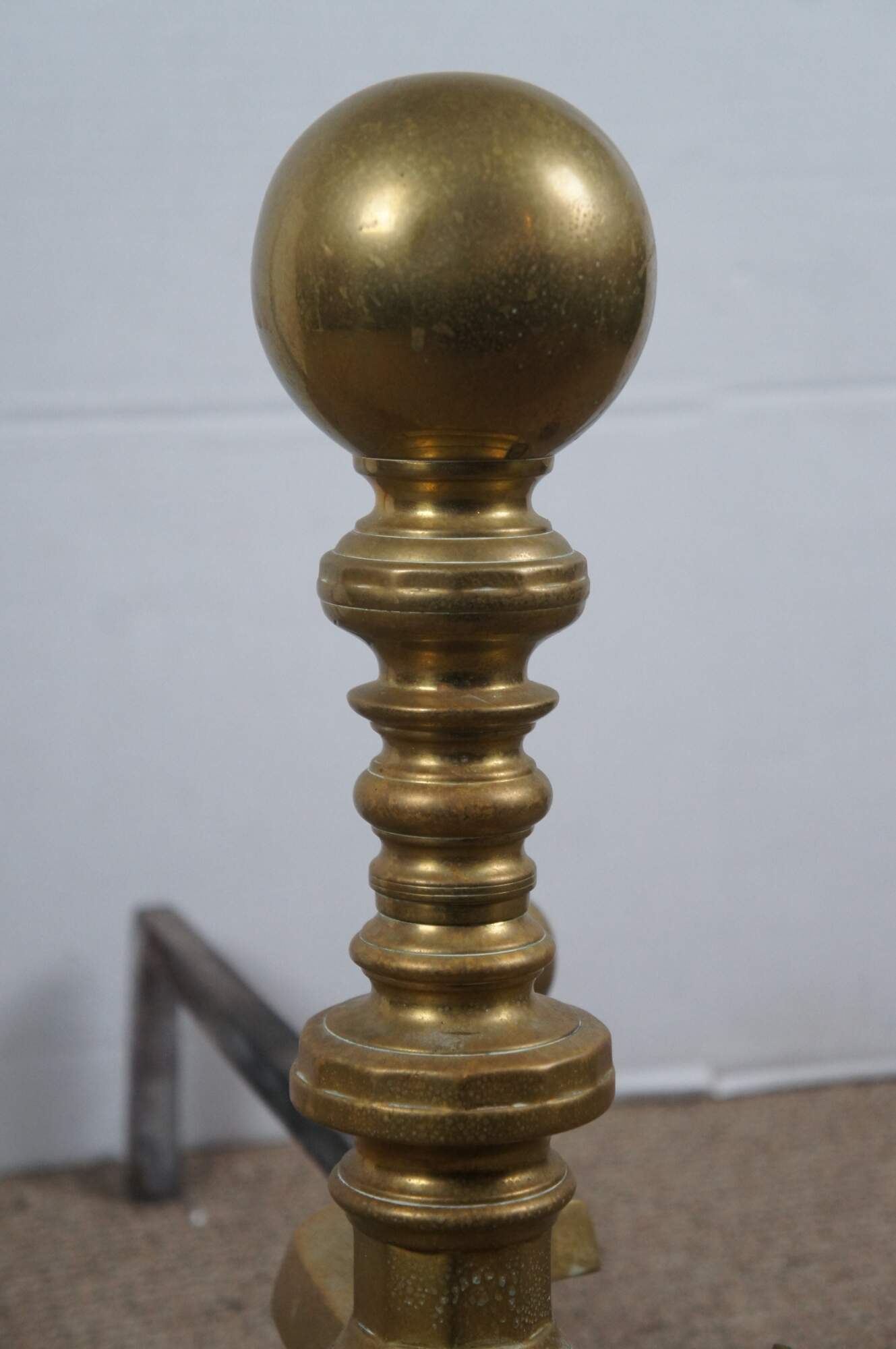 Pair of antique Georgian brass and iron andirons / fire dogs featuring cannonball tops on turned baluster pillars with ornate delicate scrolled feet.