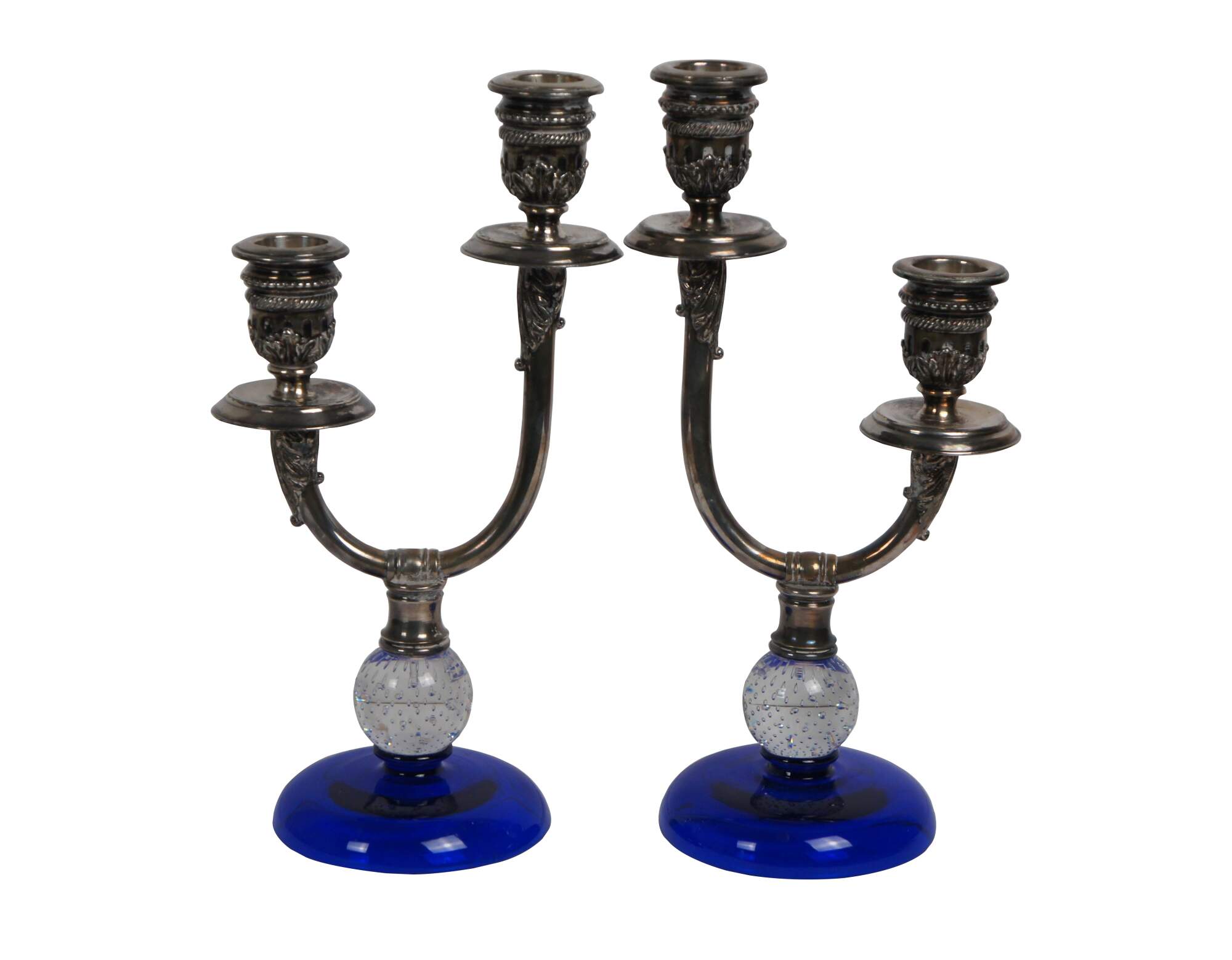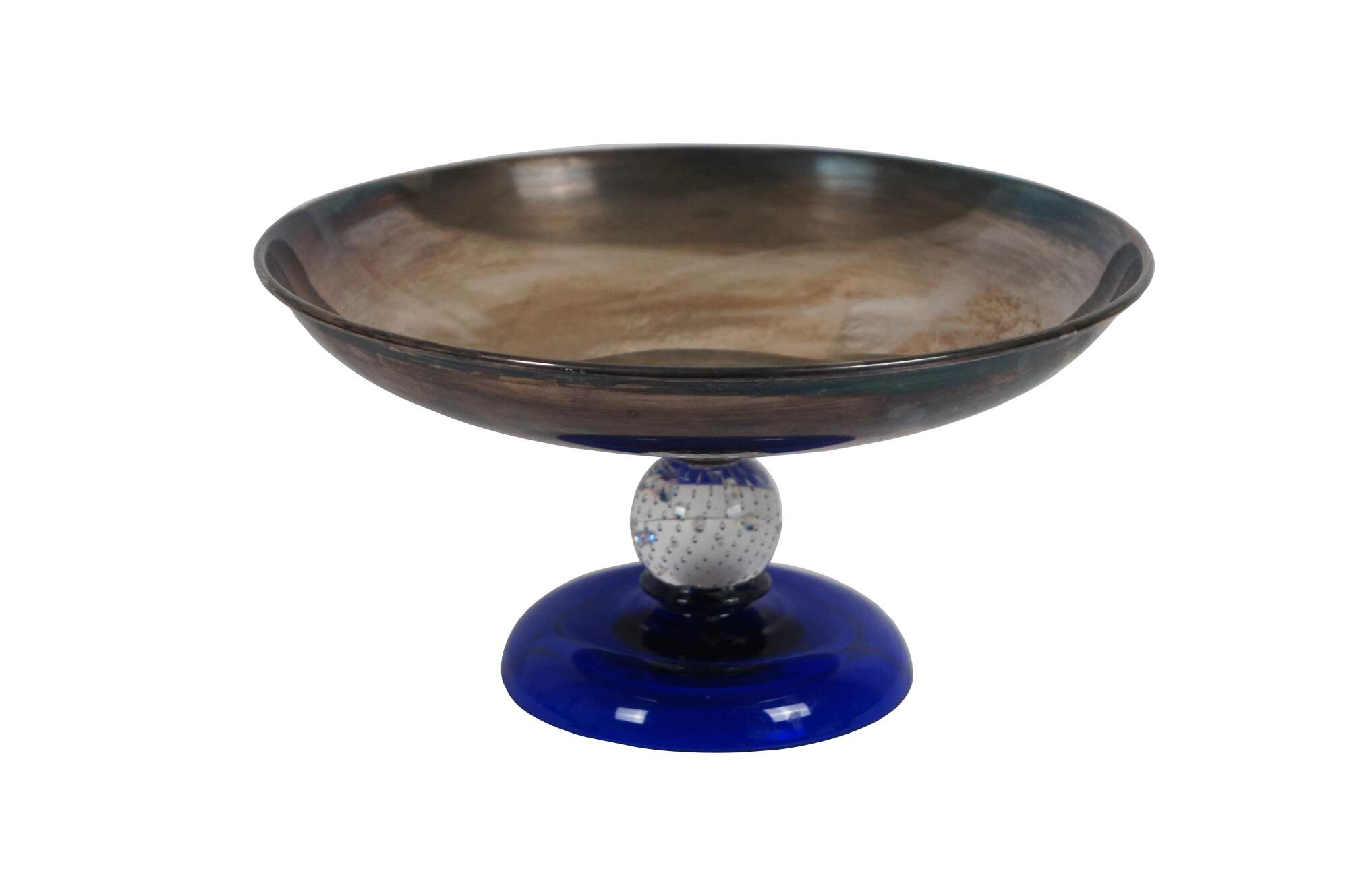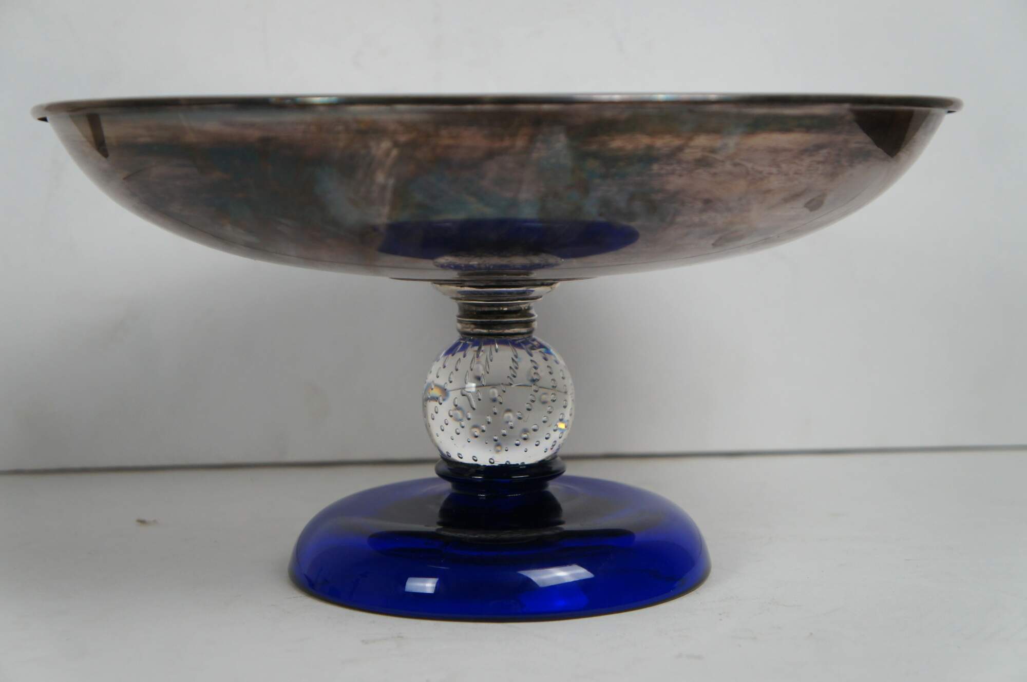 Vintage Pairpoint 3 piece console set including centerpiece / pedestal compote and two arm candlesticks, featuring cobalt blue bases with clear controlled bubble balls / orbs and silverplate tops - a combination not easily found online. Candlestick item number D6139. Compote item number D05518(3?).