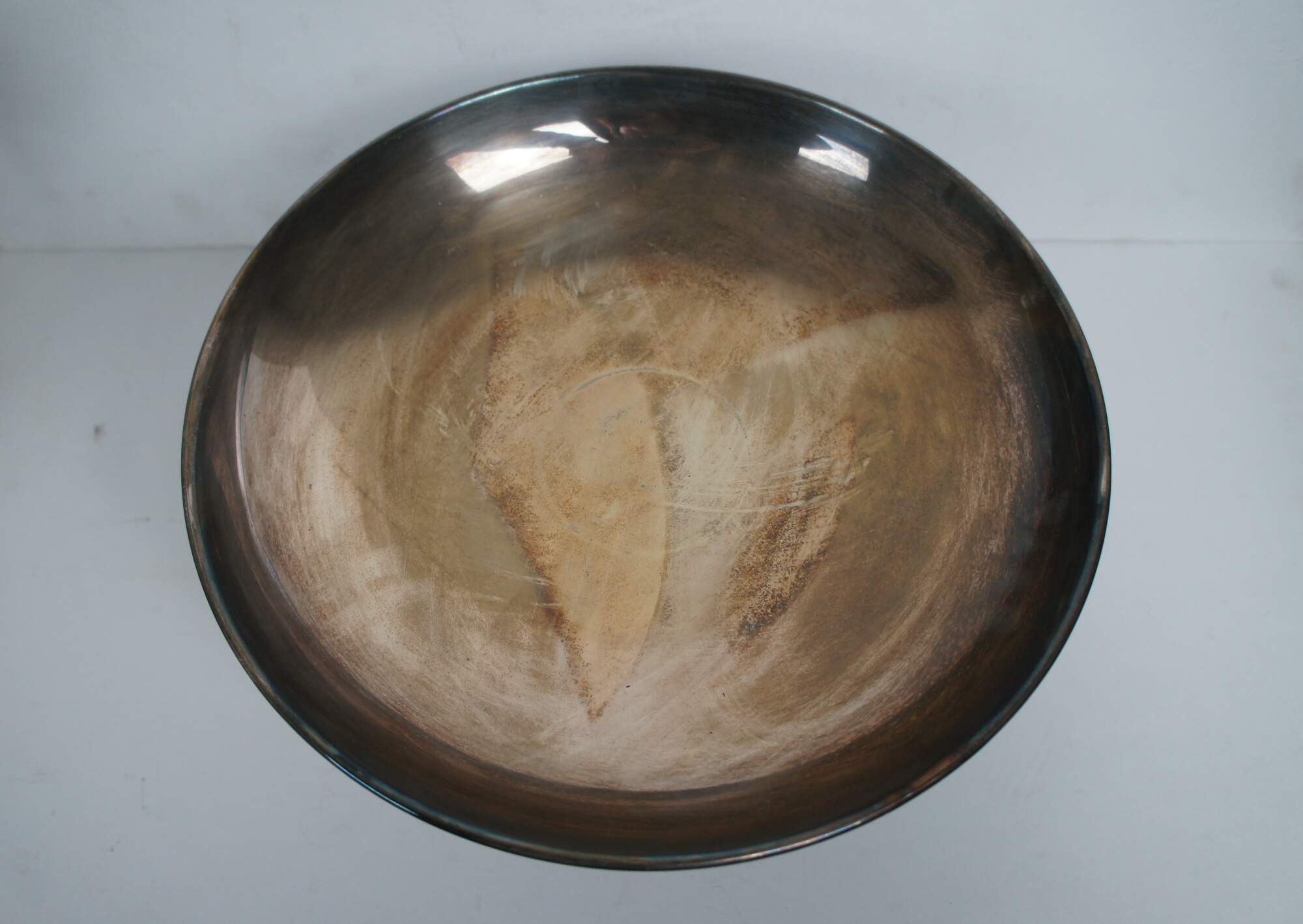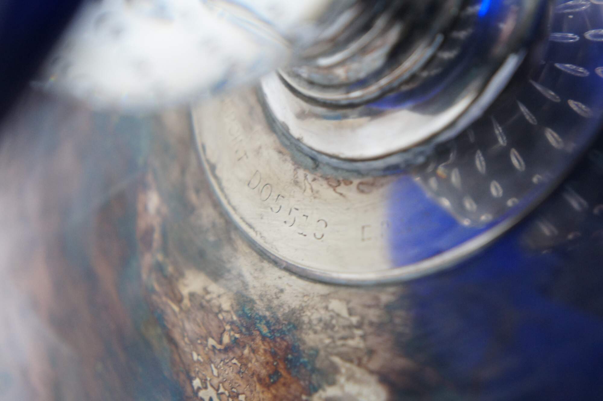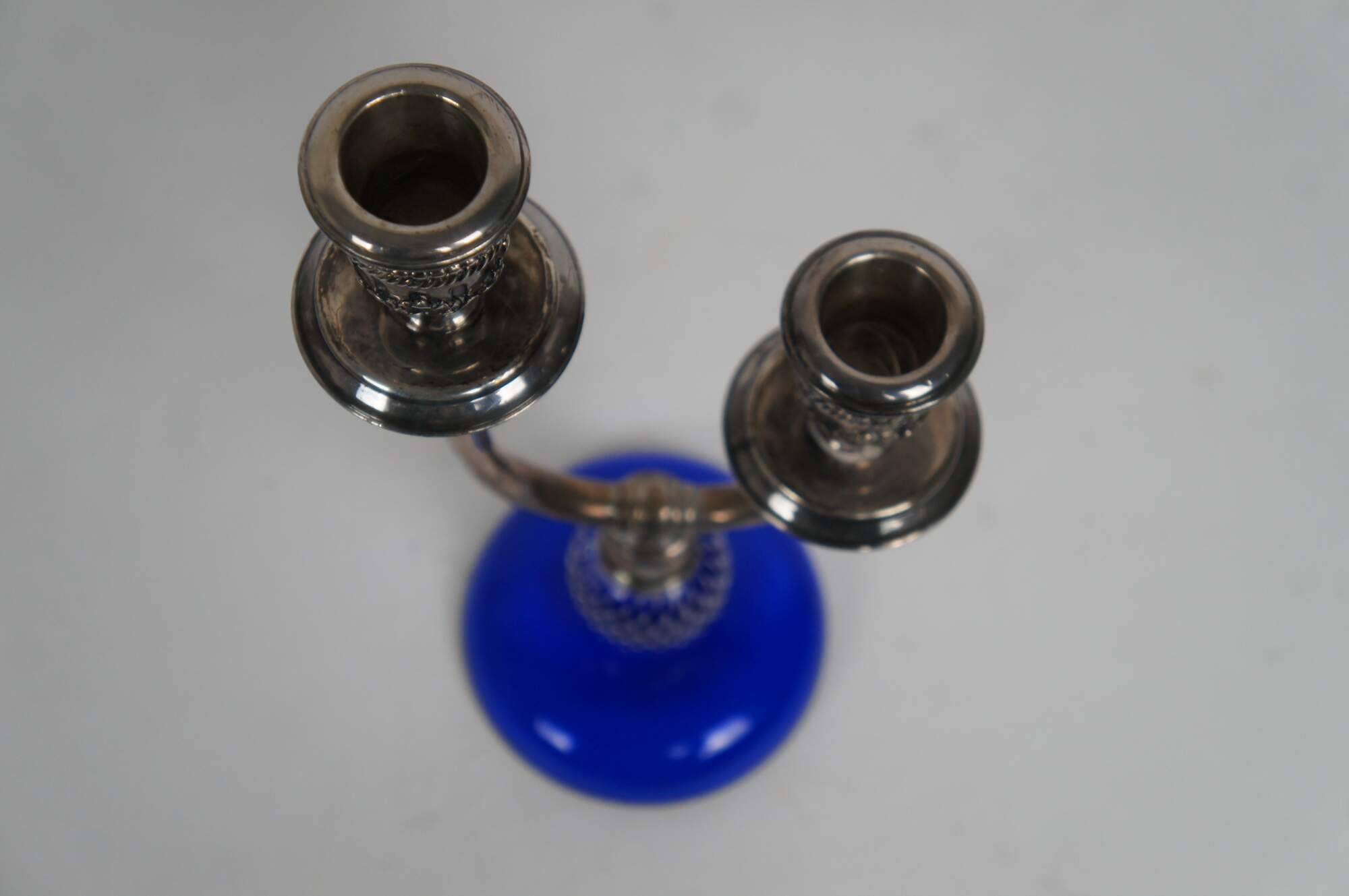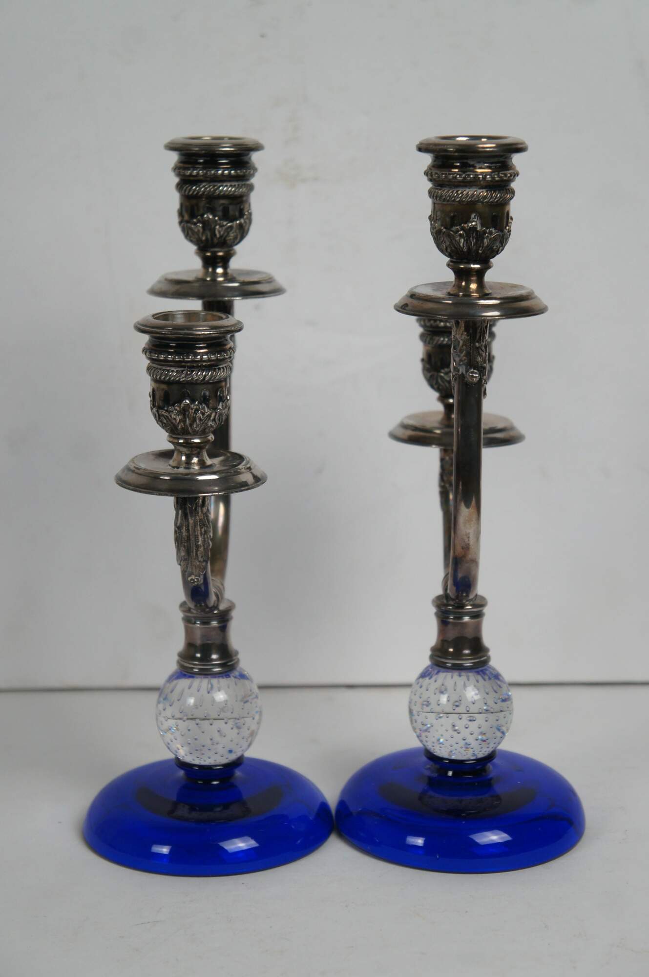 Vintage Pairpoint 3 piece console set including centerpiece / pedestal compote and two arm candlesticks, featuring cobalt blue bases with clear controlled bubble balls / orbs and silverplate tops - a combination not easily found online. Candlestick item number D6139. Compote item number D05518(3?).