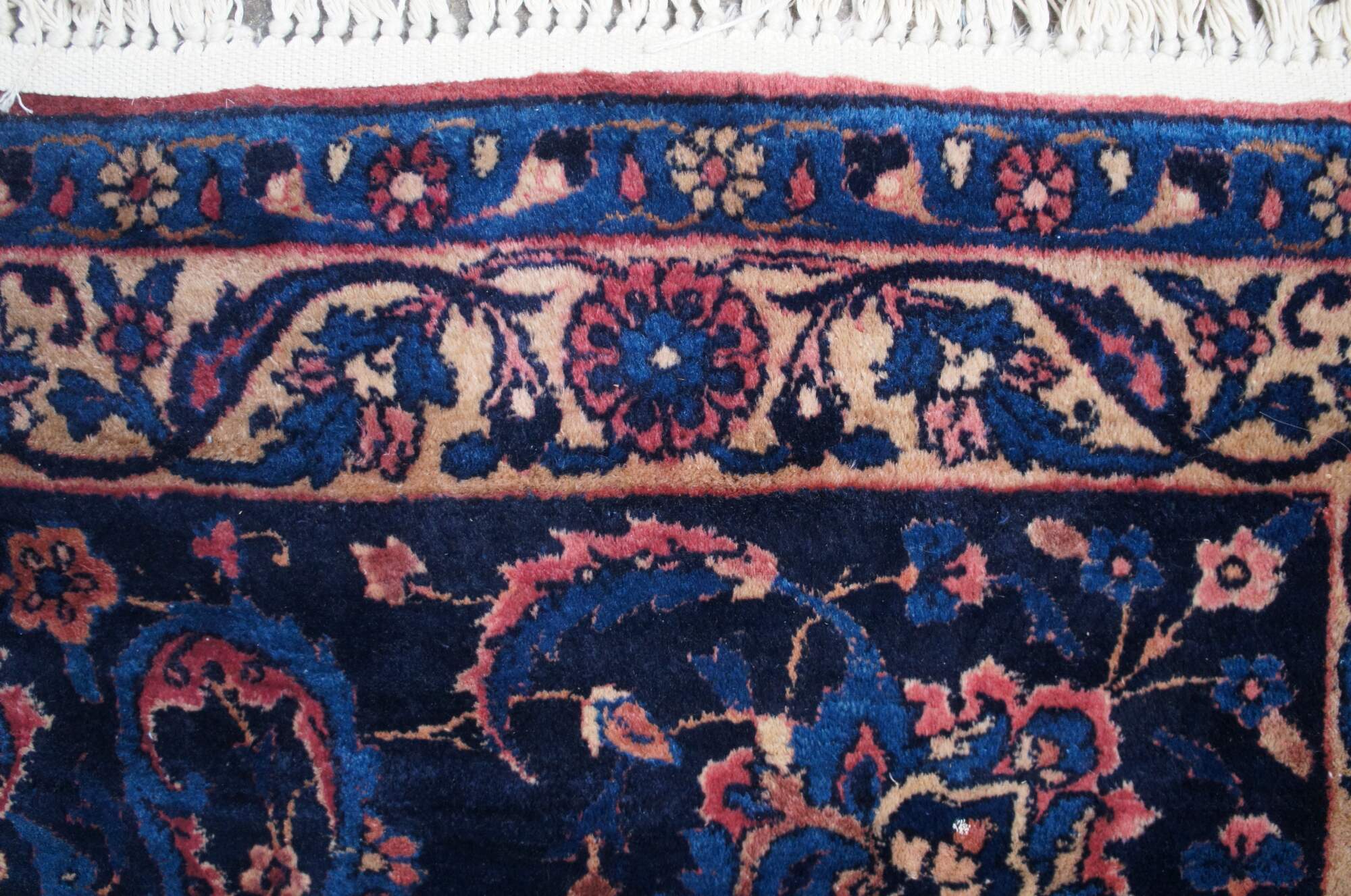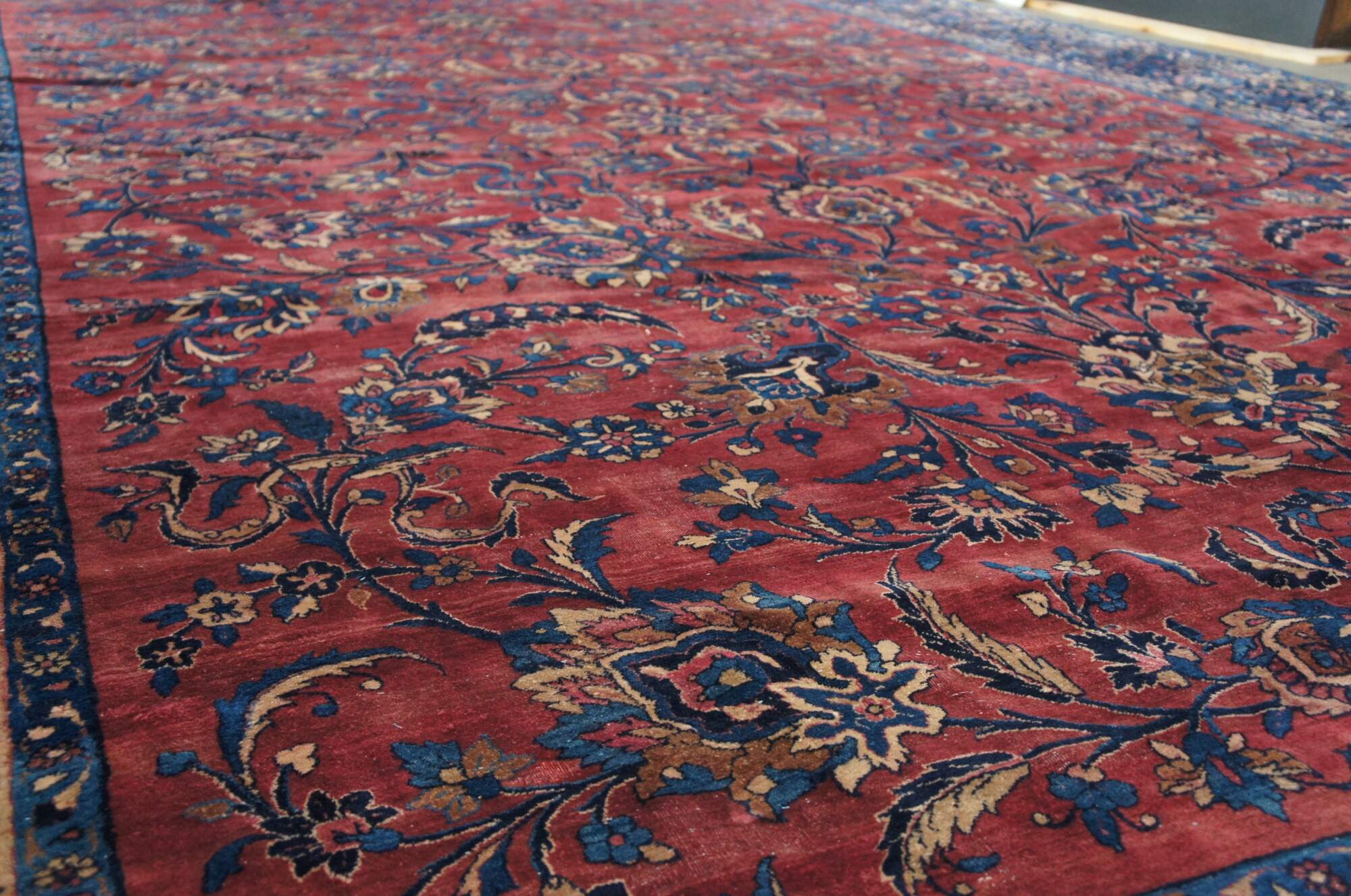 A very large and impressive antique 1930s Persian Mashad Palace rug or carpet. Made of cotton and wool featuring a thick pile with floral all over motif, dark red field and heavy blue accents. 256 knots per square inch. Blues, reds, browns, pinks, peach.
