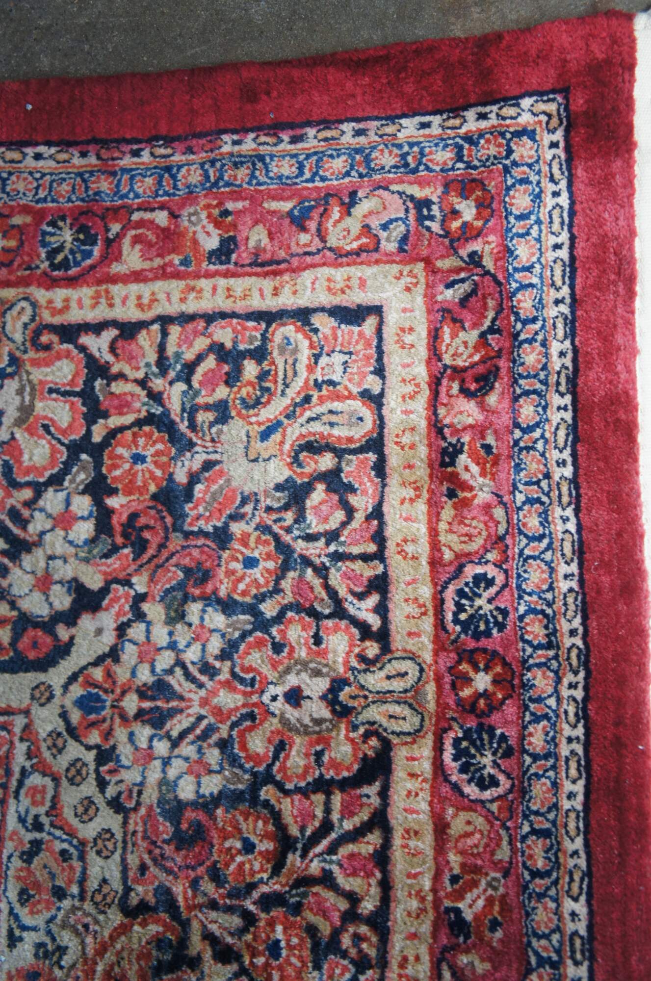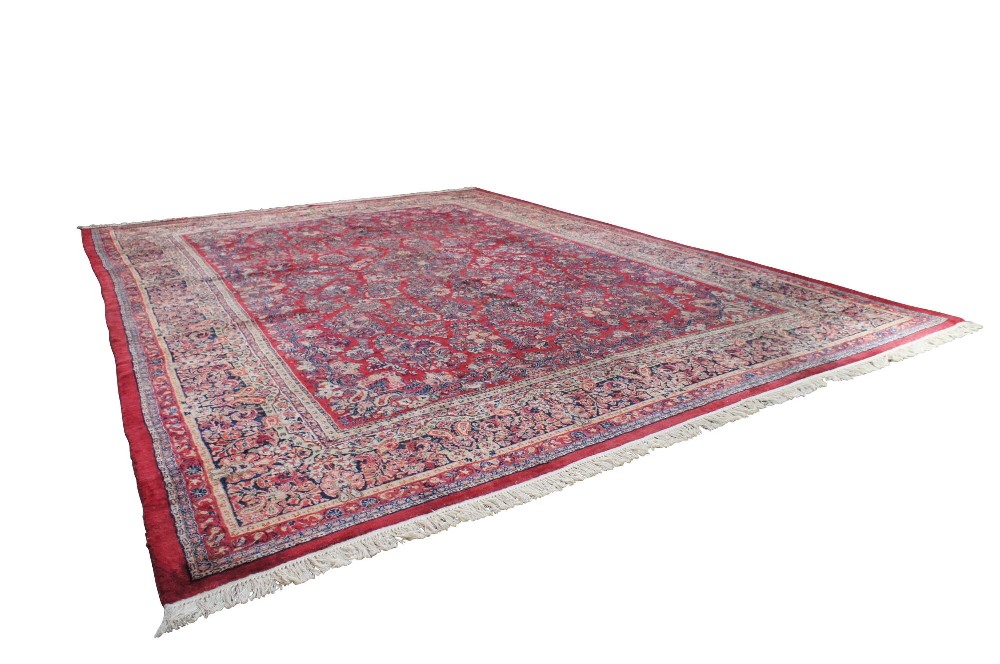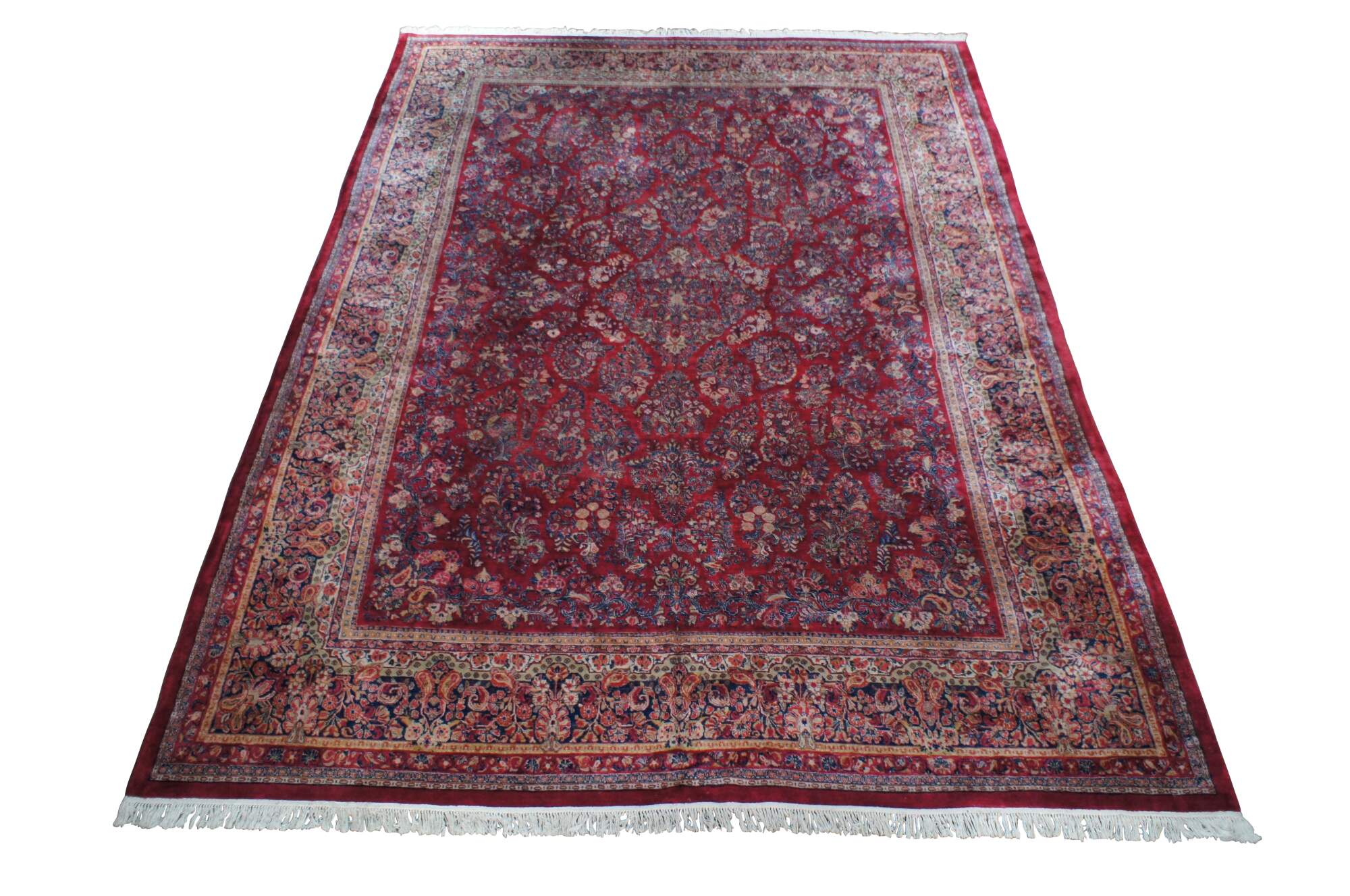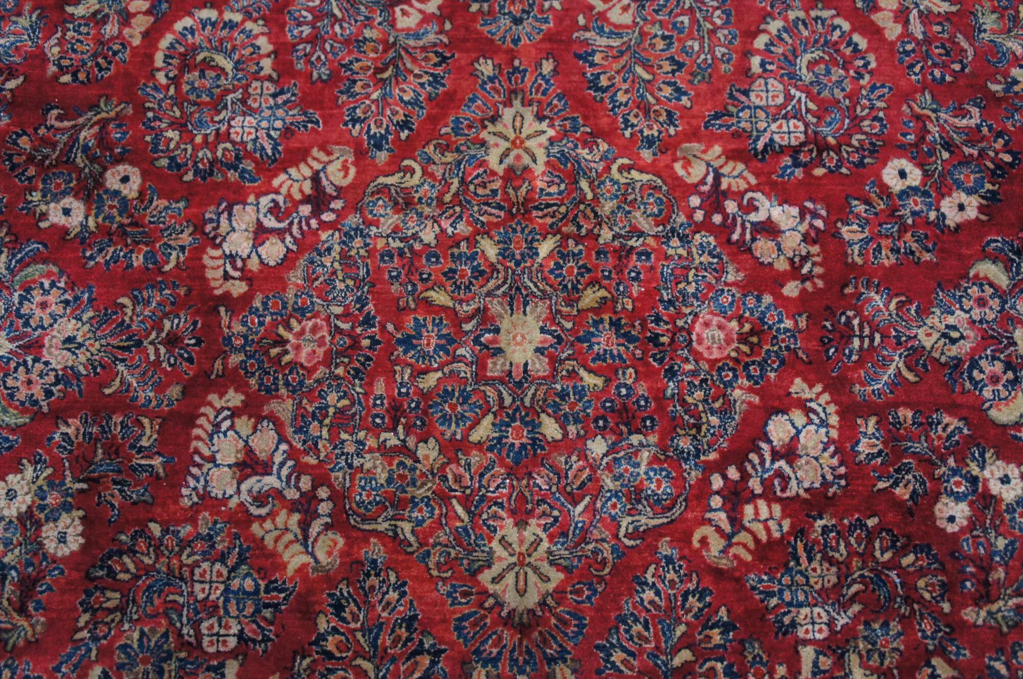 Massive antique 1930s / 1940s Persian Sarouk area rug or carpet. Made of cotton and wool featuring a vibrant red field with florals all over. 196 knots per square inch. Reds, blues, pinks, greens, peach, orange.