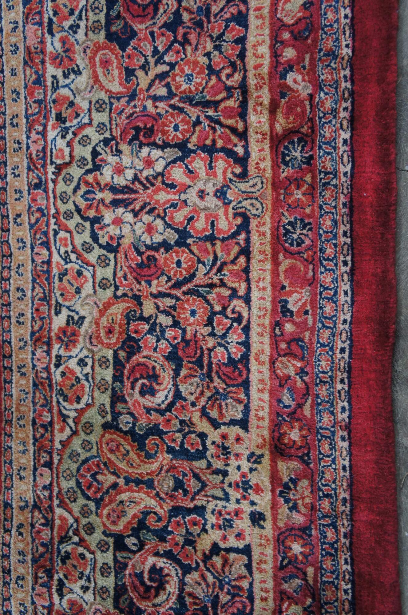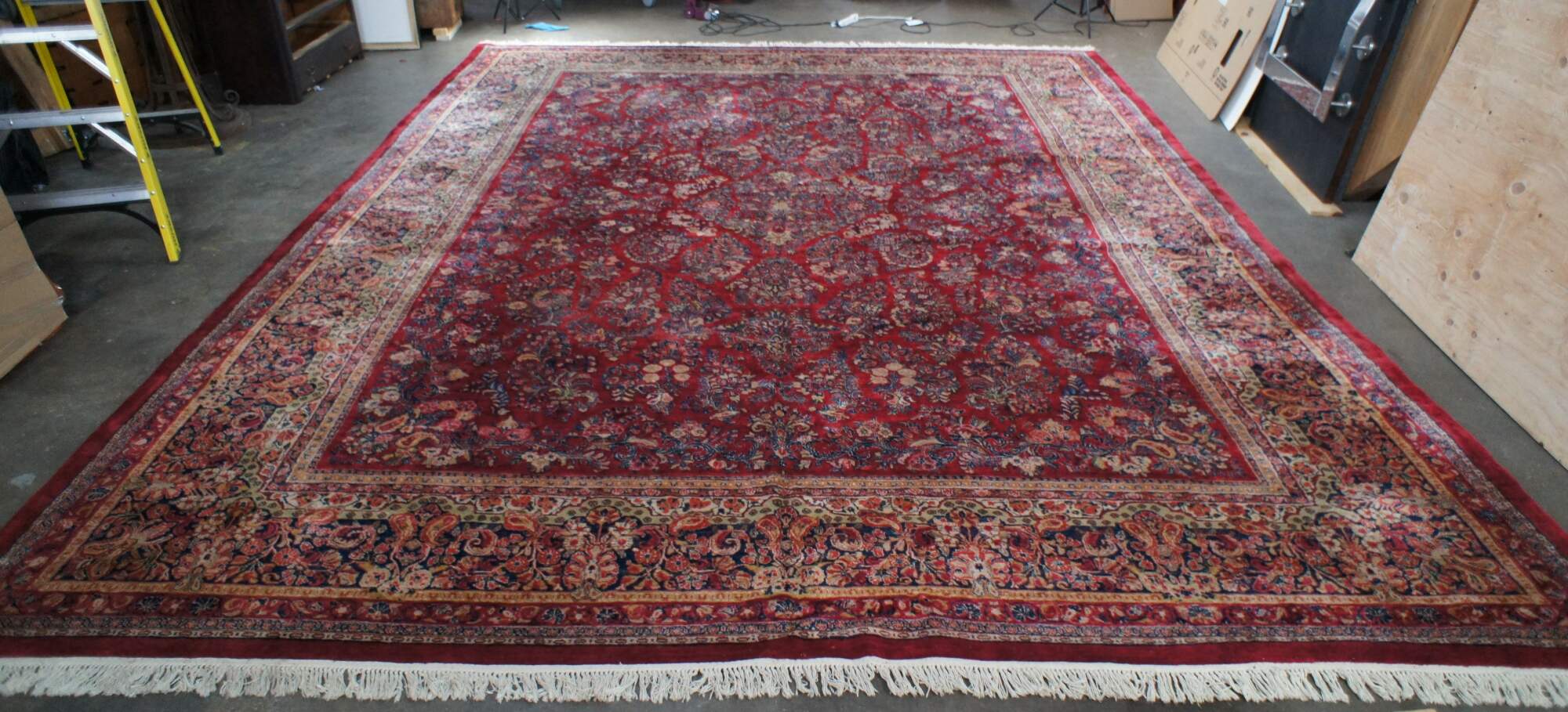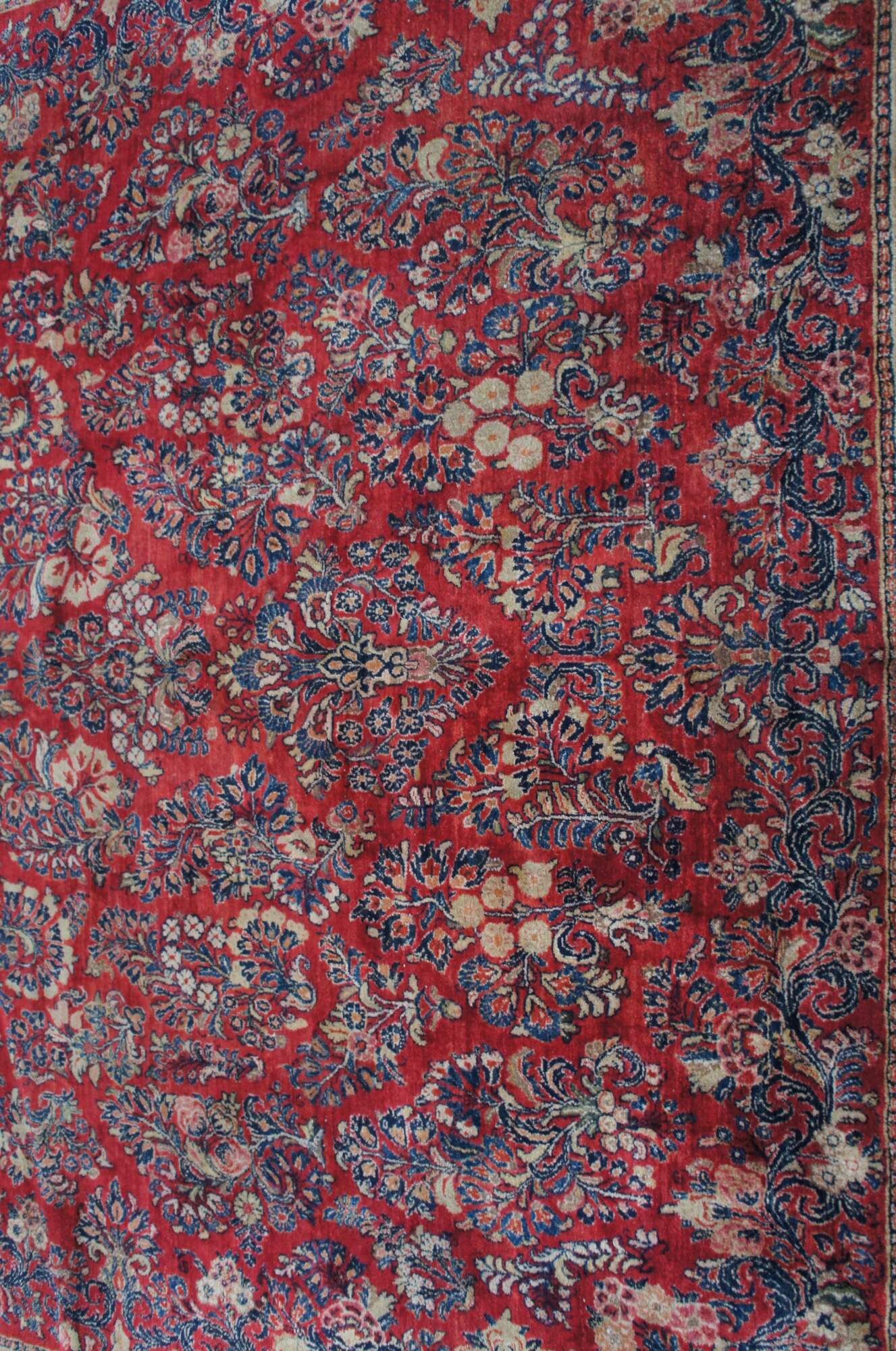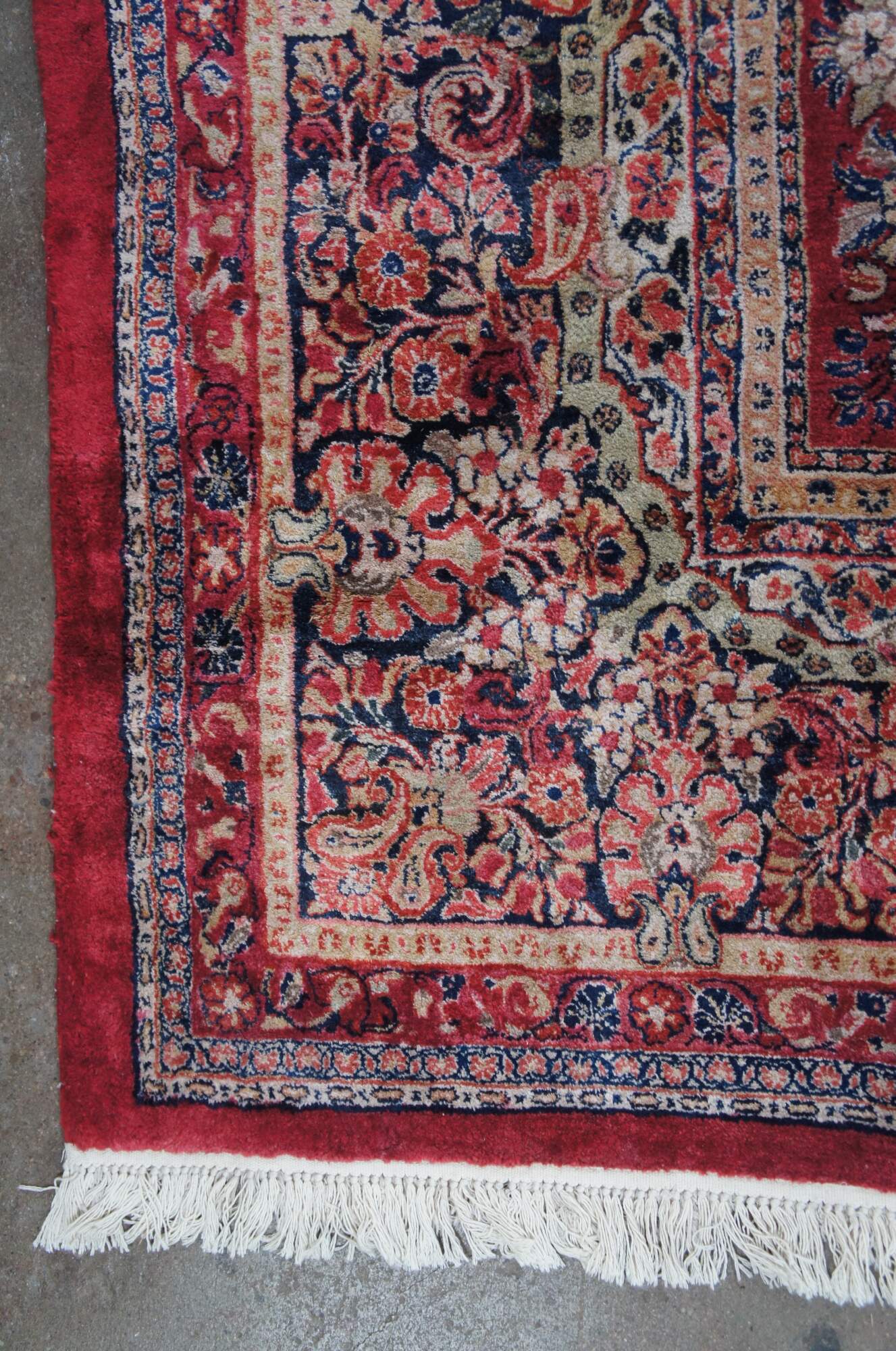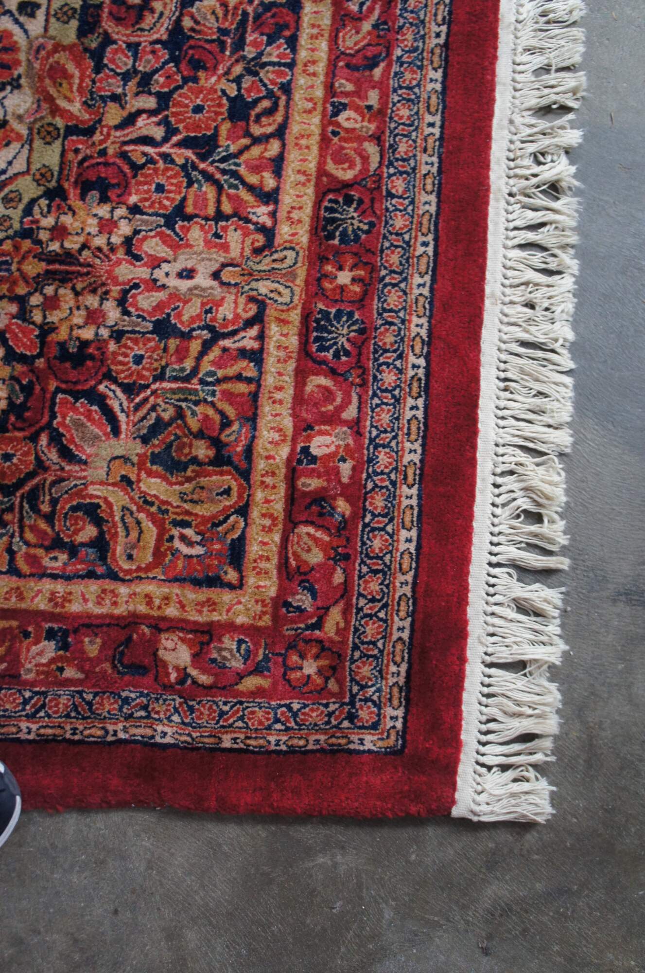 Massive antique 1930s / 1940s Persian Sarouk area rug or carpet. Made of cotton and wool featuring a vibrant red field with florals all over. 196 knots per square inch. Reds, blues, pinks, greens, peach, orange.