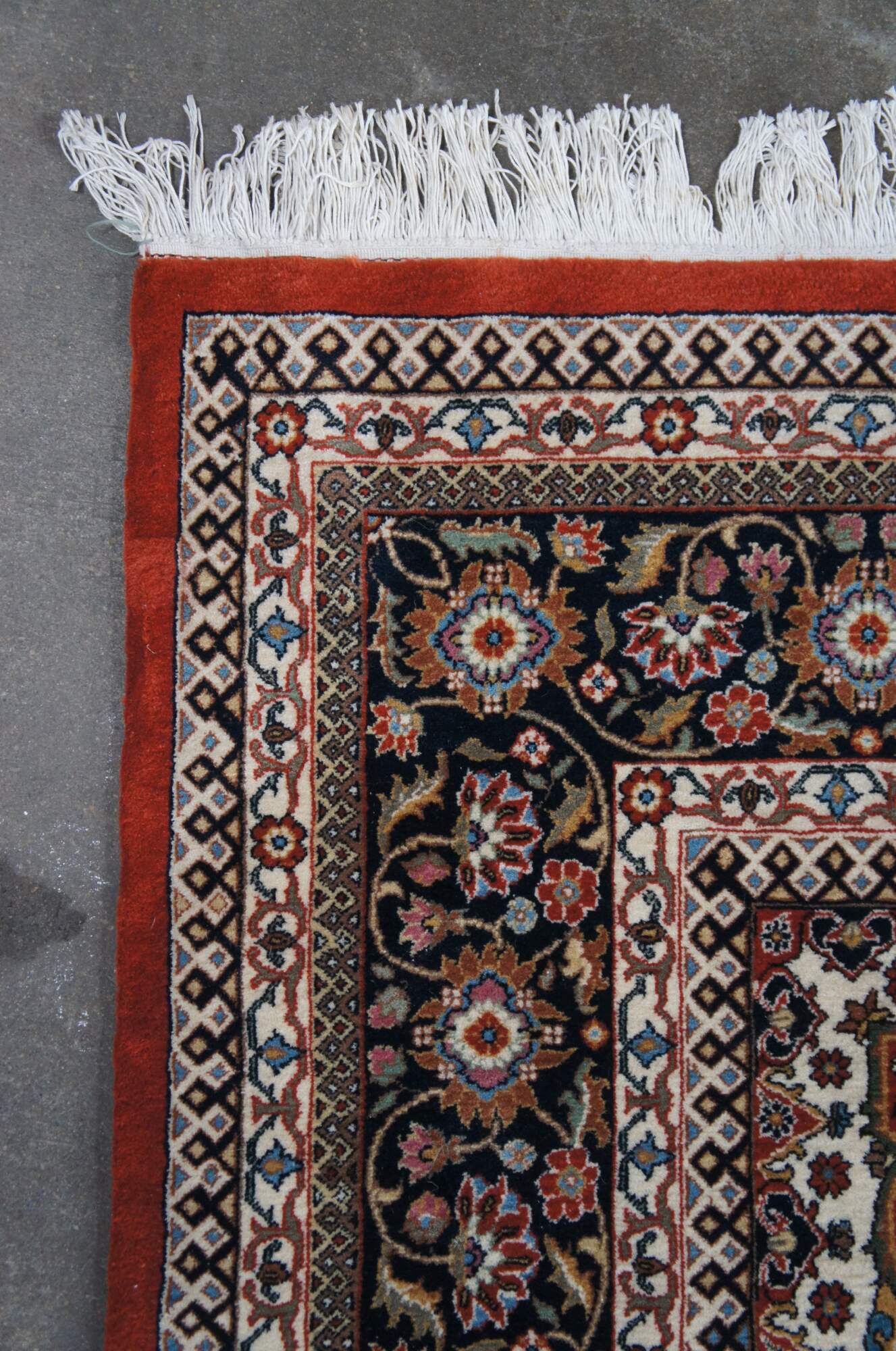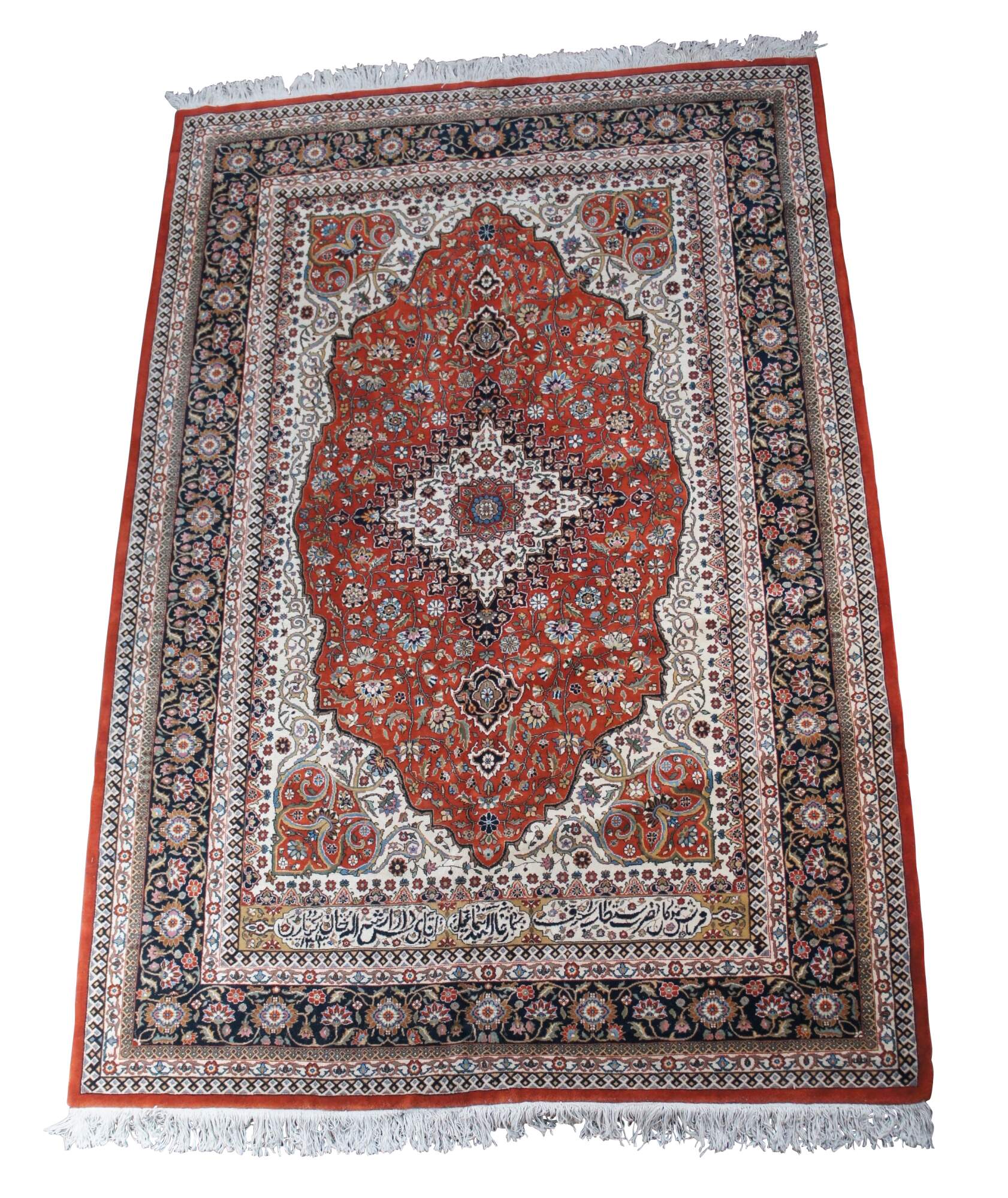 Vintage Persian Iran Tabriz area rug or carpet. Made of wool featuring a floral all over design with central medallion and cursive script. 289 knots per square inch. Reds, blues, pinks, greens, beige / tan, browns.