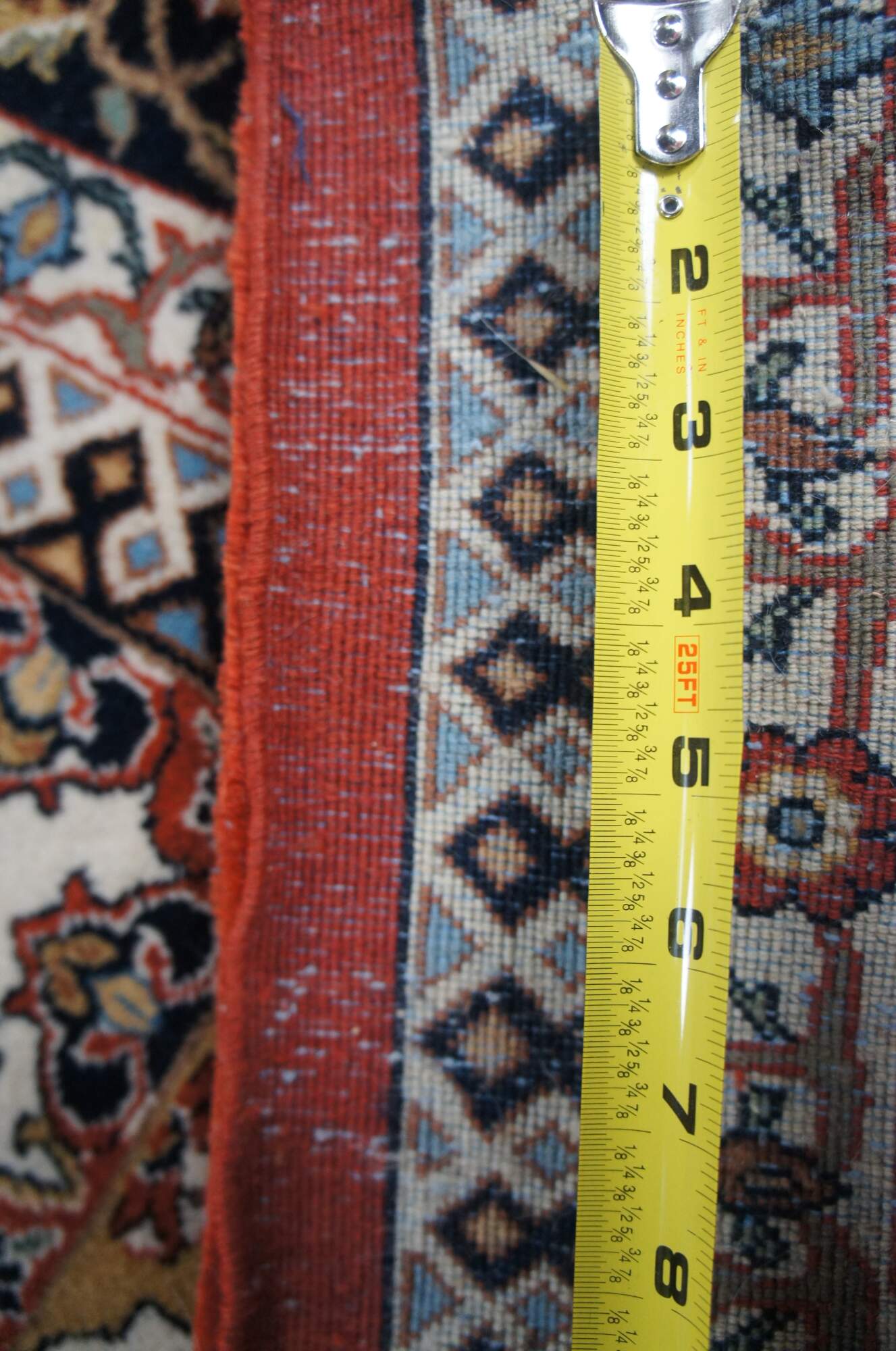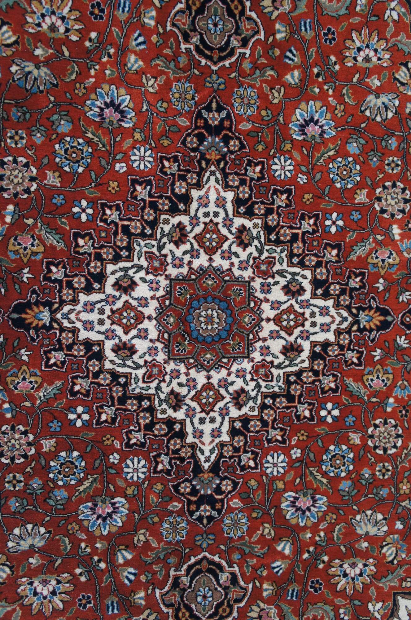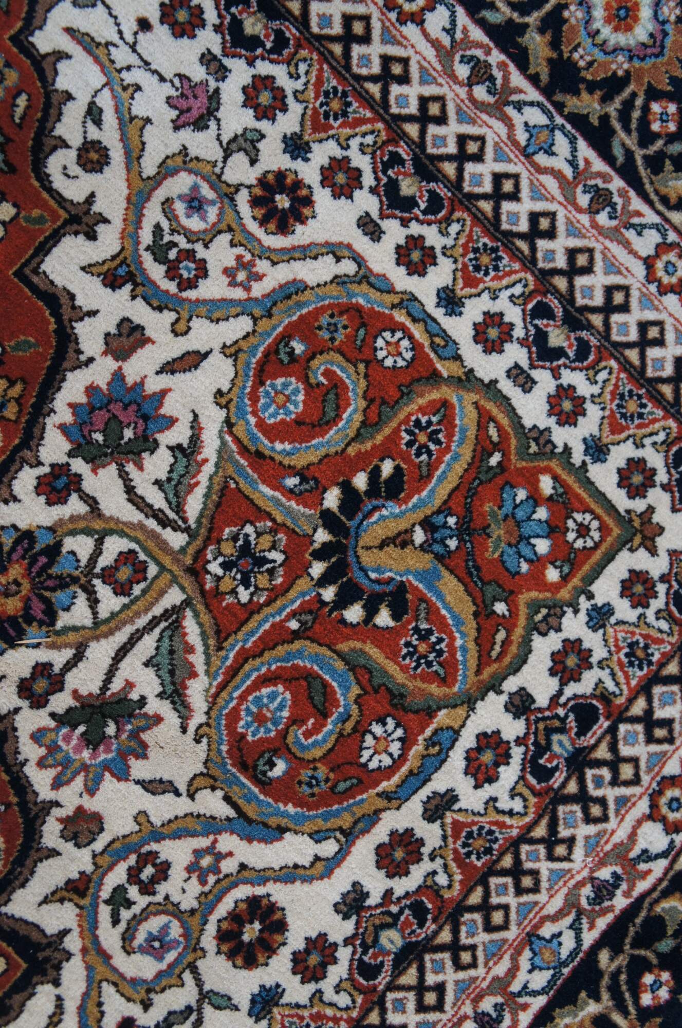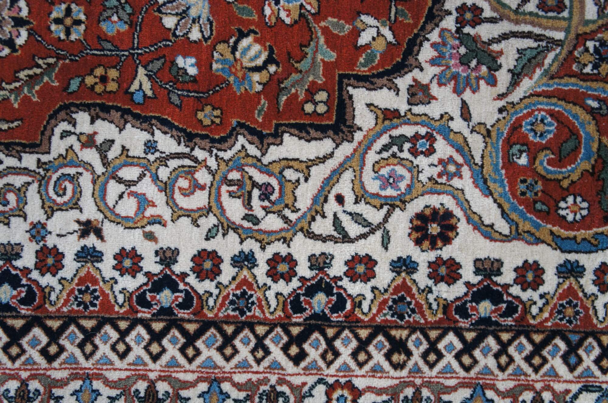 The traditional design for Tabriz carpets is ornamental patterns with dominant background colors: cream, red or navy blue. Tabriz rugs are celebrated for their diverse and intricate patterns, which can range from elaborate floral motifs and central medallions to geometric designs inspired by the rich cultural heritage.